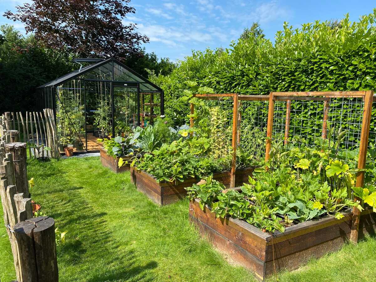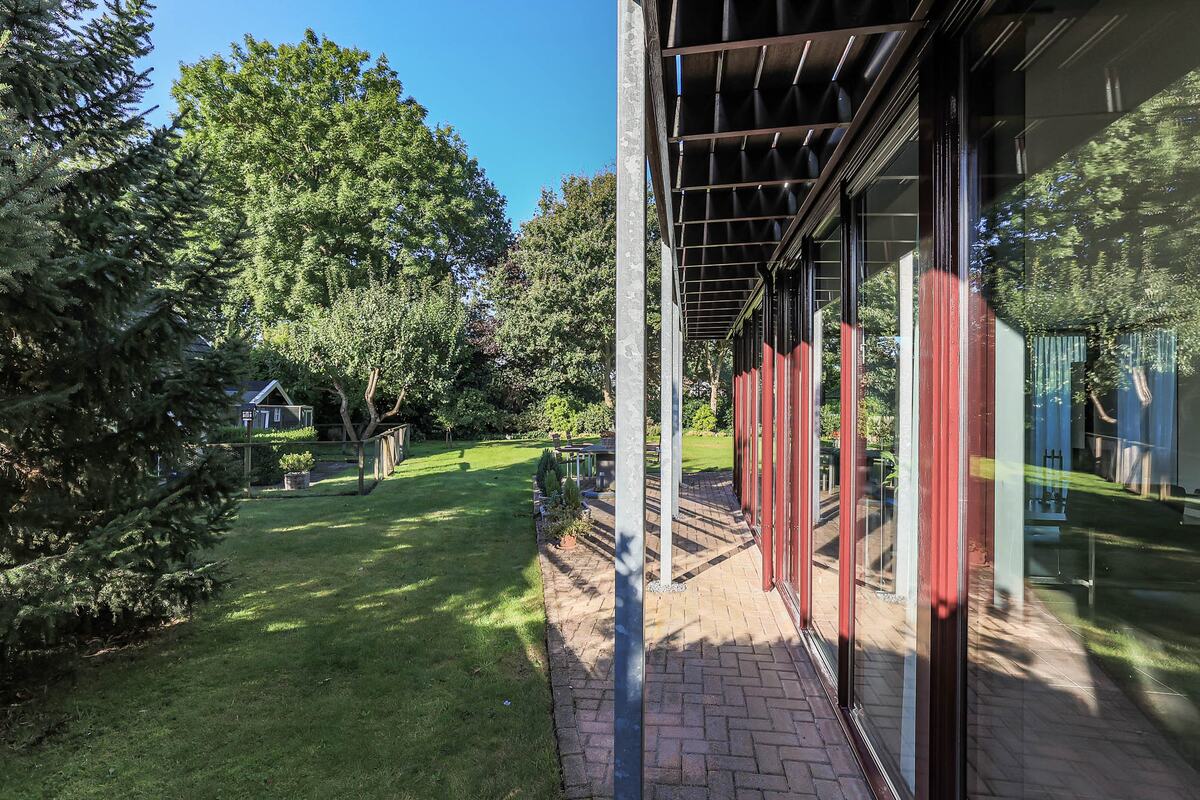 De voortuin bestaat uit een grote oprit (voor 3 auto's) en via een deur is de achtertuin te bereiken. Heerlijk omsloten door grote bomen, waardoor veel privacy. De kippetjes kunnen hier heerlijk scharrelen. Door de grote kavel en rondom lopende tuin is er altijd wel een plek met zon of juist schaduw. Een moestuin met kas maakt het geheel af. Hier is het heerlijk tot rust komen. De grote (31 m2) en fraai vormgegeven vrijstaande garage past perfect in dit plaatje. Geïsoleerd en met elektrisch bedienbare deur. Aan de garage een handige berging voor de tuinspullen van 2 m2.