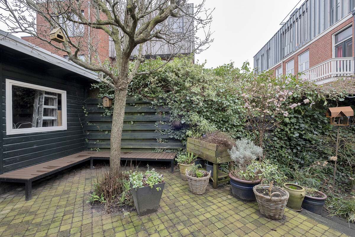 Heerlijk besloten achtertuin. Ligging op het noordwesten maar door de diepte (ca. 10 meter) ook zonnig. Via de grote houten berging van maar liefst 21 m2 is een handige achterom te bereiken.