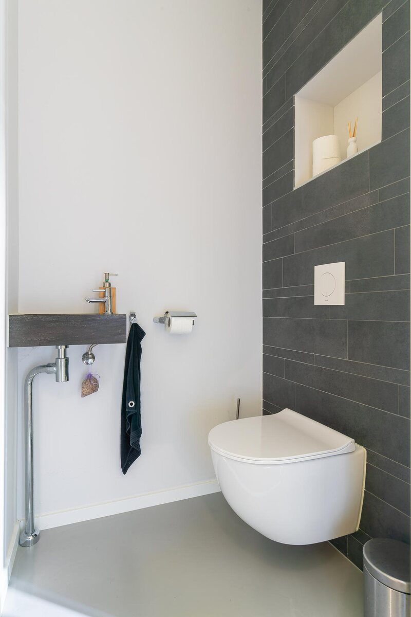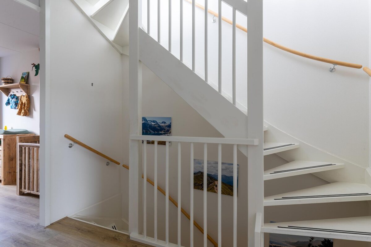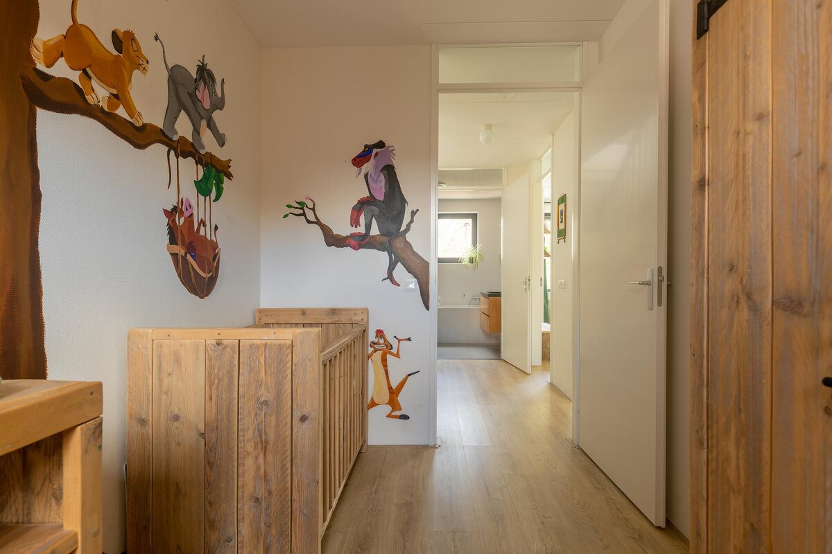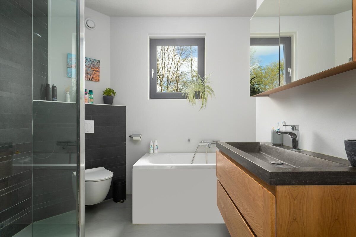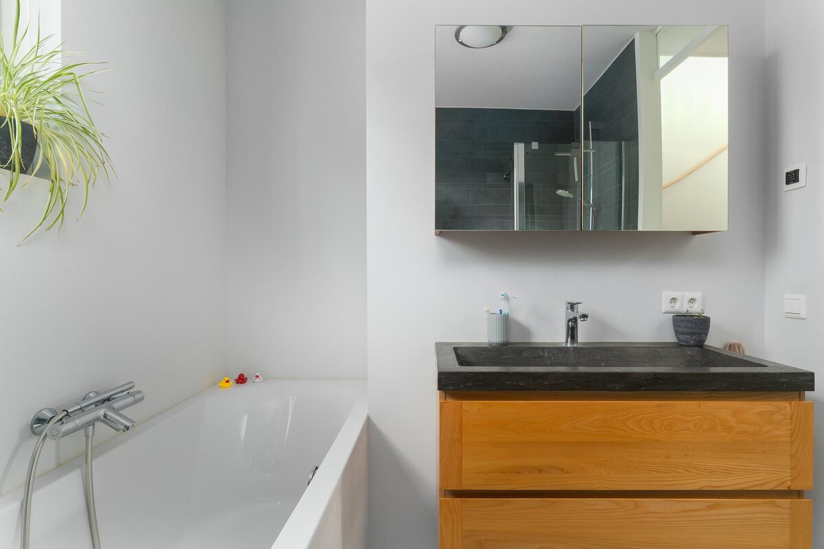Verdieping: ruime overloop.Drie slaapkamers van 8, 11 en 17 m2, allen voorzien van laminaatvloer. De badkamer is modern en voorzien van ligbad, inloopdouche, tweede toilet, wastafelmeubel, vloerverwarming en een handdoekradiator.