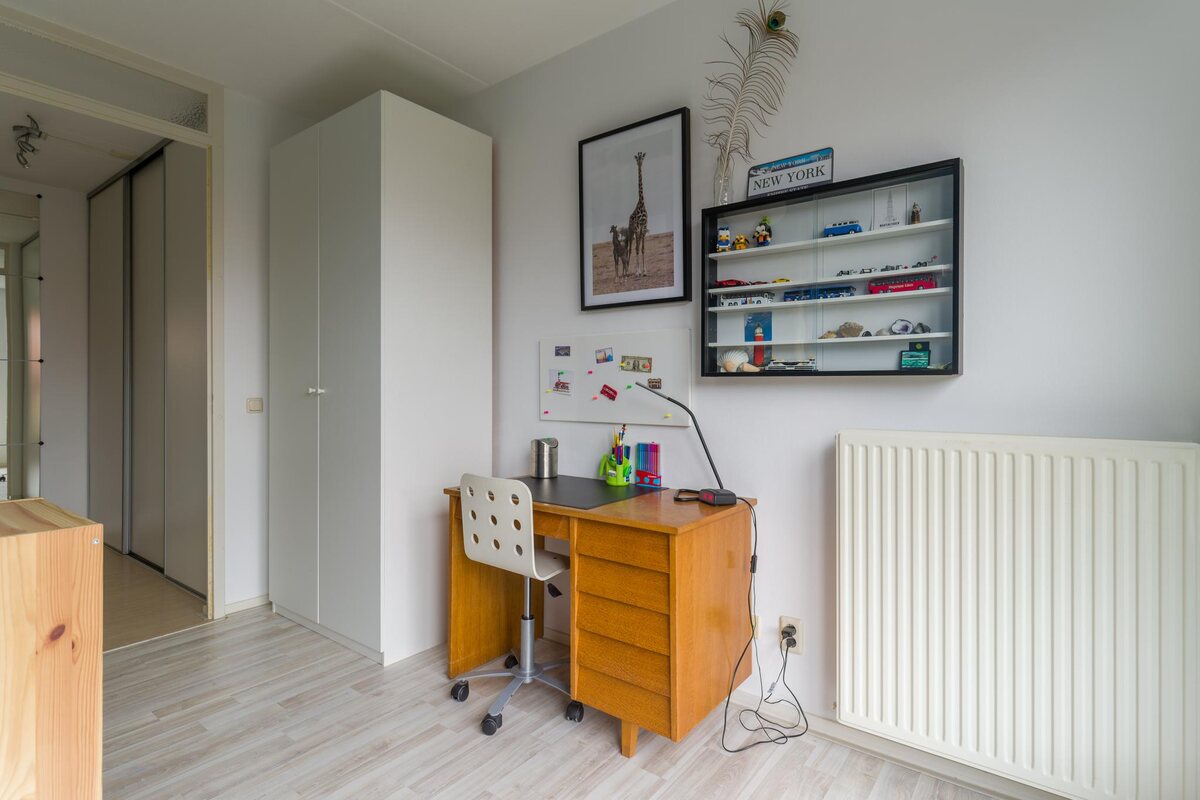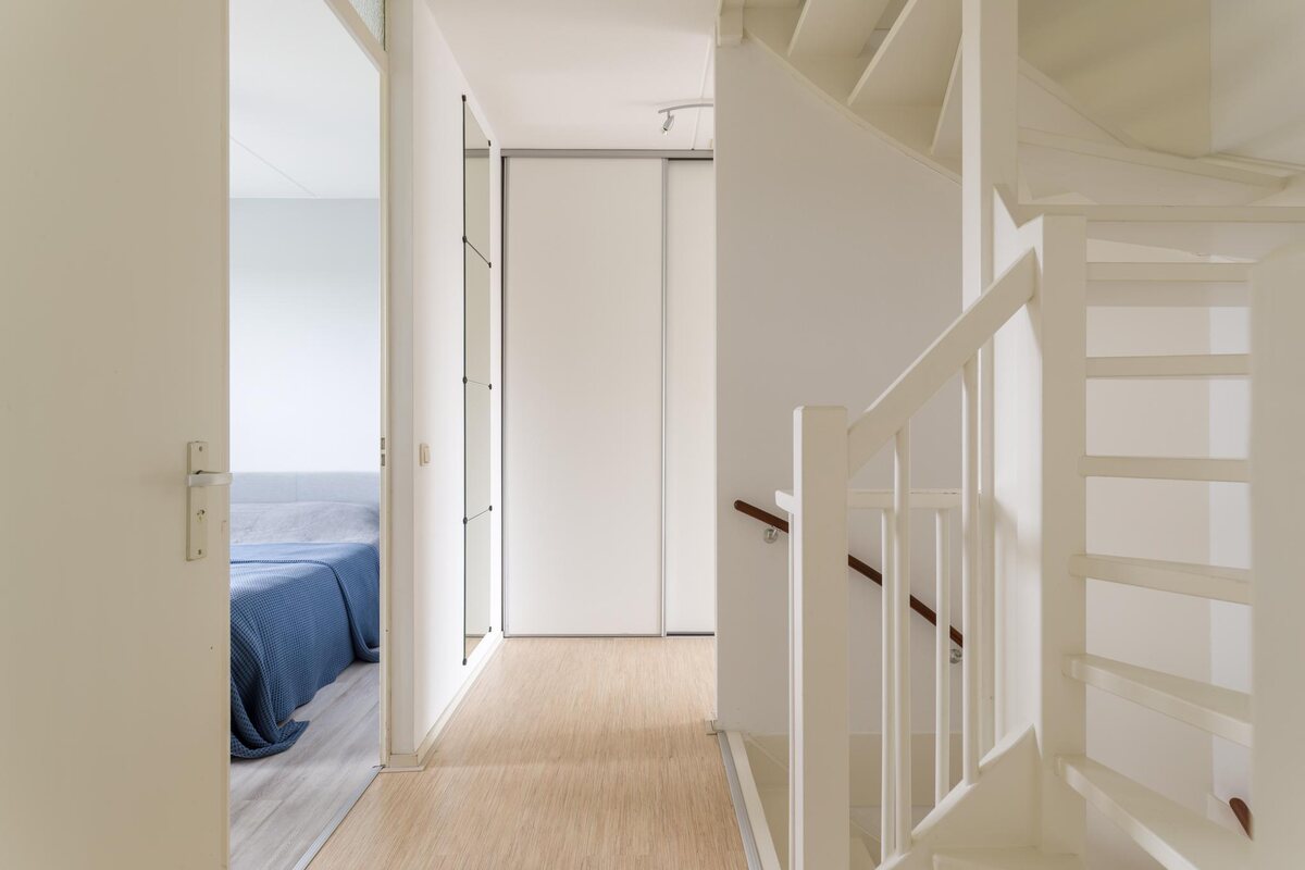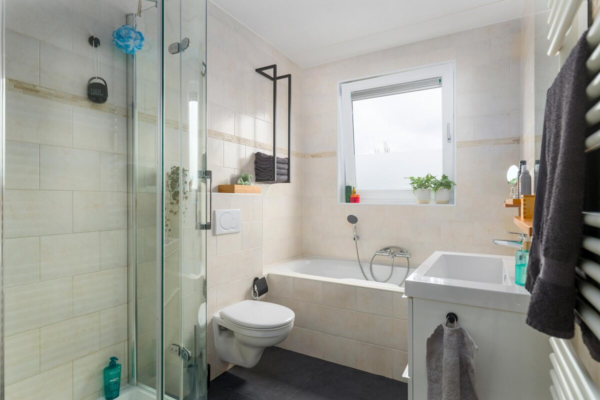 Eerste verdieping (vaste kastenwand met wasmachine en wasdroger aansluiting).Drie slaapkamers van ca. 8, 9 en 12m², allen voorzien van laminaat.Moderne badkamer (ca. 5,5 m2) met douche, ligbad, wastafelmeubel en tweede toilet.