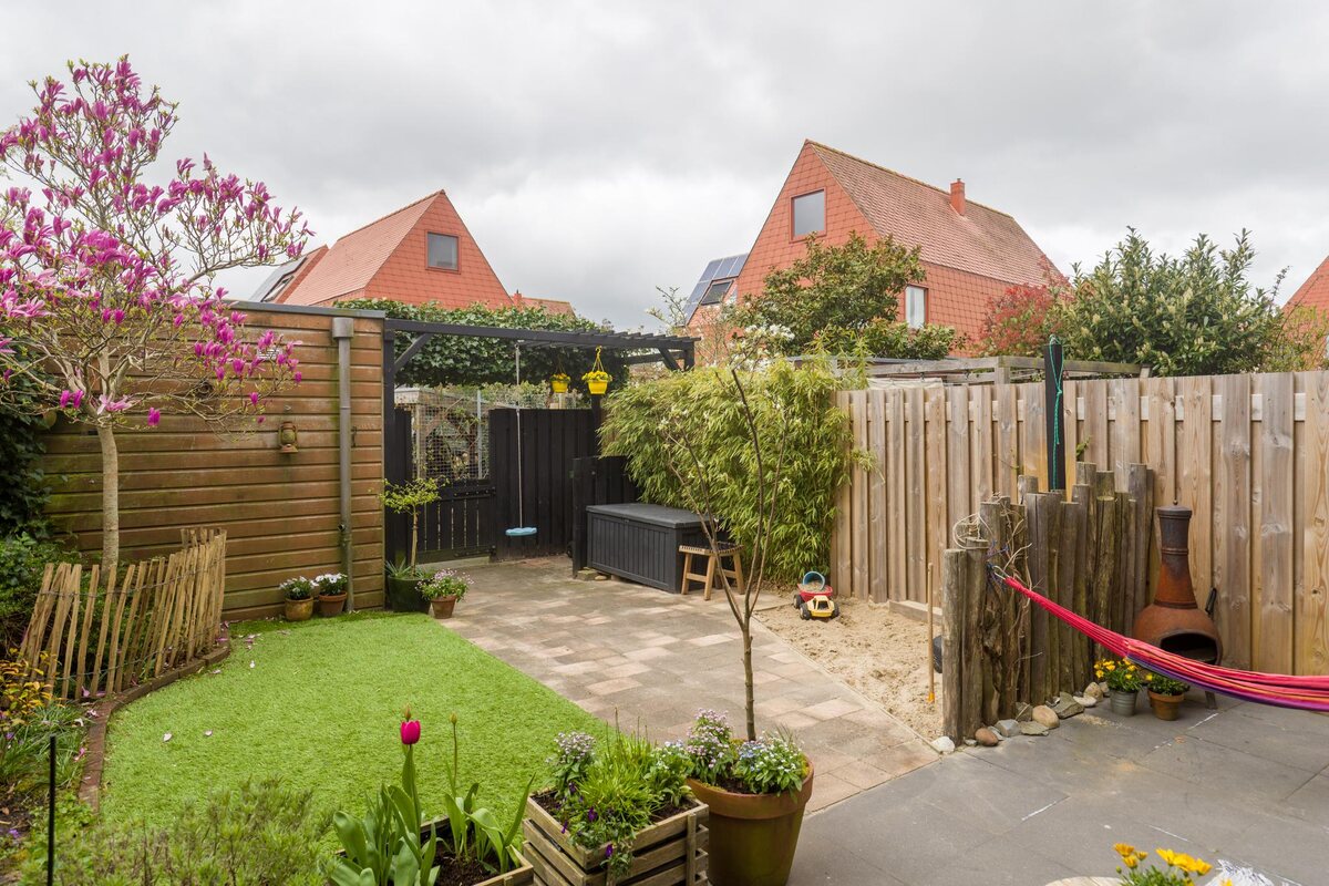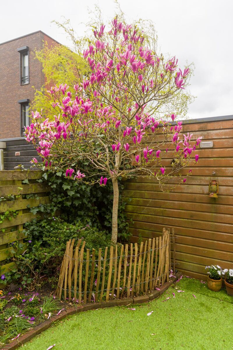 Heerlijke achtertuin (dik 9 meter diep en 5 meter breed) met vrijstaande houten berging (ca 6 m2 met elektra) en achterom.