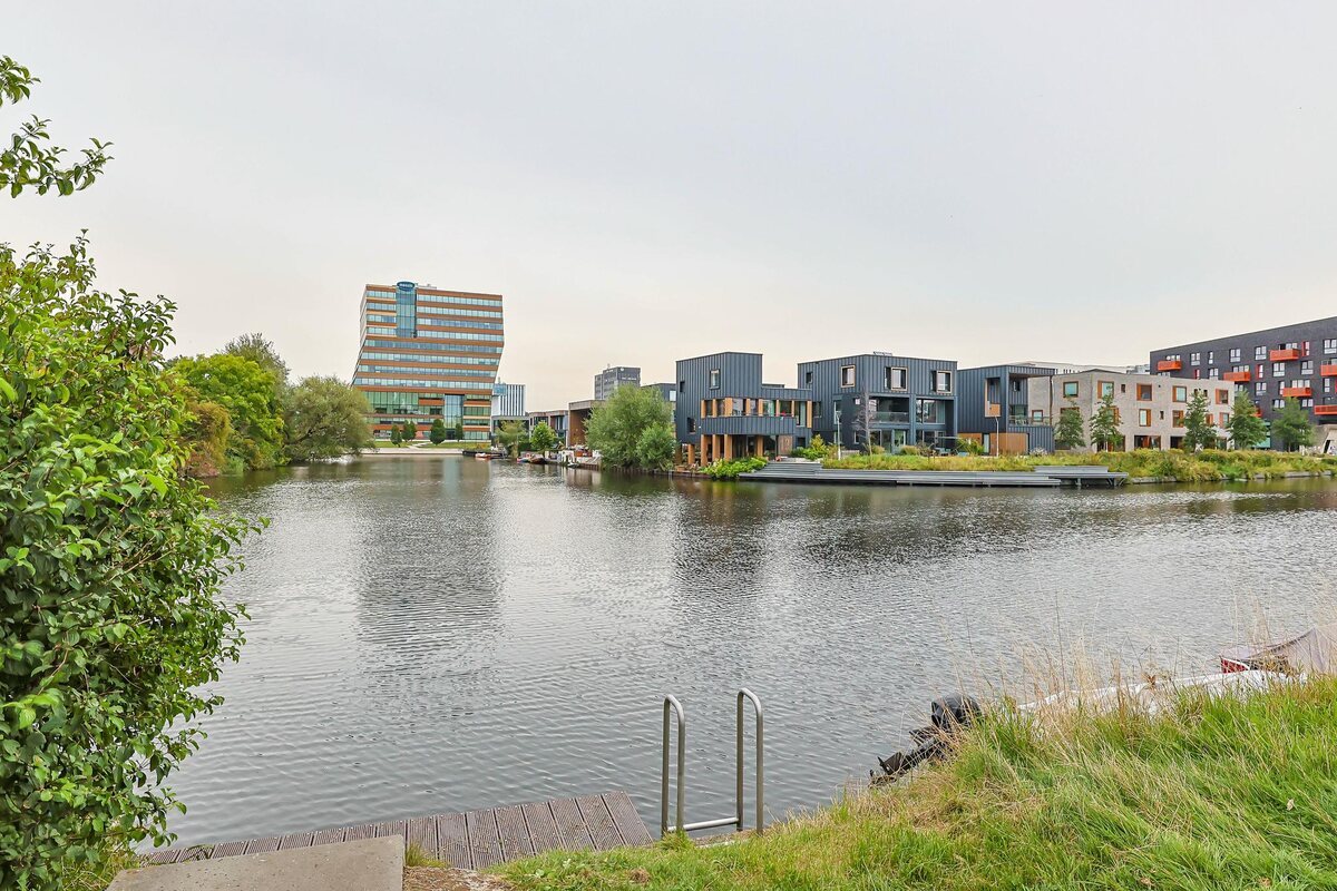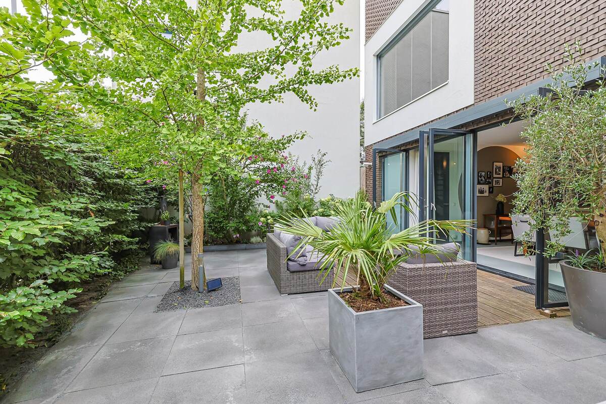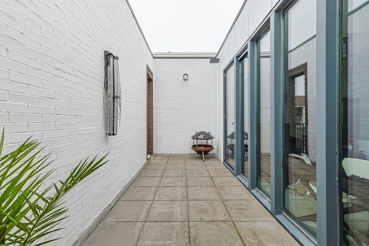 Begane grond: overdekte entree, hal met meterkast, chique wenteltrap naar de eerste verdieping en een heerlijk ruime leefkeuken van maar liefst 30 m2 (v.v. kookeiland en inbouwapparatuur). Via dubbele openslaande tuindeuren naar buiten: een heerlijk besloten tuin op het zuiden met meerdere zonneterrassen. Verder een smalle werkkamer met buitendeur (8 m2) met wastafel, een toilet en een berging/bijkeuken (4 m2). Eerste verdieping: overloop, toilet met fonteintje, royale woonkamer (ca. 40 m2) met hoog plafond en pantry, ruim balkon op het zuidwesten (8 m2) en een bijzondere, royale slaap-, werkkamer. Tweede verdieping: overloop, toilet met fonteintje, 2 slaapkamers (17 en 26 m2). De grootste (met dakterras/patio van 14 m2) kan eventueel opgedeeld worden in 2 slaapkamers. Voorts bevindt zich op de verdieping nog een verzorgde ruime badkamer (13 m2) met ligbad, inloopdouche, dubbele wastafel en wasruimte.