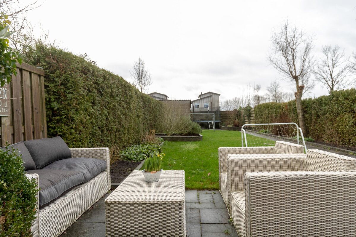 Diepe (ca. 28 m.!) tuin op zuid met terras, borders, gazon, vrijstaande berging en achterom.Voortuin: grotendeels verhard met ruimte voor drie auto's.
