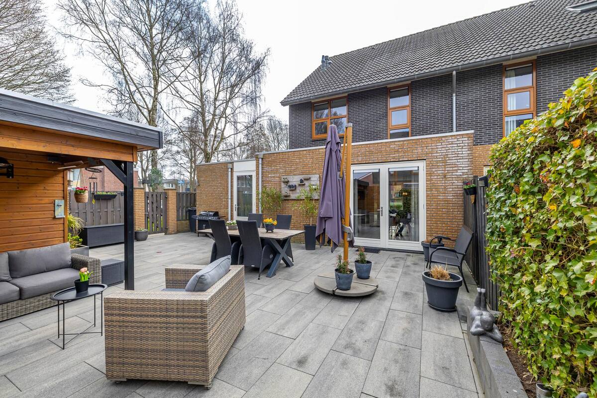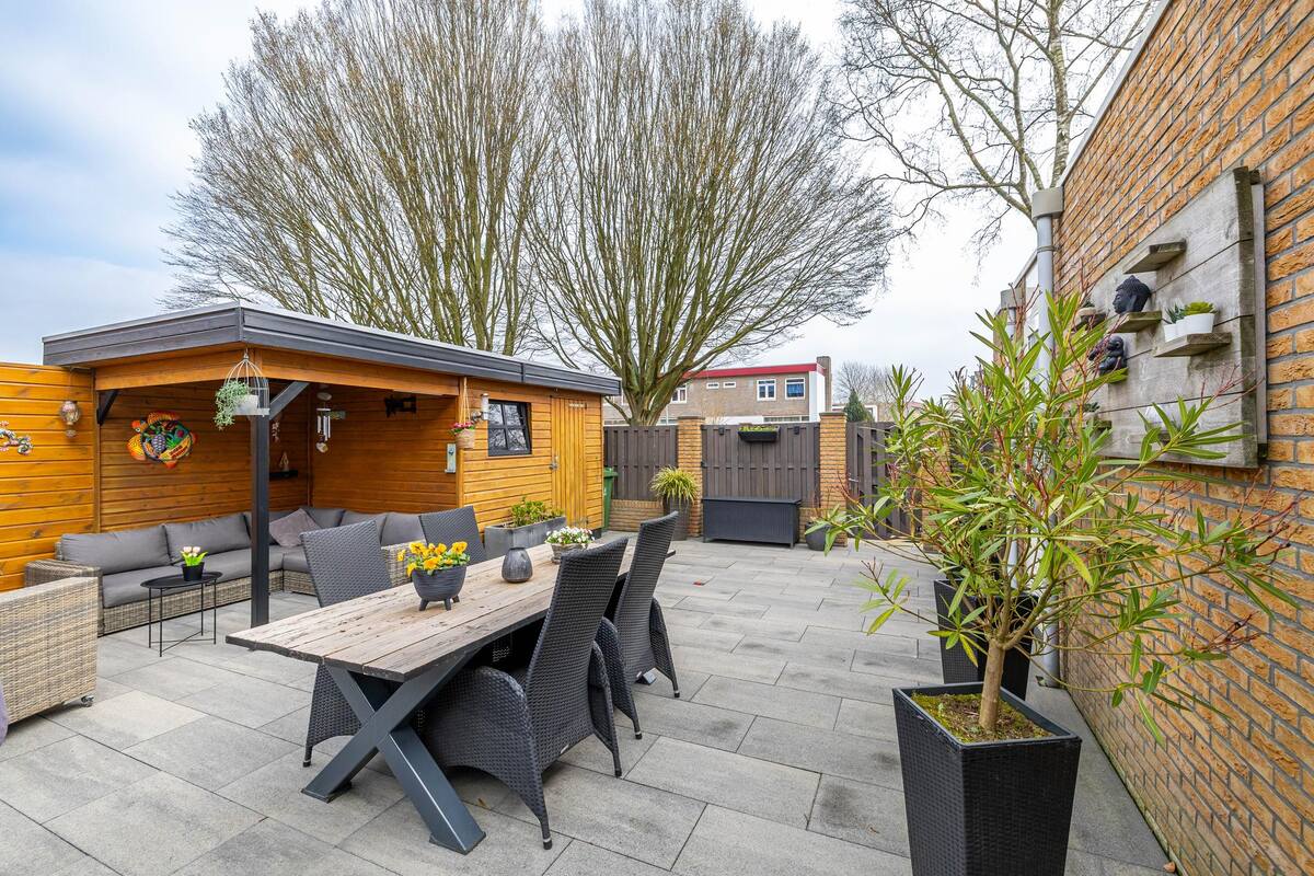 Het woonhuis heeft een voortuin, een royale oprit en een geheel omsloten achtertuin. De achtertuin is onderhoudsarm aangelegd en is bereikbaar langs de buitenzijde van het huis en heeft ook een achterom. De tuin ligt op het noordwesten (middag-avondzon). Verder een berging (7 m2) in de tuin met een fijne overkapping. Perceeloppervlakte is met 269 m2 lekker royaal te noemen.