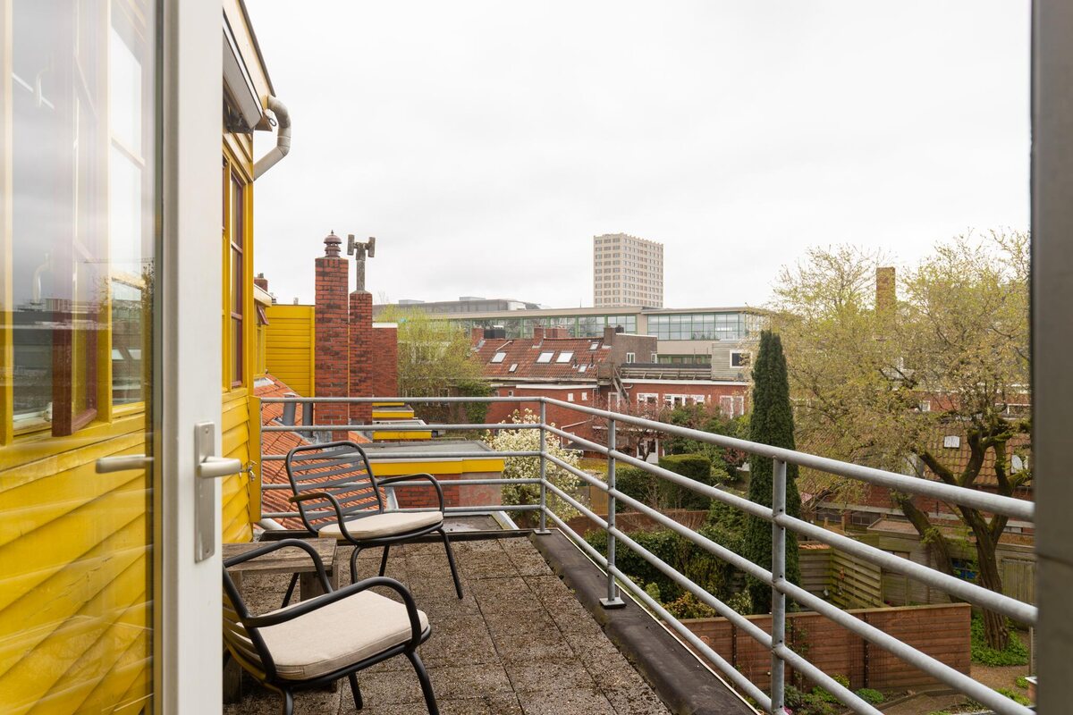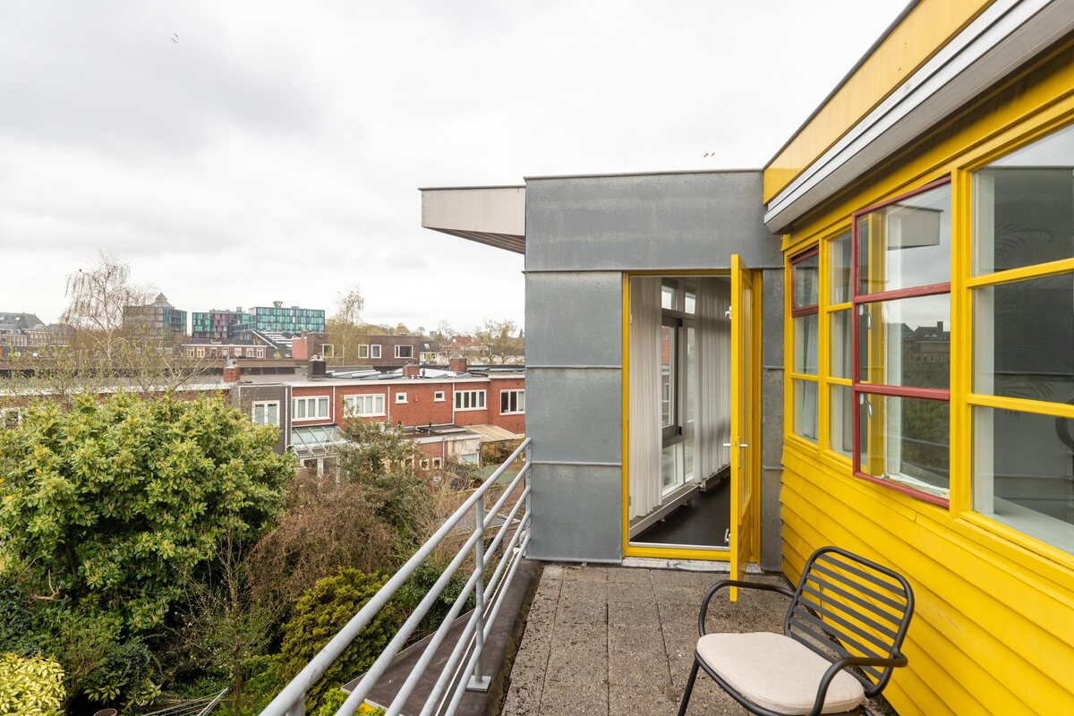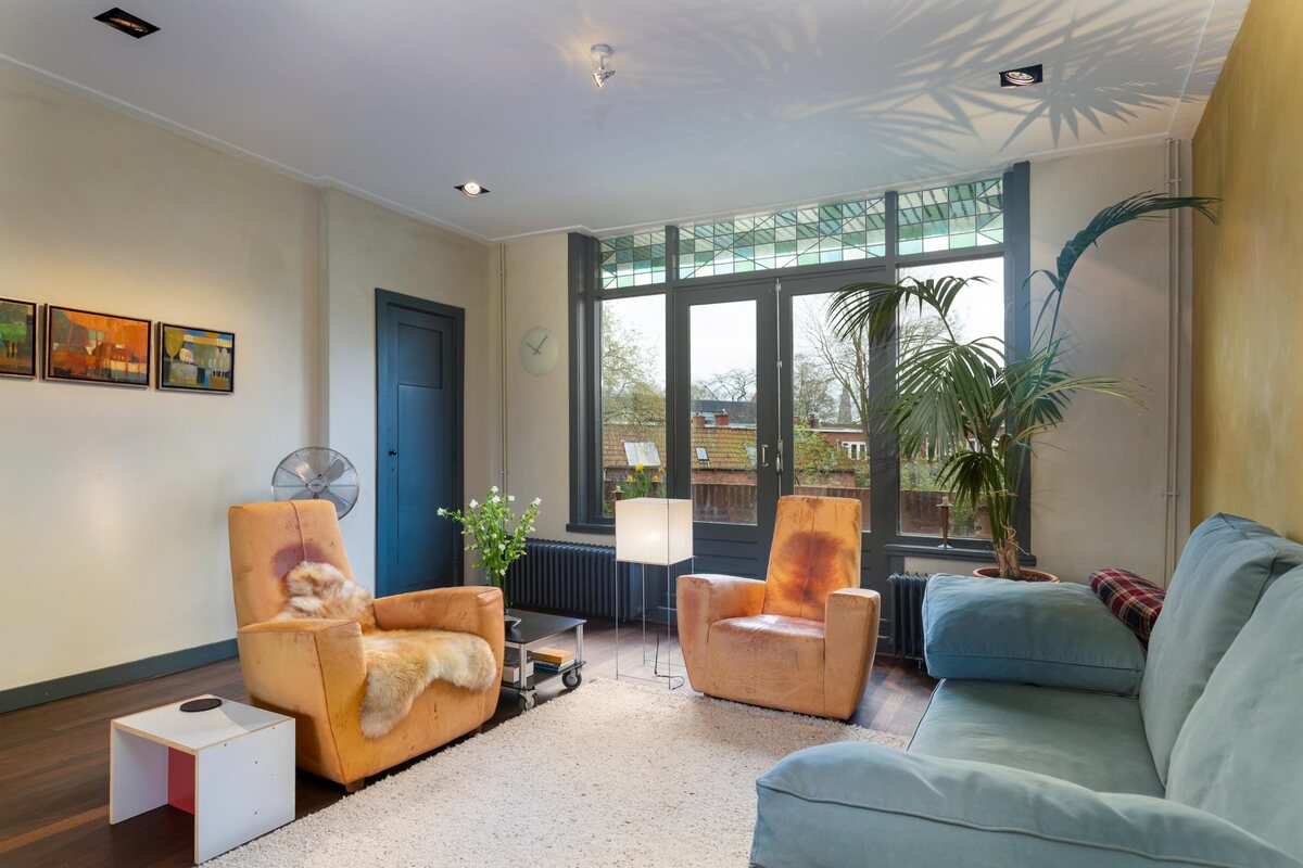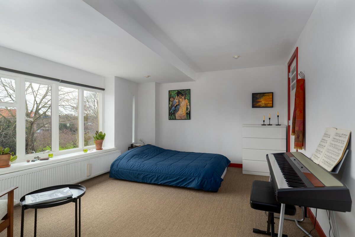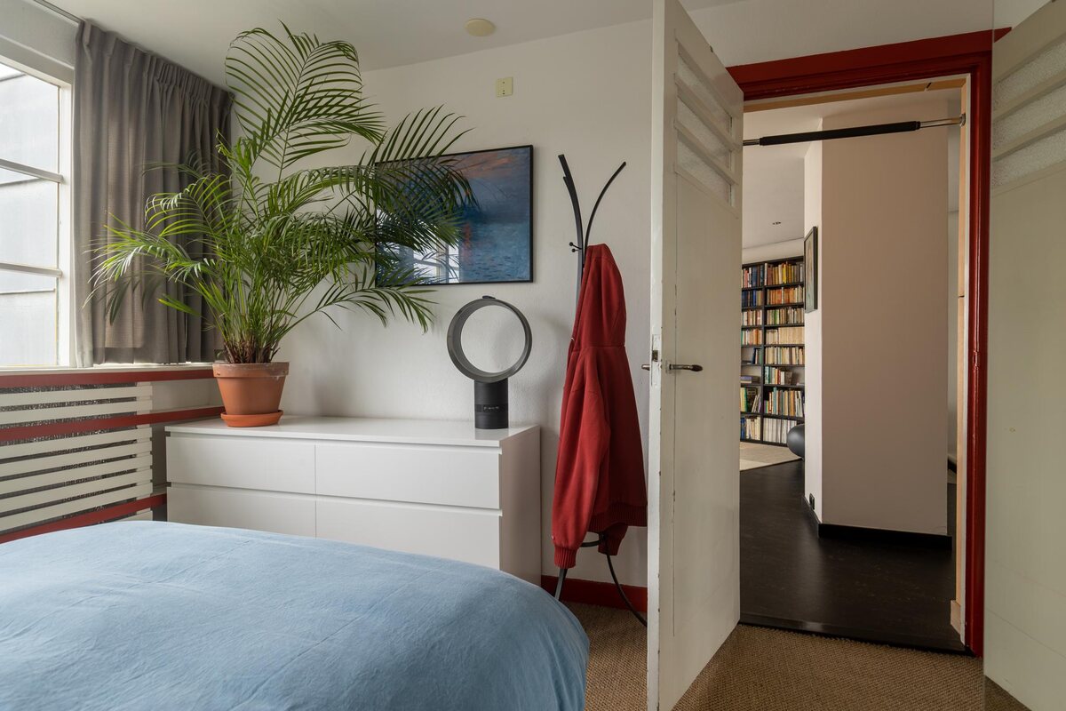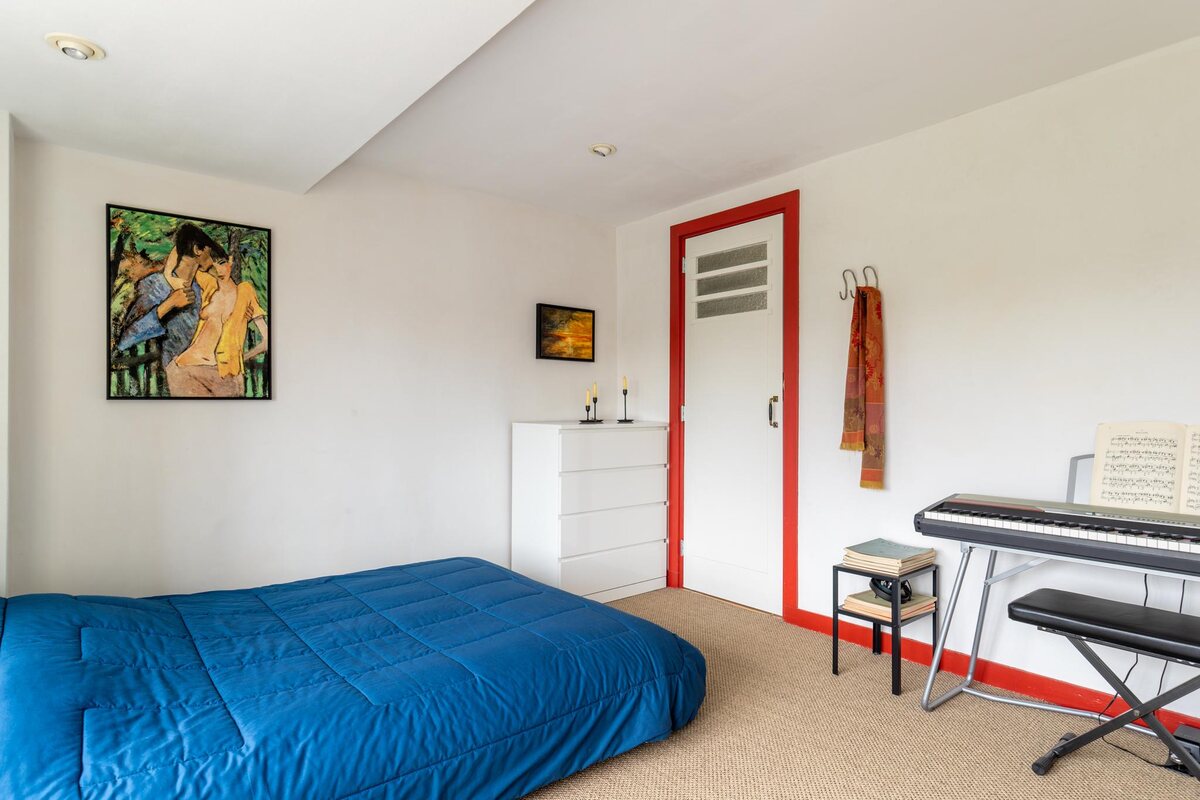 Verdieping: lichte studio (ca. 30 m2) met een glaspui van ca. 6 meter (!) die thans is ingericht als werkkamer/atelier. Hier zijn eventueel nog meer slaapkamers te realiseren. Loopdeur naar ruime (ca. 8 m2) balkon op zuid.Slaapkamer voorzijde (ca. 17 m2) met grote inloopkast (ca. 5 m2, wasmachine aansluiting en CV ketel).Slaapkamer achterzijde (ca. 12 m2).Nette badkamer (ca. 8 m2) met douchebad en een vaste wastafel.