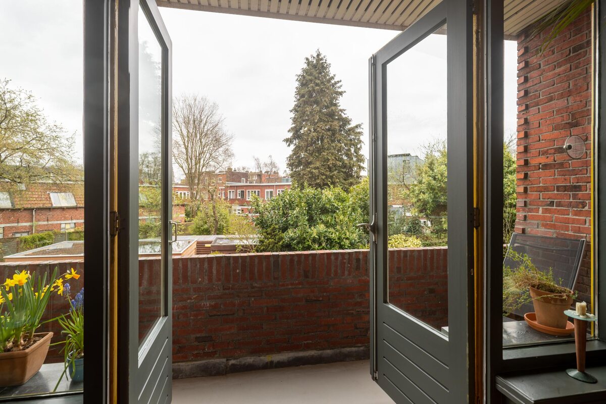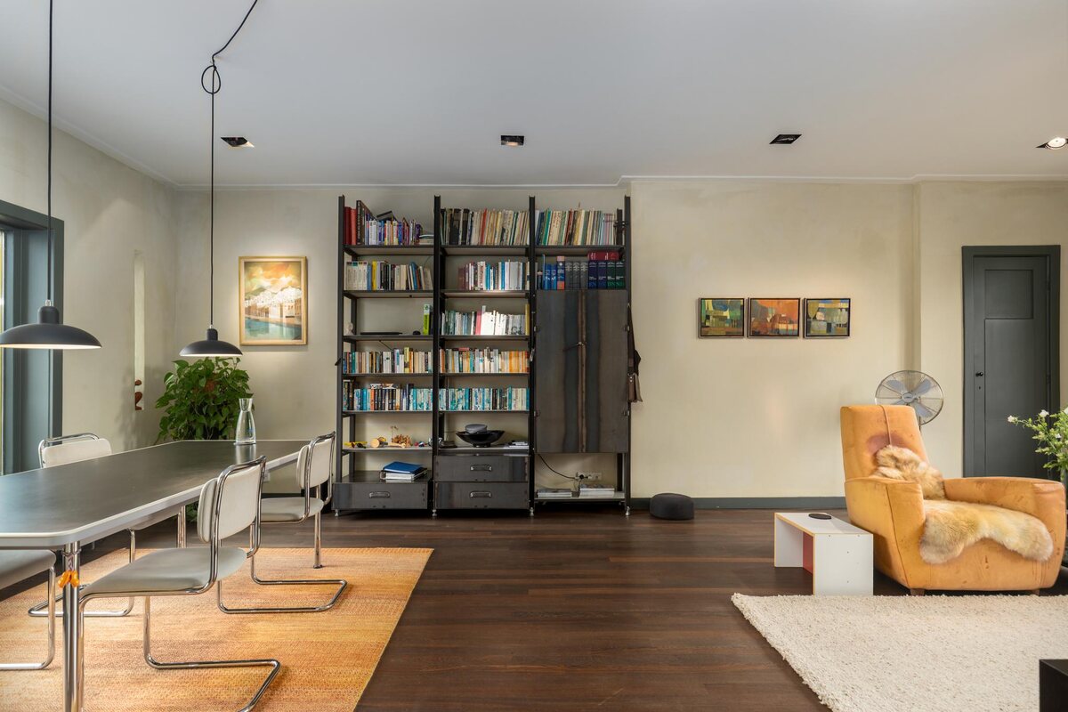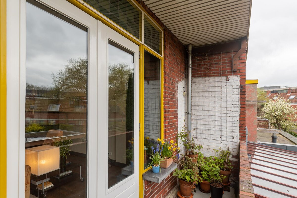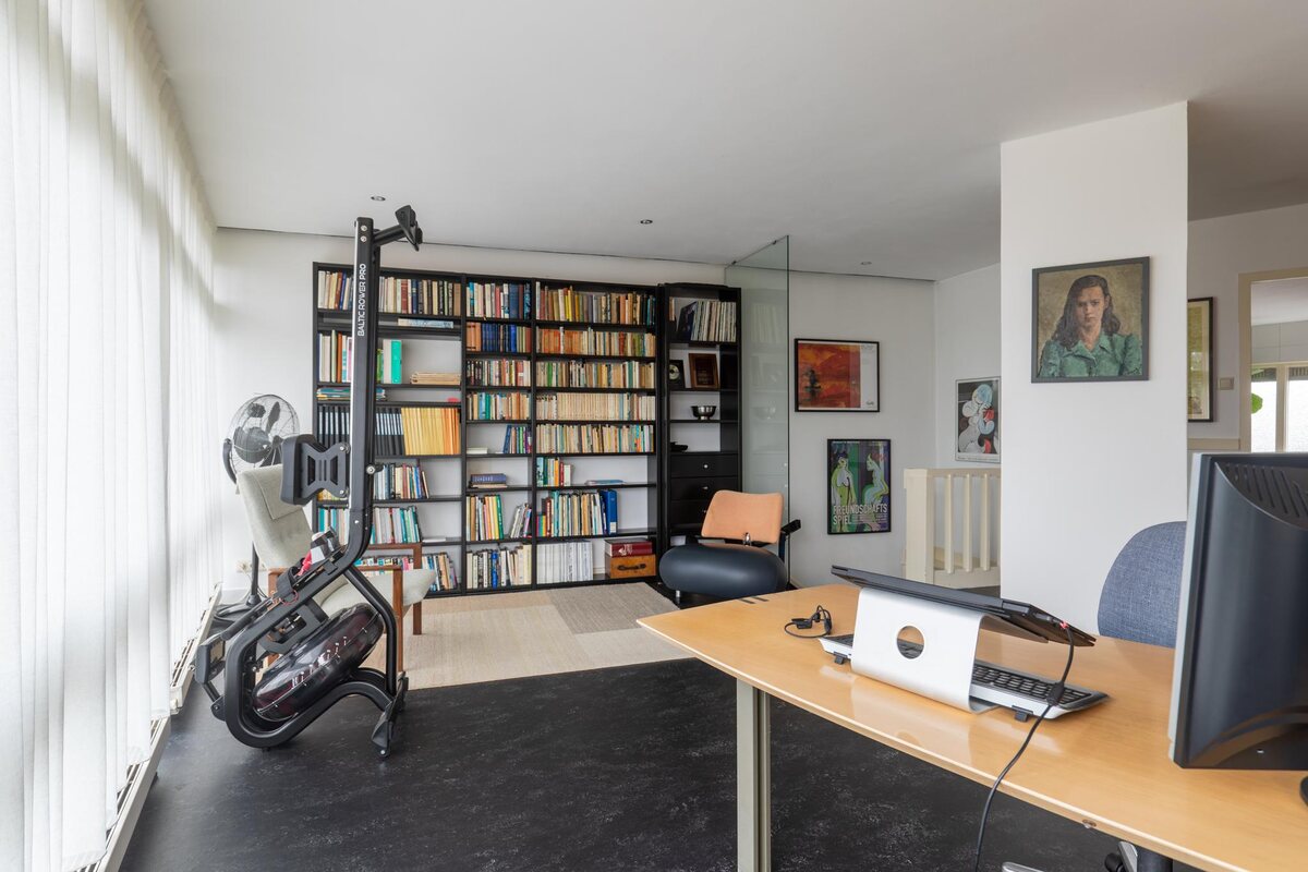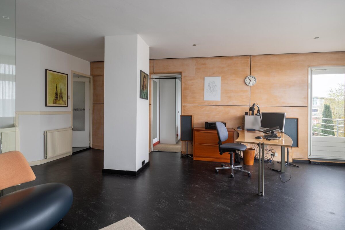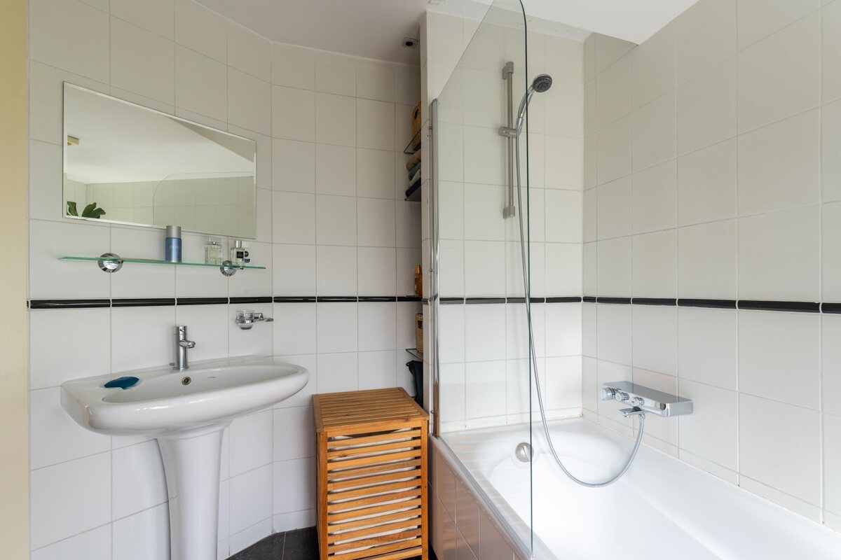 Verdieping: lichte studio (ca. 30 m2) met een glaspui van ca. 6 meter (!) die thans is ingericht als werkkamer/atelier. Hier zijn eventueel nog meer slaapkamers te realiseren. Loopdeur naar ruime (ca. 8 m2) balkon op zuid.Slaapkamer voorzijde (ca. 17 m2) met grote inloopkast (ca. 5 m2, wasmachine aansluiting en CV ketel).Slaapkamer achterzijde (ca. 12 m2).Nette badkamer (ca. 8 m2) met douchebad en een vaste wastafel.
