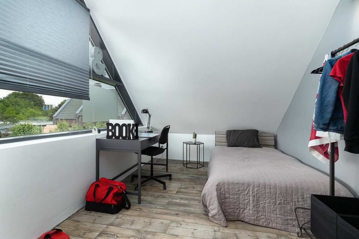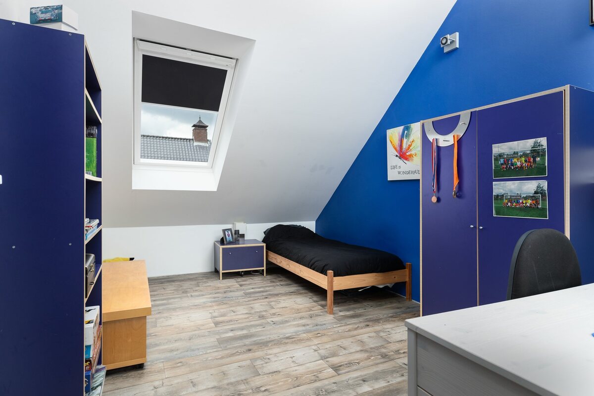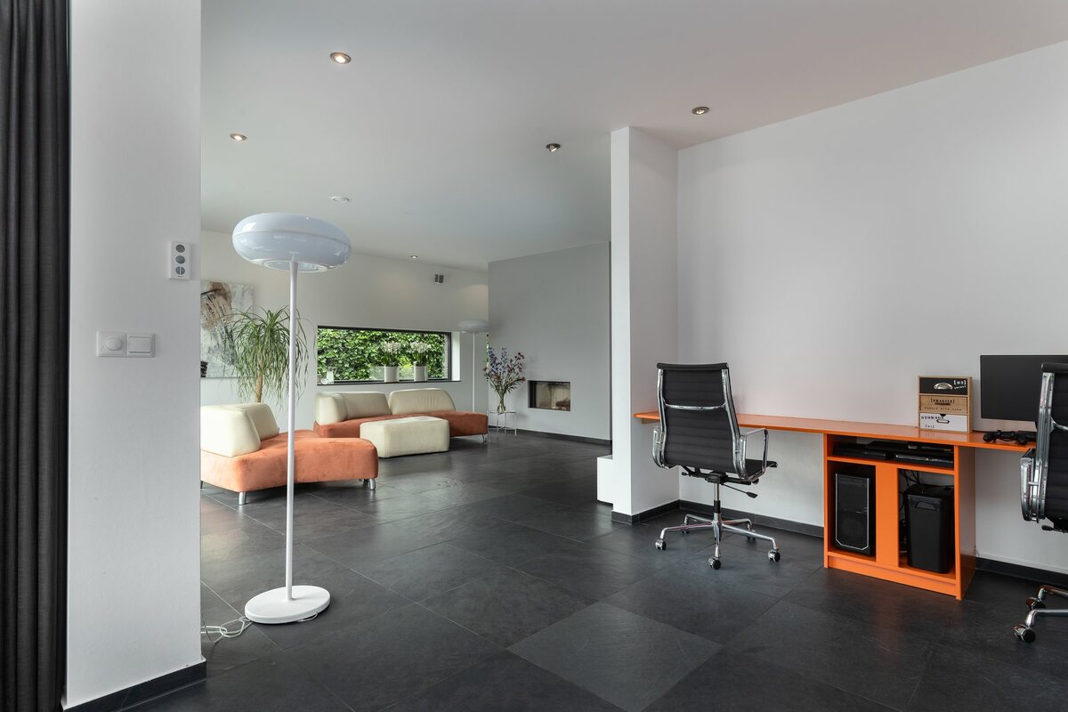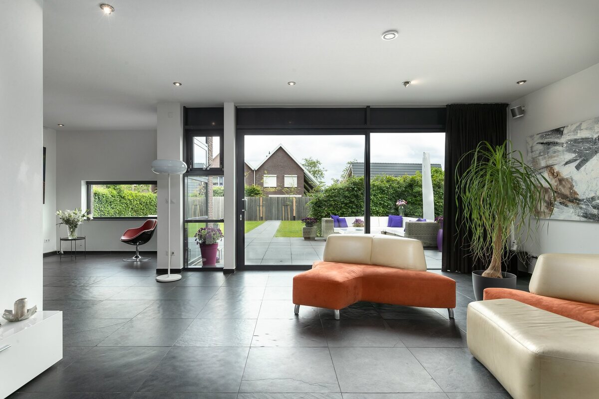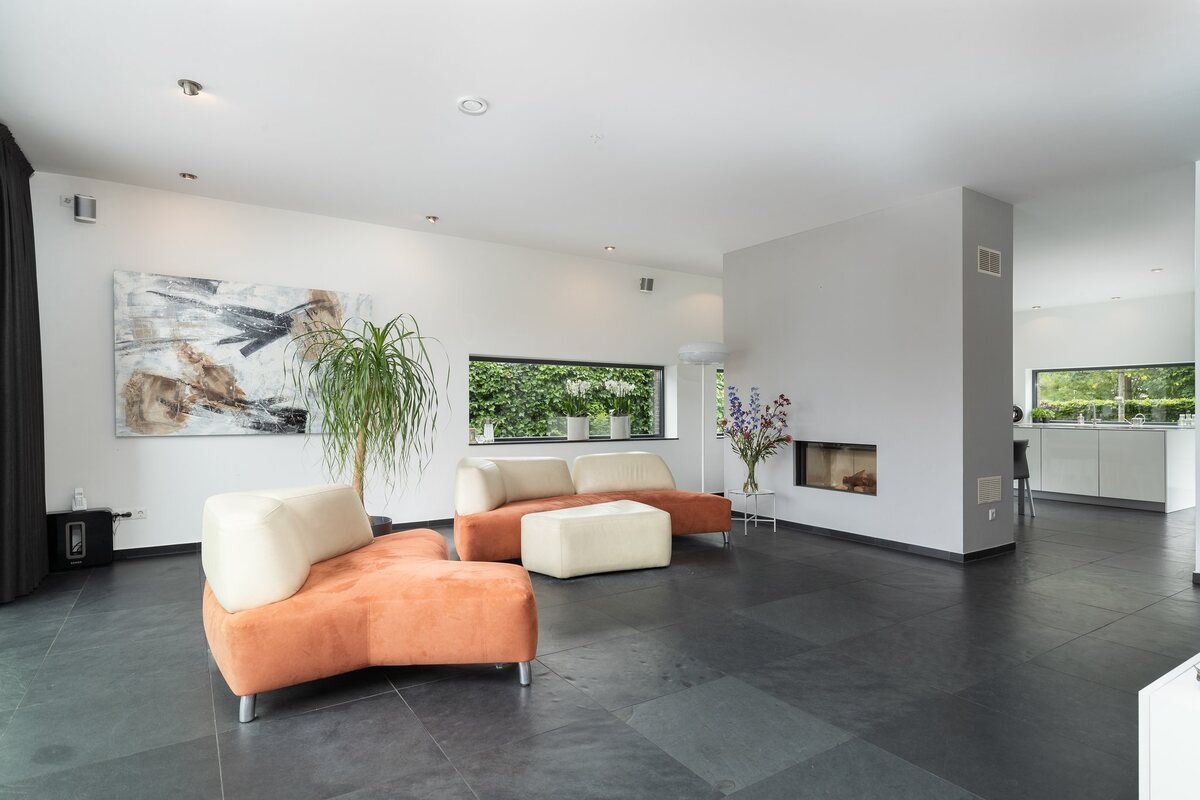 Begane grond: entree, lichte en royale hal (13 m2) met trap en toilet. Totale living van ca. 83 m2 met aan de voorzijde een luxe keuken (28 m2) met kookeiland, uiteraard v.v. de benodigde inbouwapparatuur. De keuken wordt deels middels een open haard-opstelling fraai gescheiden van de woonkamer (37 m2). De open haard maakt het loungen hier extra aantrekkelijk. Ook in deze ruimte is een schuifpui naar het tuinterras. Aan de woonkamer grenst een (open) ruimte (18 m2) welke in de toekomst dienst kan doen als slaapkamer (badkamer is reeds aanwezig op de begane grond). Vanuit de woonkamer toegang tot de bijkeuken (6 m2), compacte badkamer (2 m2) en opbergkast (4 m2). De garage (34 m2) is via de bijkeuken bereikbaar. Deze is volledig geïsoleerd en heeft veel bergruimte (zolder).Eerste verdieping: mooie vide, lange overloop, separaat toilet en 5 slaapkamers (19, 11, 10, 9 en 9 m2). Een tweede badkamer (8 m2)completeert het geheel.Tweede verdieping: vlizotrap, bergzolder.