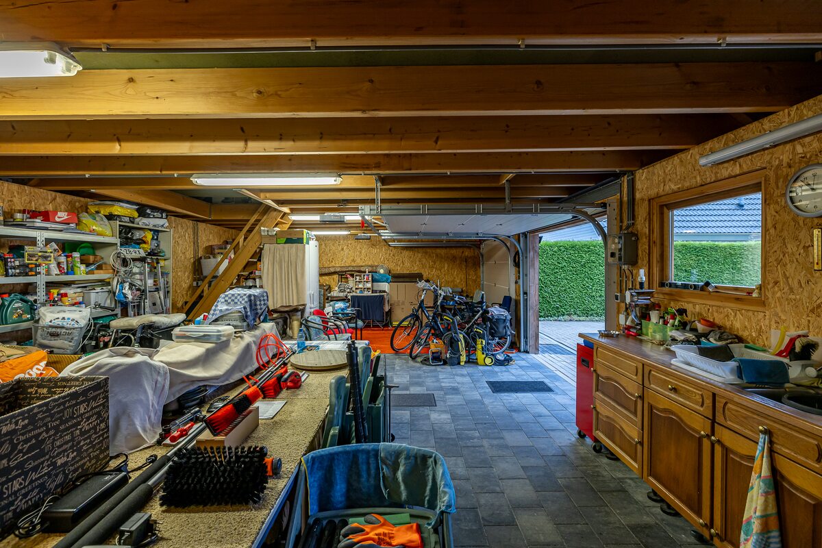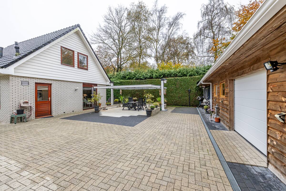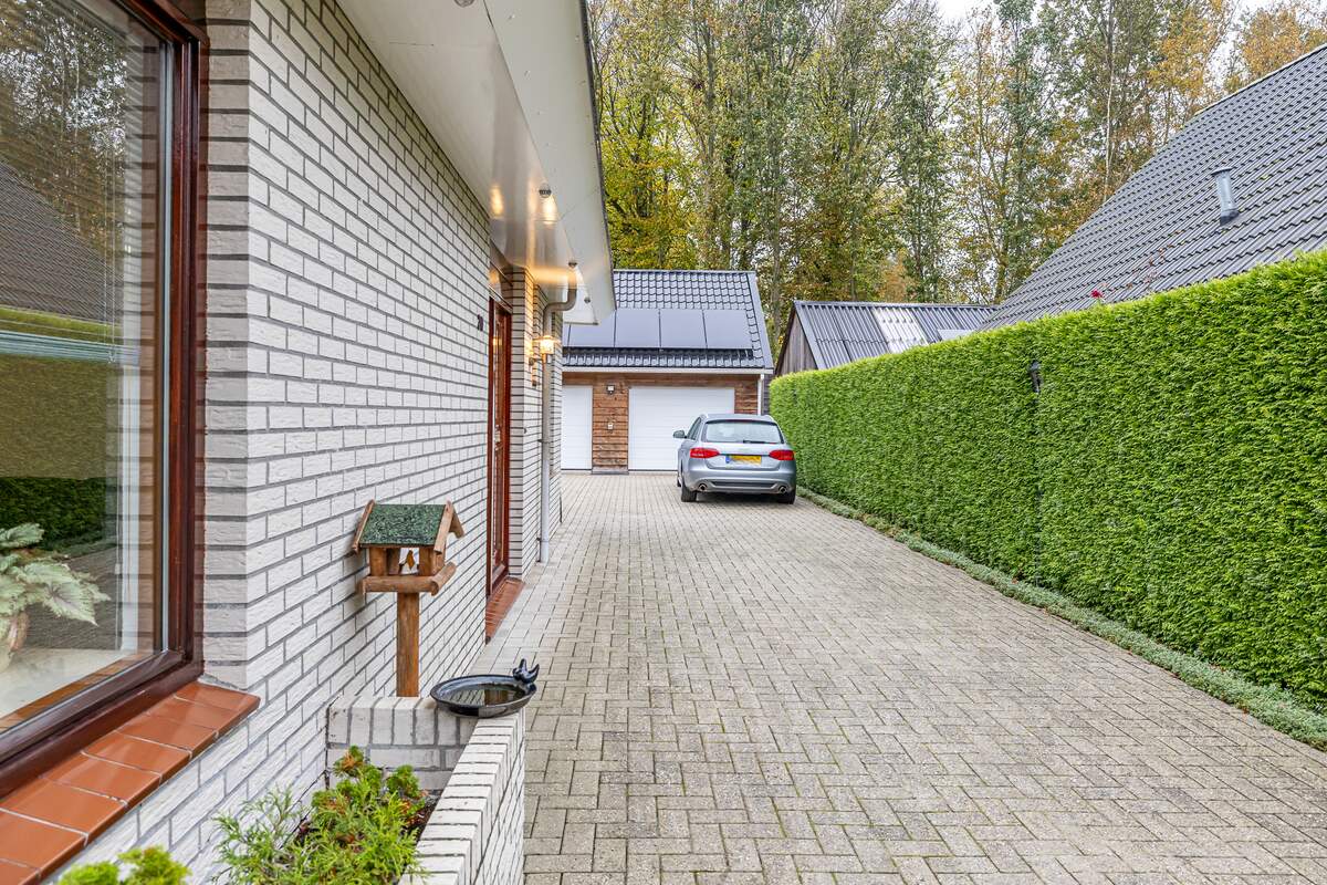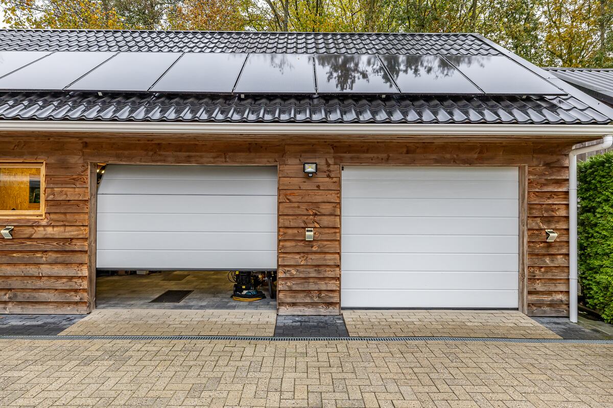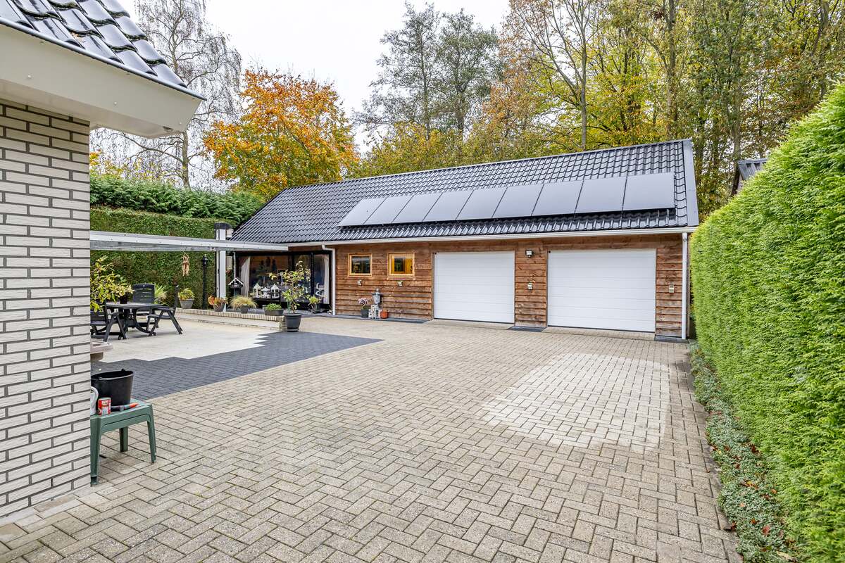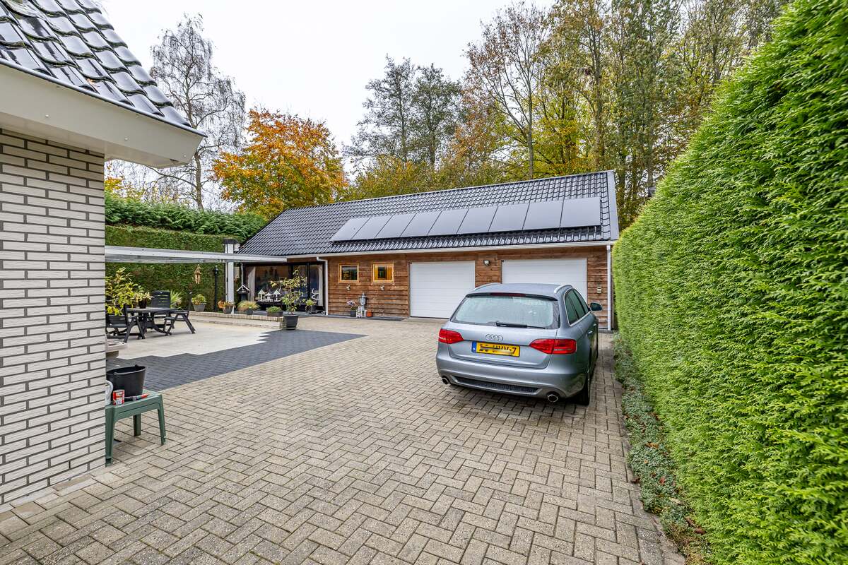 Er is een splinternieuwe garage (85 m2) gebouwd met parkeermogelijkheid voor 2 auto's met elektrische roldeuren (afstandsbediening) en in de garage ook nog een technische ruimte en winter garden overdekt. Er is over de gehele lengte van de garage opslagmogelijkheid van 15 meter lang en 6 meter breed. Ook zijn er nooit parkeer problemen omdat langs het huis een grote oprit aanwezig is, tevens ook voor het huis oprit. Je hebt altijd veilig gevoel als je het sierhek afsluit. Het huis is voorzien van de nieuwste type zonnepanelen (hoge kwaliteit stroom opbrengst) met elk een eigen micro omvormer (als een paneel stopt werken de andere gewoon door). Hierdoor bespaar je veel op de vaste energie kosten.
