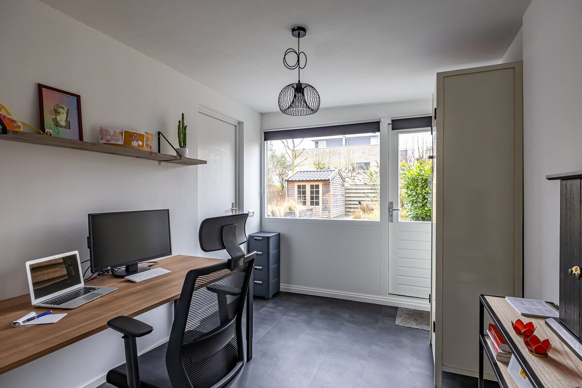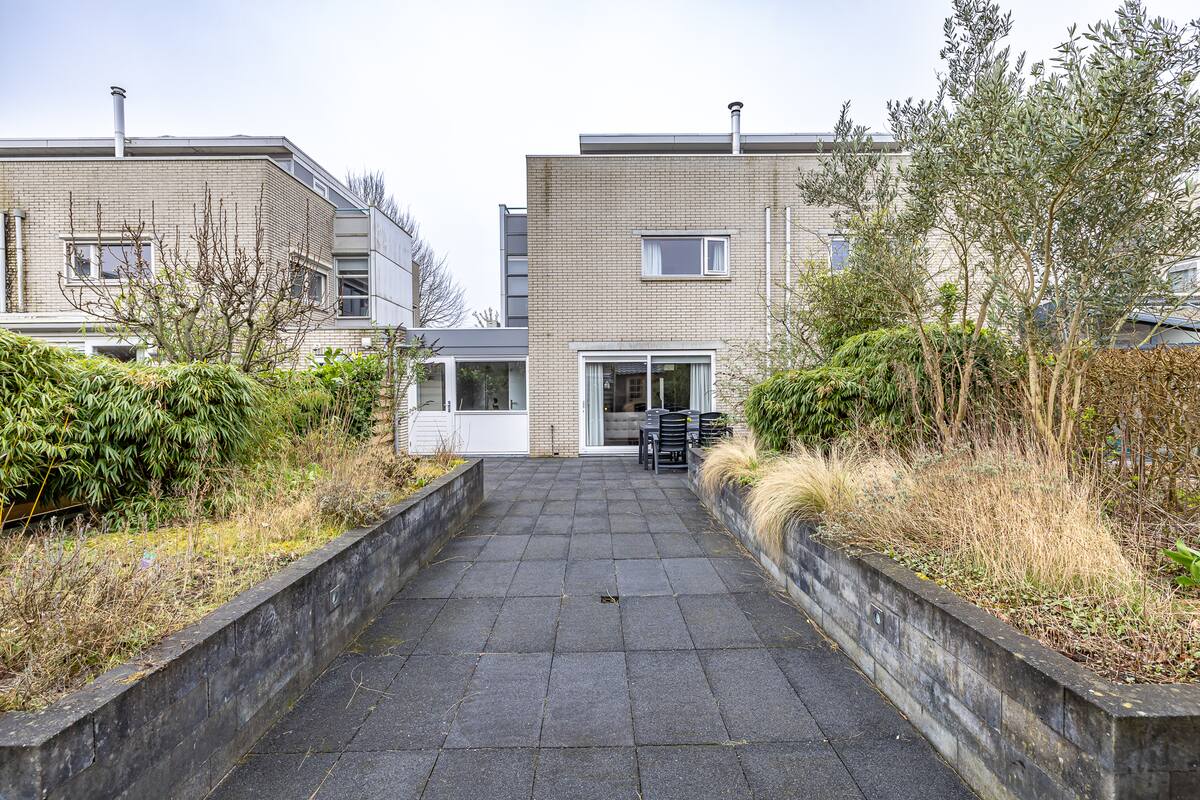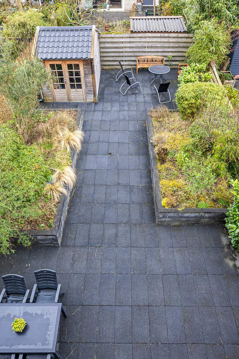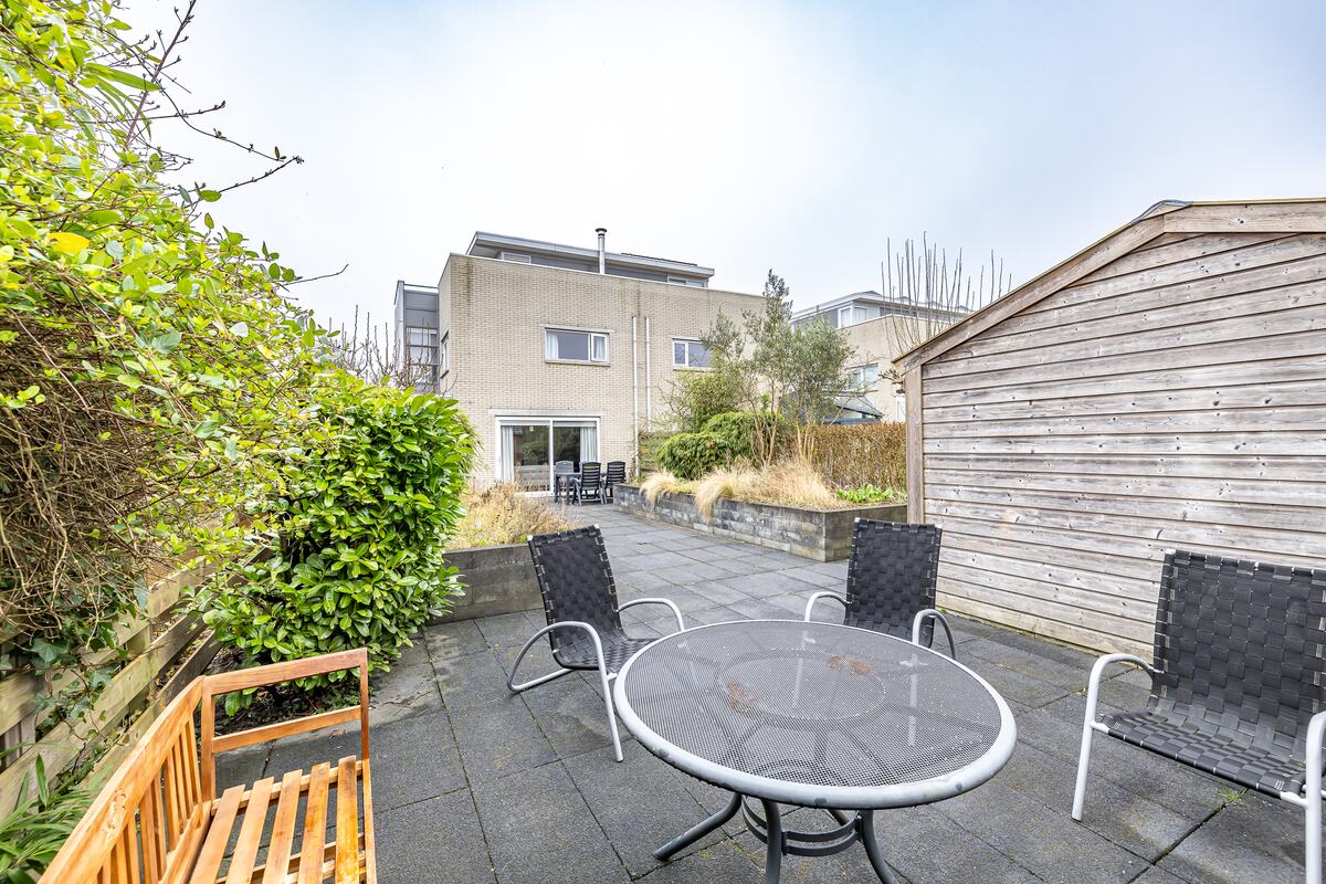 De royale achtertuin ligt op het Noorden en door de diepte heb je hier altijd zon en schaduw. Geniet hier van de rust en sereniteit, perfect om te ontspannen na een drukke dag of om buiten te borrelen of dineren tijdens warme zomeravonden. Het houten tuinhuis is te gebruiken voor extra opslag van de tuinspullen. Aan de voorzijde heeft de woning een voortuin en eigen oprit met plek voor een auto.