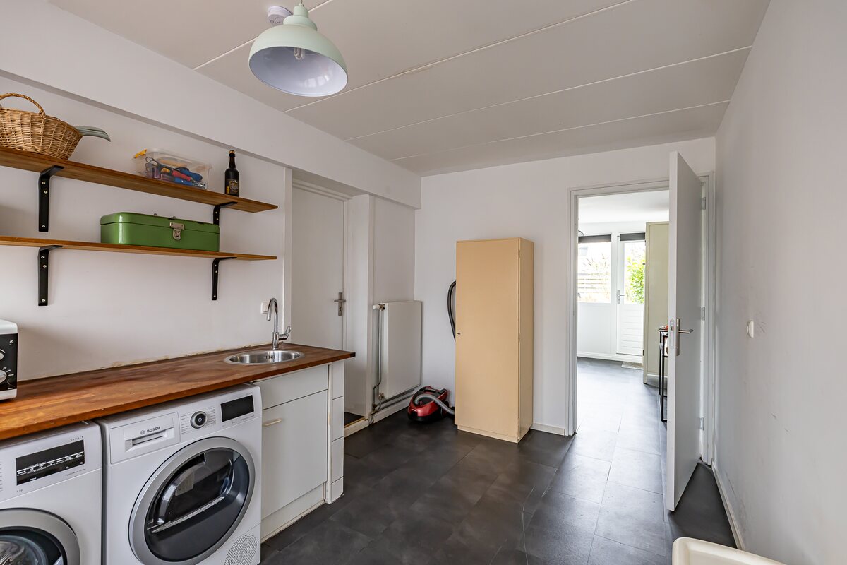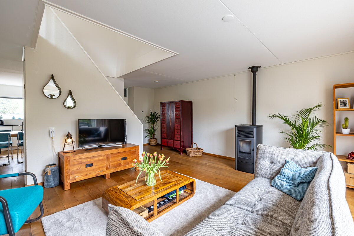 Begane grond: entree/hal met meterkast en modern toilet. De ruime living is 43 m² en is verdeeld in een woonkamer en woonkeuken. De pellet kachel in de woonkamer zorgt voor een gezellige, warme sfeer en de grote schuifpui is ideaal voor de verbinding met de tuin. De moderne keuken is strak afgewerkt en is voorzien van inbouwapparatuur. Met de trapopgang en vide in het midden van de woonkamer naar de eerste verdieping krijgt het geheel een bijzondere en unieke uitstraling. De voormalige garage is in gebruik als praktische bijkeuken, berging en fietsenstalling. Hier bevindt zich de wasmachine-aansluiting en een wastafel. De garage/bijkeuken is aan de achterzijde uitgebouwd, waardoor er nog een extra kamer is gecreëerd van 10 m² die goed te gebruiken is als kantoor/werkkamer of als speelkamer. Vanuit deze kamer heb je tevens toegang tot de woonkamer en de tuin.