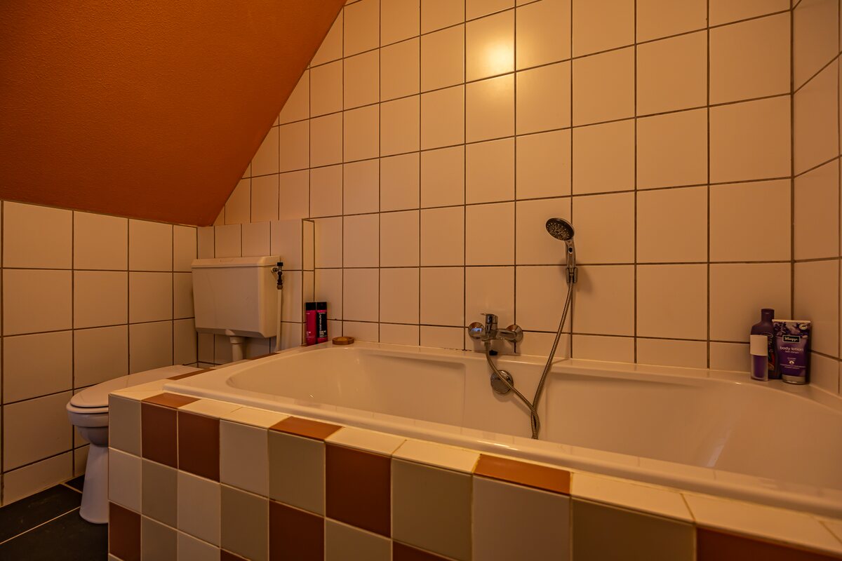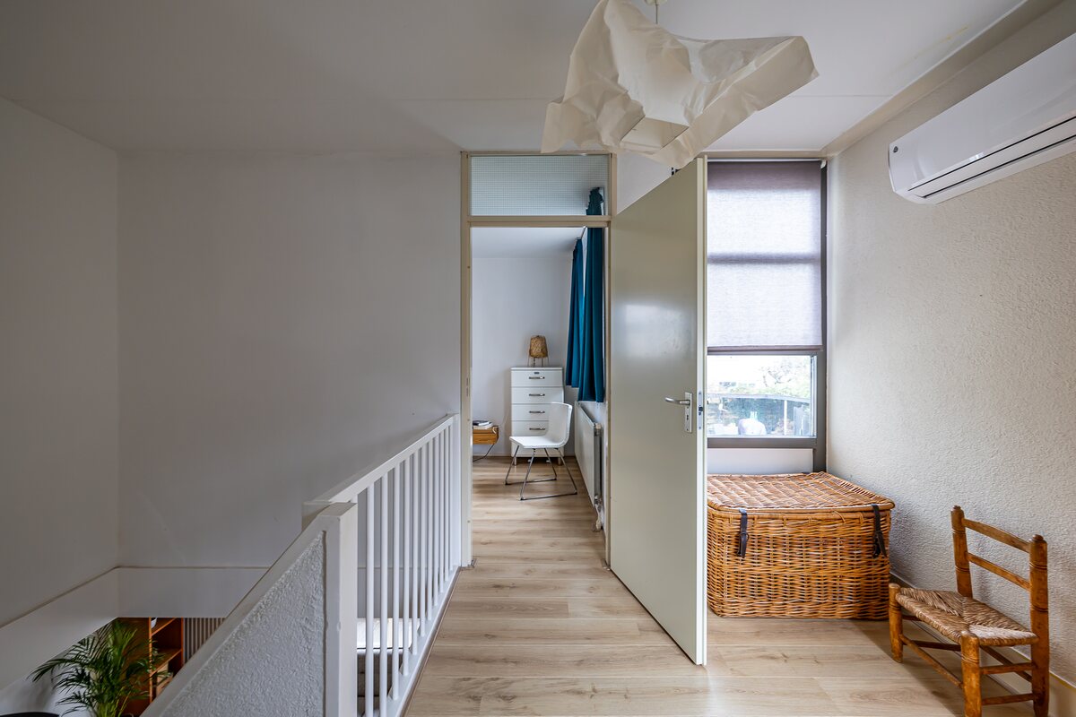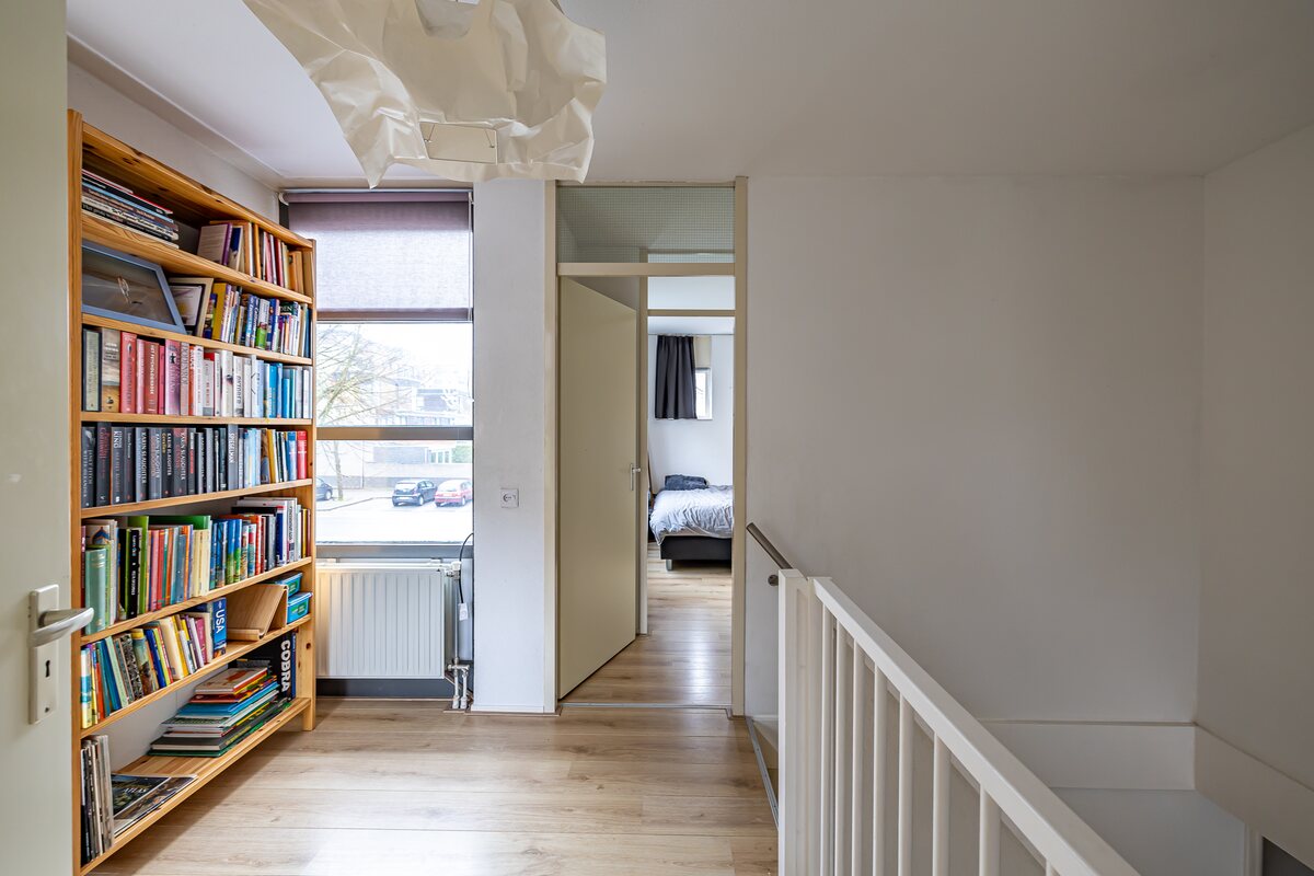 Eerste verdieping: vanuit de vide toegang tot de ruime overloop. Hier bevinden zich twee slaapkamers van 15 en 14 m². De slaapkamer aan de achterzijde is voorzien van een vaste kastenwand. De slaapkamer aan de voorzijde heeft een balkon op het Zuiden en is op te splitsen in 2 kleinere slaapkamers. De badkamer is voorzien van een ligbad, douchehoek, toilet en wastafel.