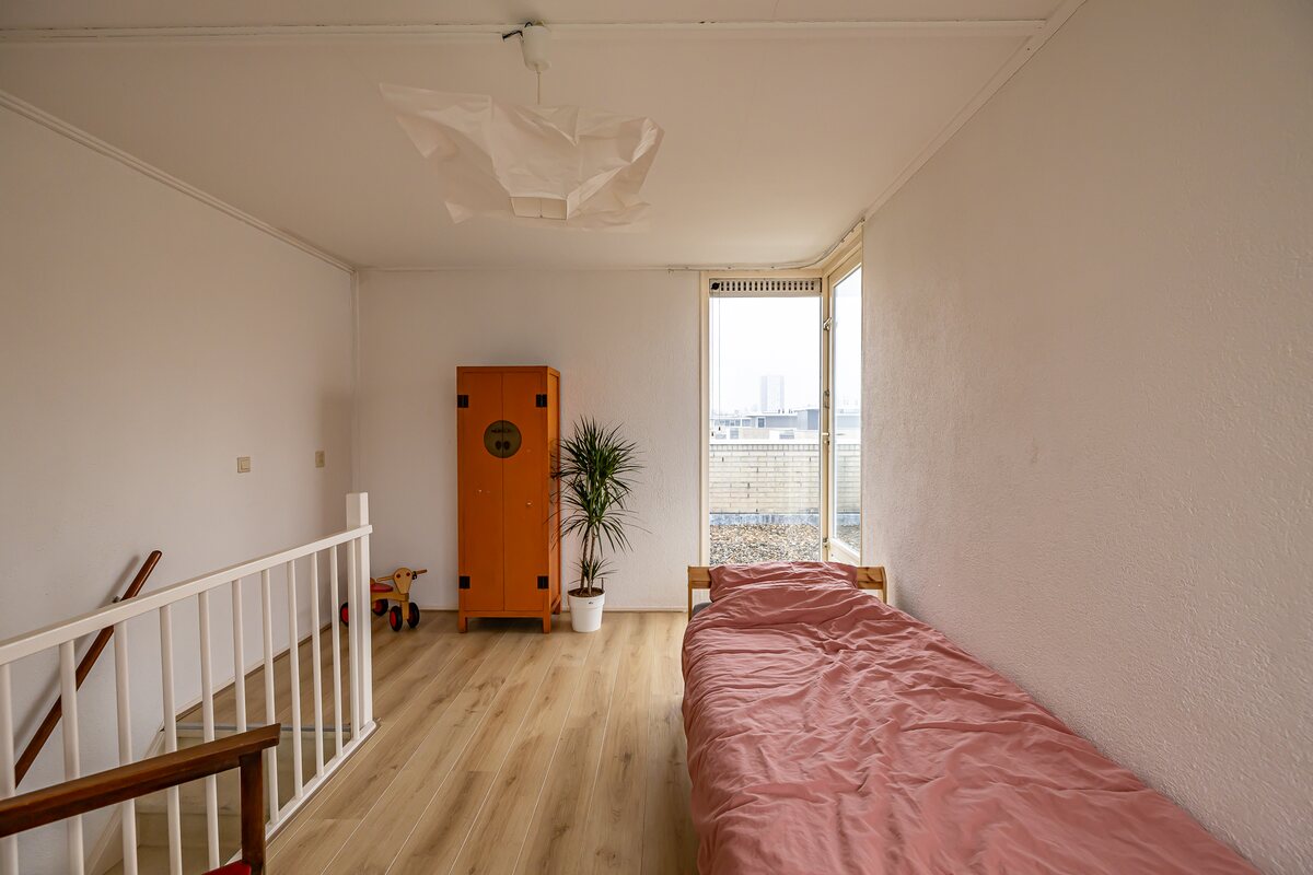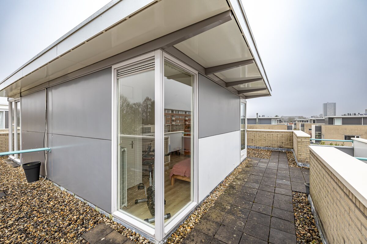 Tweede verdieping: ruime (slaap)kamer van 17 m² en bergkast met cv-opstelling en mv-box. Toegang tot het riante dakterras rondom van 32 m².
