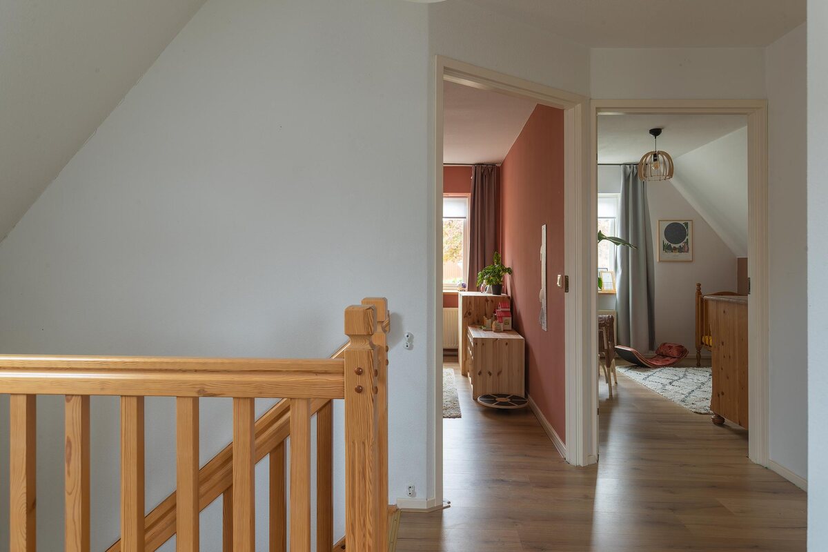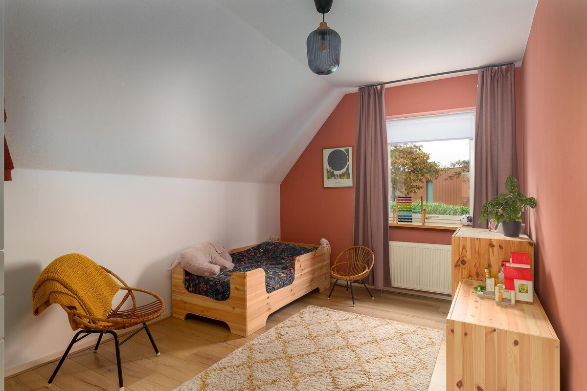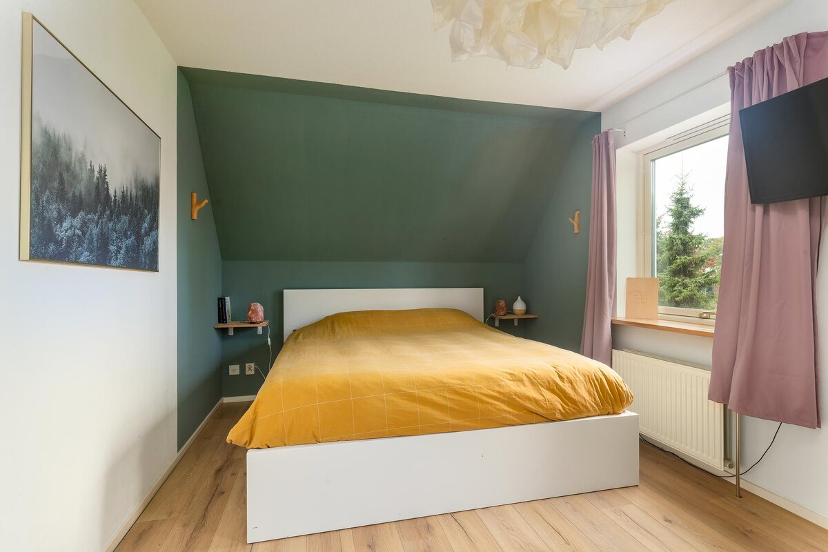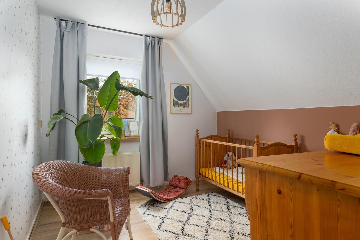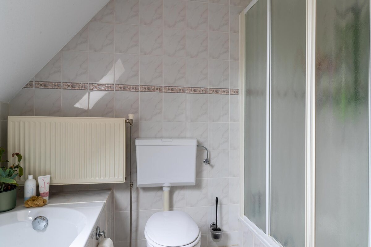 Eerste verdieping: overloop met toegang tot drie slaapkamers en de badkamer. De grootste slaapkamer bevindt zich aan de achterzijde en is ca. 16 m² groot. De andere twee slaapkamers bevinden zich aan de voorzijde en zijn ca. 10 m² en 9 m² groot. De badkamer, van ca. 6 m² groot, is voorzien van een toilet, een bad, een douche en een wastafel. Via de overloop is er nog toegang tot een bergzolder.