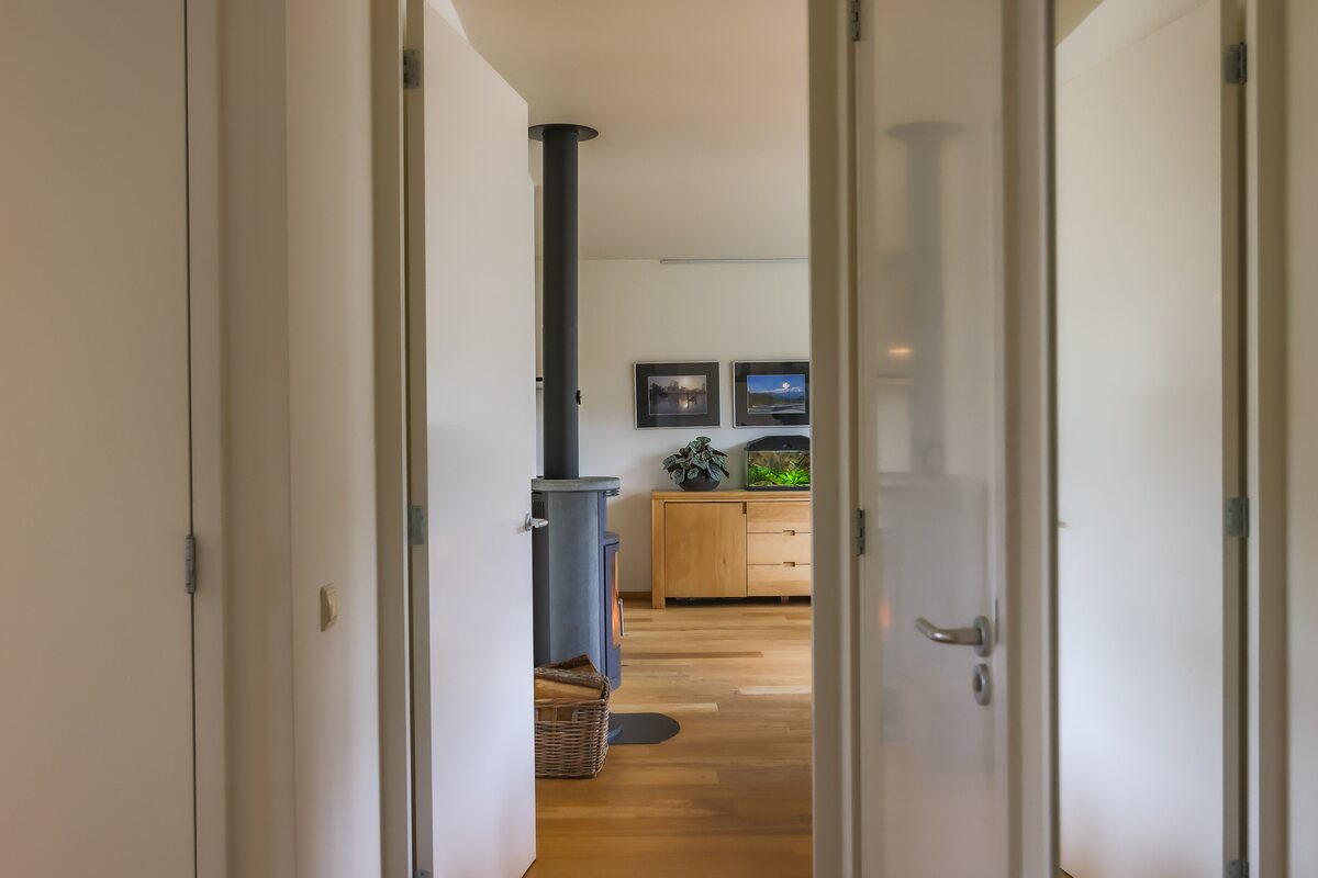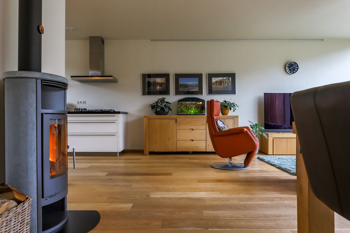 Ruime entree/hal met toilet, toegang tot alle vertrekken en trap naar de verdieping. Leuke tuingerichte woonkamer met open keuken (totaal ca. 47 m²) met houtkachel en openslaande deuren naar de tuin/patio. De keuken ligt aan de voorkant van de woning en is voorzien van inbouw apparatuur: koelkast, vaatwasser, oven, separate magnetron, gaskookplaat en afzuigkap. Doorloop naar ruime bijkeuken met deur naar de voortuin/oprit. Voorts twee slaapkamers van 15 en 9 m2, een moderne en strakke badkamer (ca. 7m2) met ligbad, douche en wastafelmeubel.
