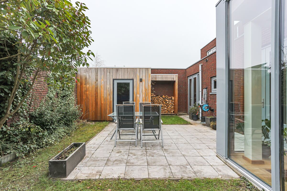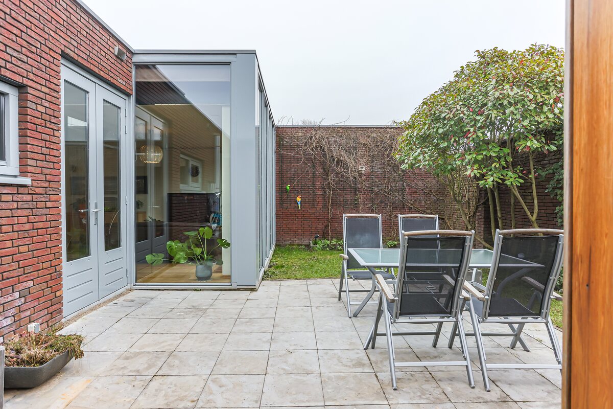 Patio: compleet ommuurd, heel veel zon, ca. 75 m2 op het zonnige zuiden met gazon en terras. Verder een ruime houten schuur waardoor de patio ook achterom te bereiken is.