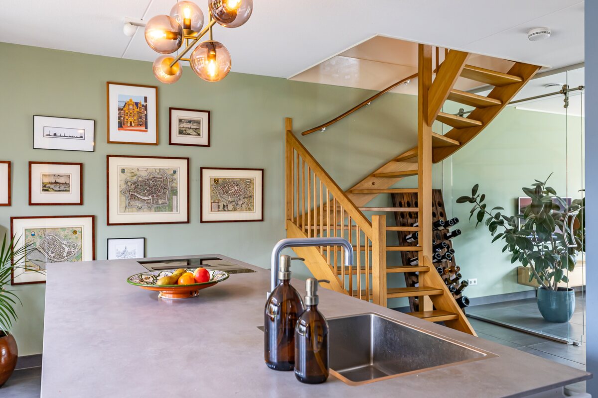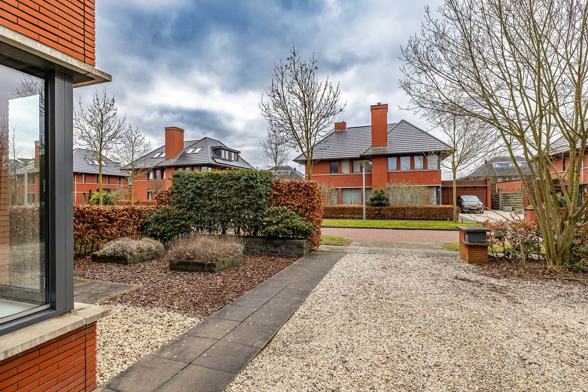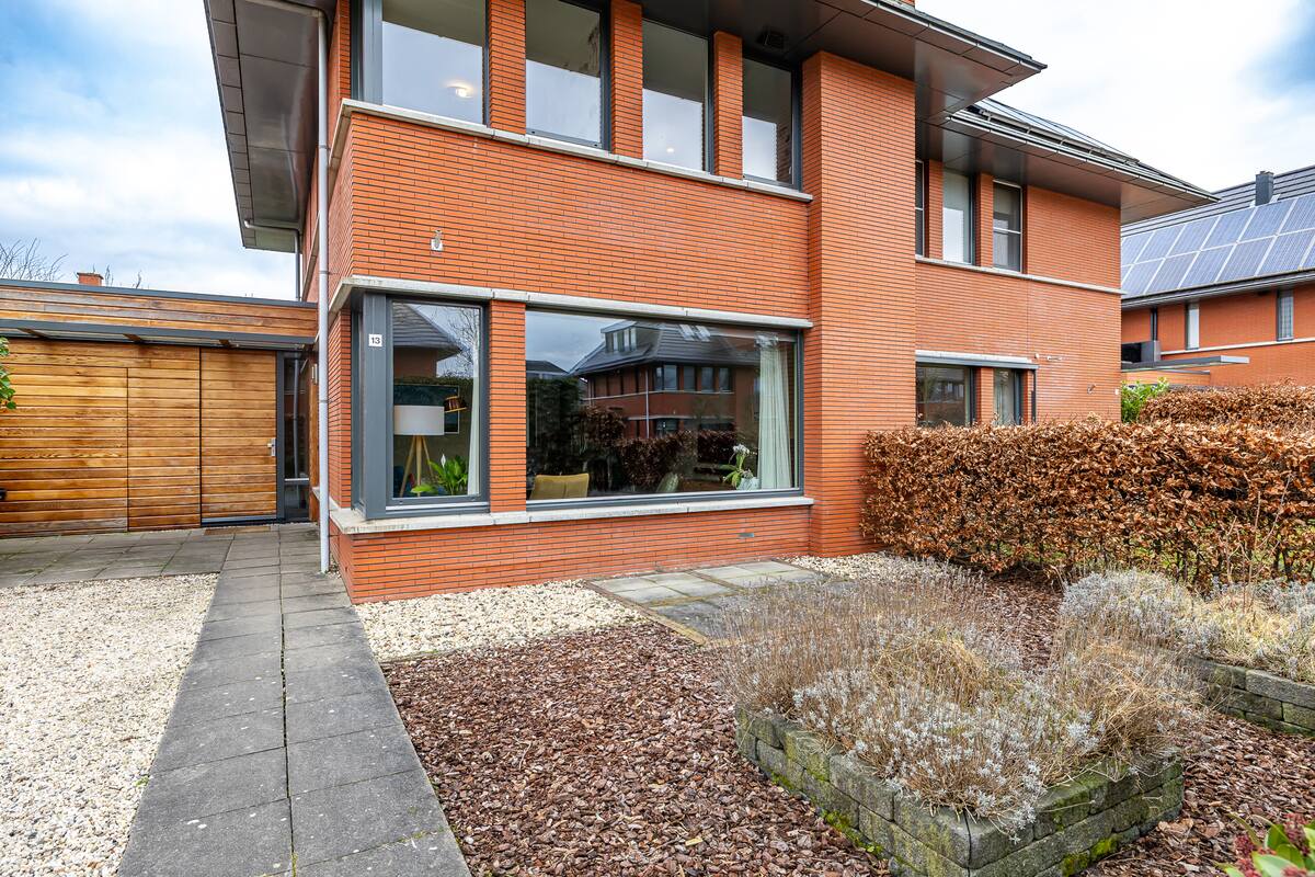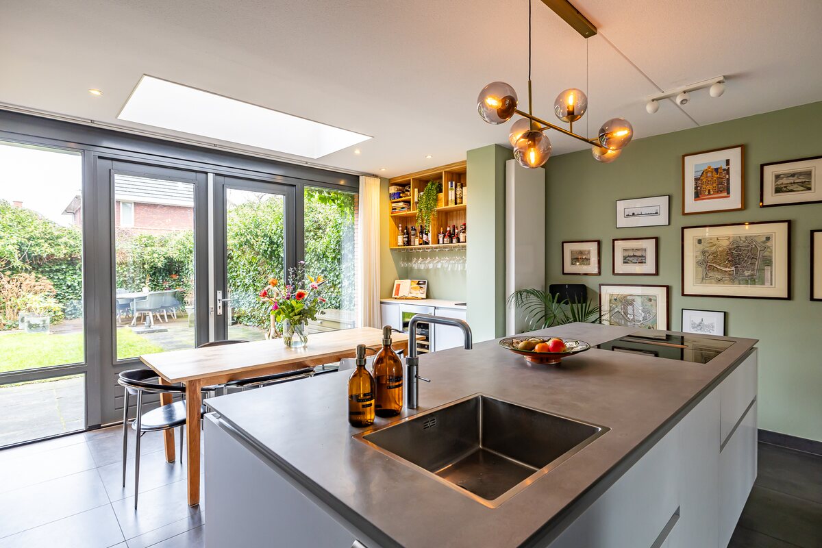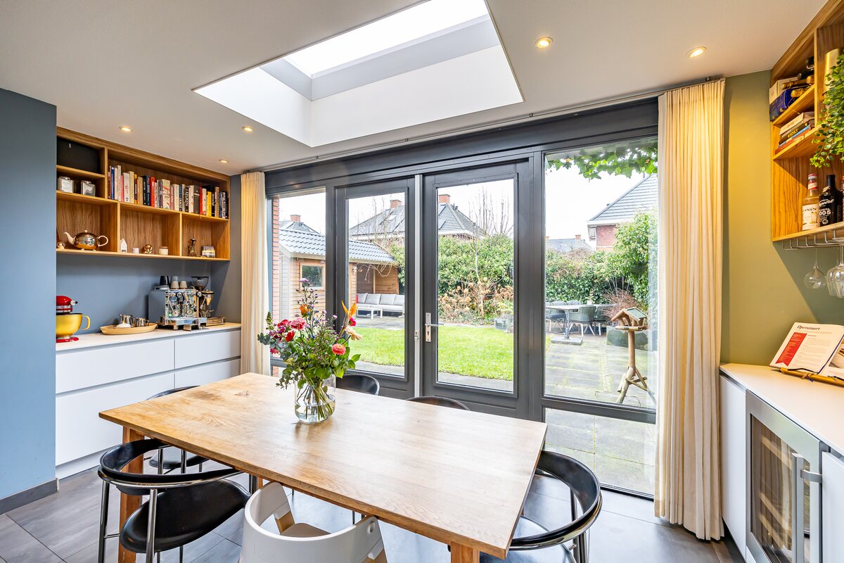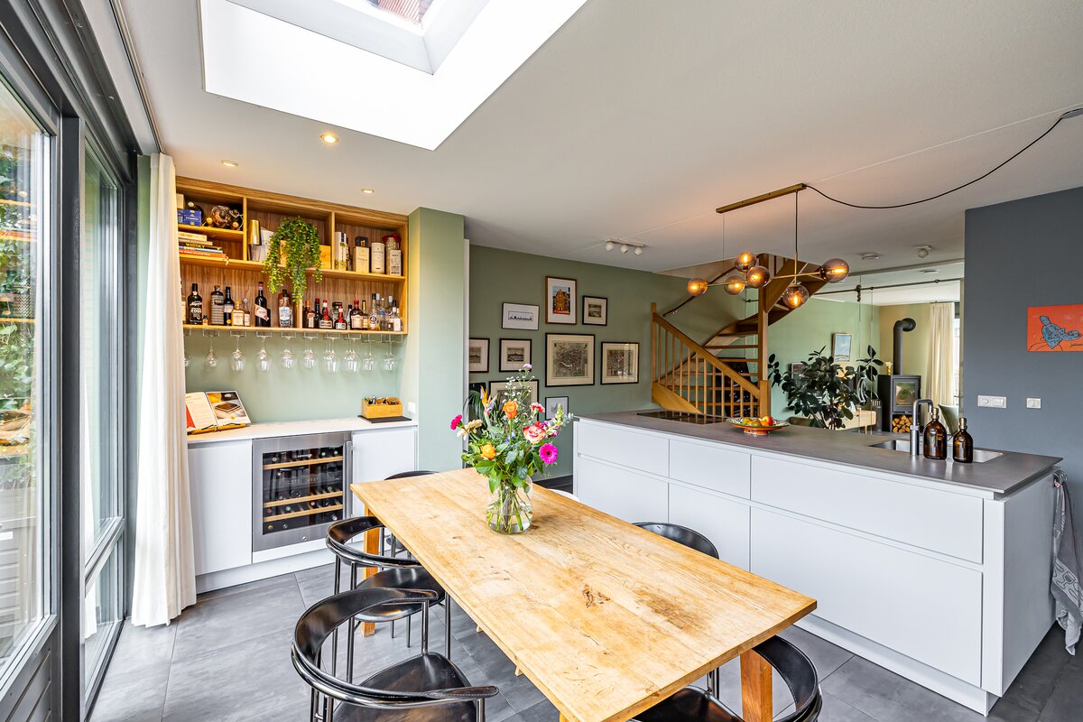 Hal/entree met verzorgd toilet, meterkast, toegang tot de woonkamer en doorloop naar de fraaie garderobe. Deze ruimte ligt heel praktische tussen de voorhal, de berging, de speelkamer en de keuken.Luxueuze, smaakvolle en uitgebouwde woonkeuken (ca. 35 m2, 2019) met groot kook- en spoeleiland en wandmeubel met luxe inbouwapparatuur (o.a. Bora inductiekookplaat met geïntegreerde afzuiging en Gaggenau bakoven en combi-stoomoven en een Quooker). In bijpassende stijl is de pantry ingericht met o.a. wijnklimaatkast. De keuken is deels voorzien van vloerverwarming en geniet veel lichtinval door de grote glaspui en openslaande deuren naar de tuin en de lichtstraat in het plafond. De keuken en de woonkamer zijn middels een chique glapui onder de trap gescheiden. Woonkamer (ca. 26 m2) ligt aan de voorzijde van de woning, heeft zicht op de voortuin en is net als hal, de garderobe en keuken voorzien van een mooie plavuizenvloer. In de hoek staat een gezellige houtkachel.De werk-speelkamer (ca. 12 m2) is volledig geisoleerd en bevindt zich in het achterste deel van de voormalig garage. In het voorste deel bevindt zich de (fietsen)berging.Verdieping: Overloop met separaat toilet.Drie ruime en praktische slaapkamers van ca. 16, 12 en 11 m2. Nette badkamer (ca. 5 m2) met ligbad, inloopdouche en wastafelmeubel.
