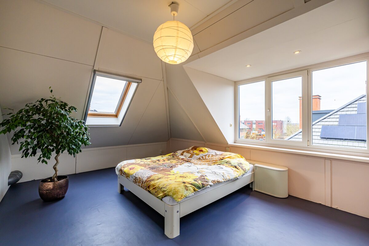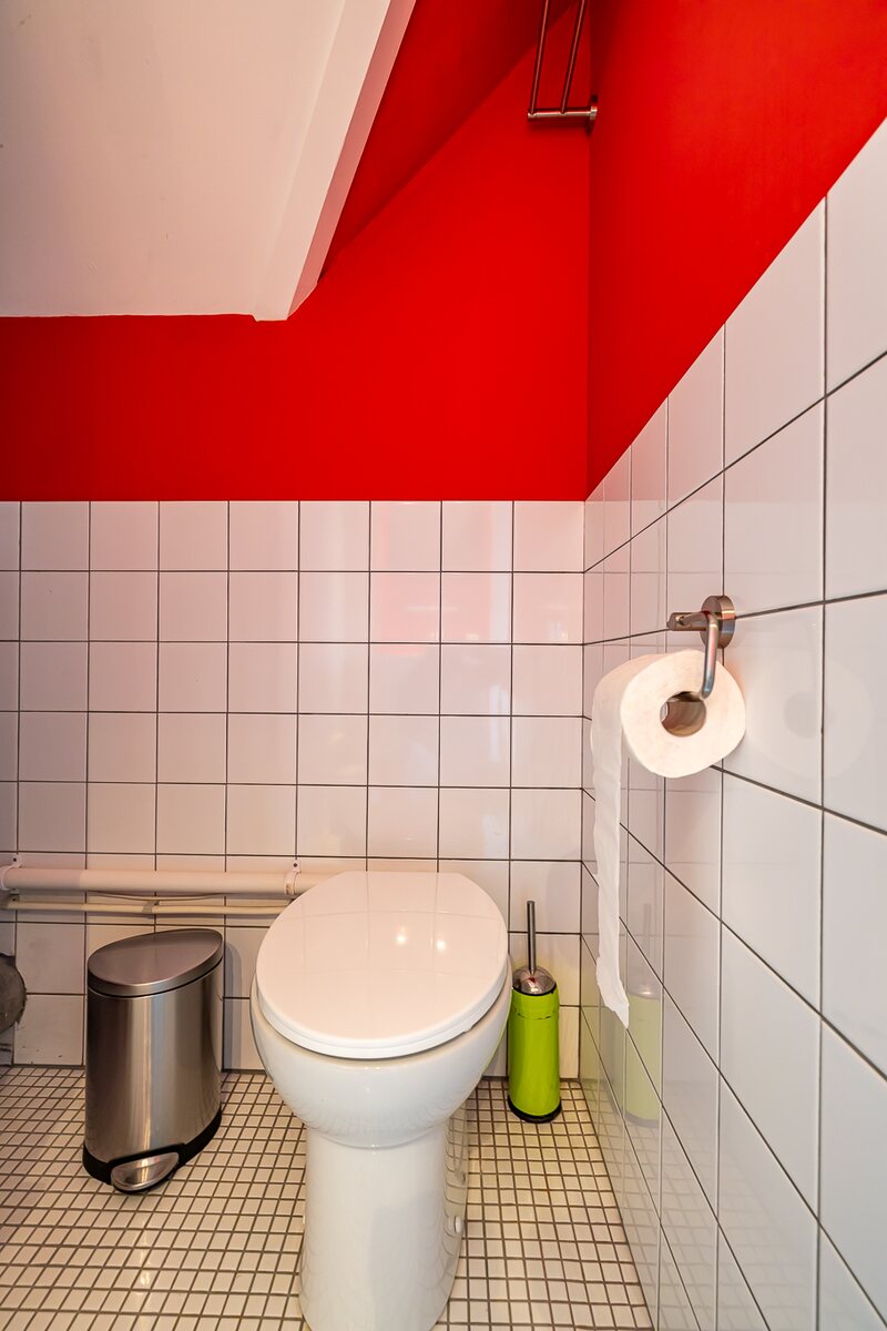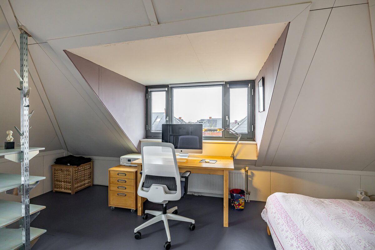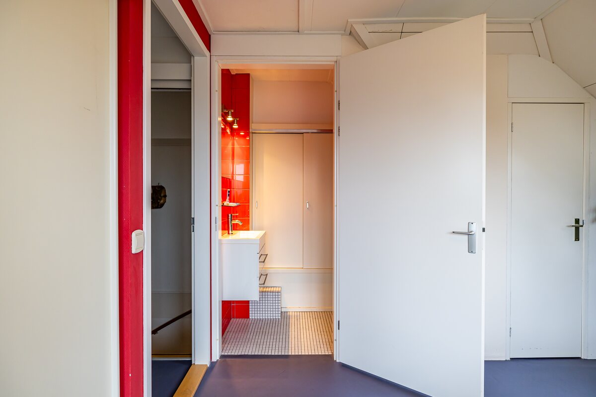 Tweede verdieping: overloop.Deze etage biedt door toevoeging van de dakkapellen plaats aan twee grote slaapkamers (ca. 14 en 15 m2). De grootste kamer heeft een natte groep met toilet en wastafelmeubel. Achter het schot hangt de CV ketel en WTU.
