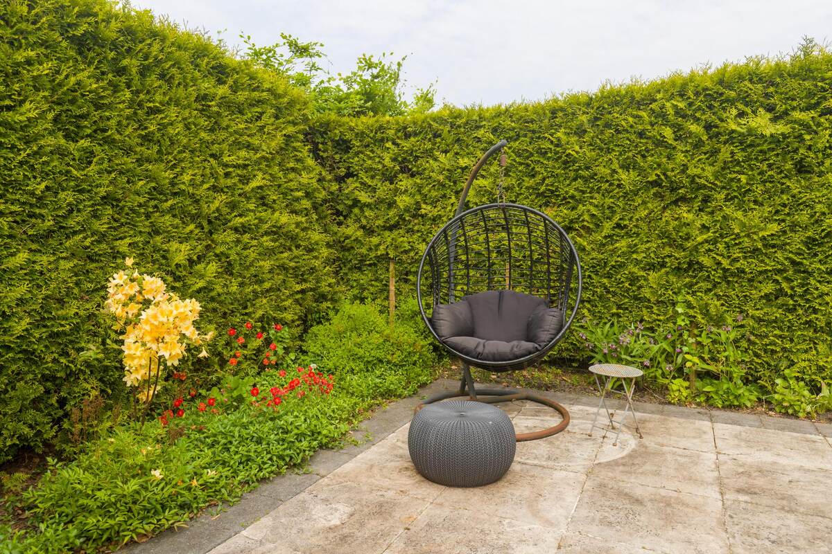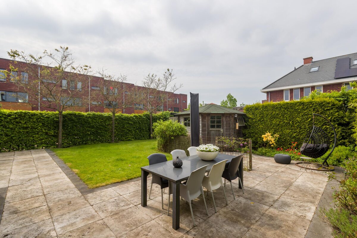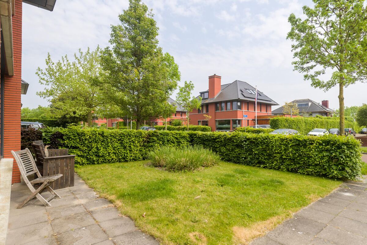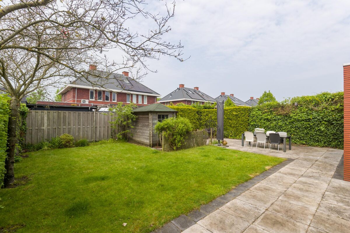 Ruime voortuin en eigen oprit voor meerdere auto´s.Heerlijke riante achtertuin (ca. 10 meter breed en 8 diep) met terras, gazon, houten tuinchalet en borders. 's Zomers de gehele dag- en avond zon. Achterom.
