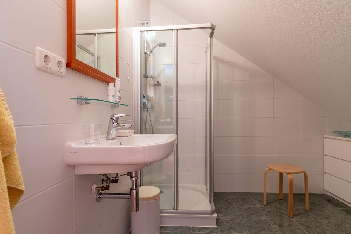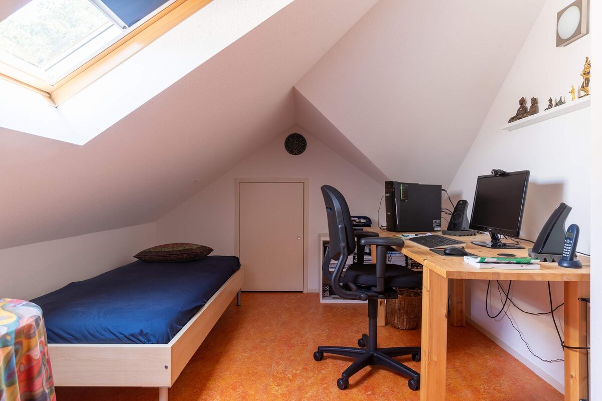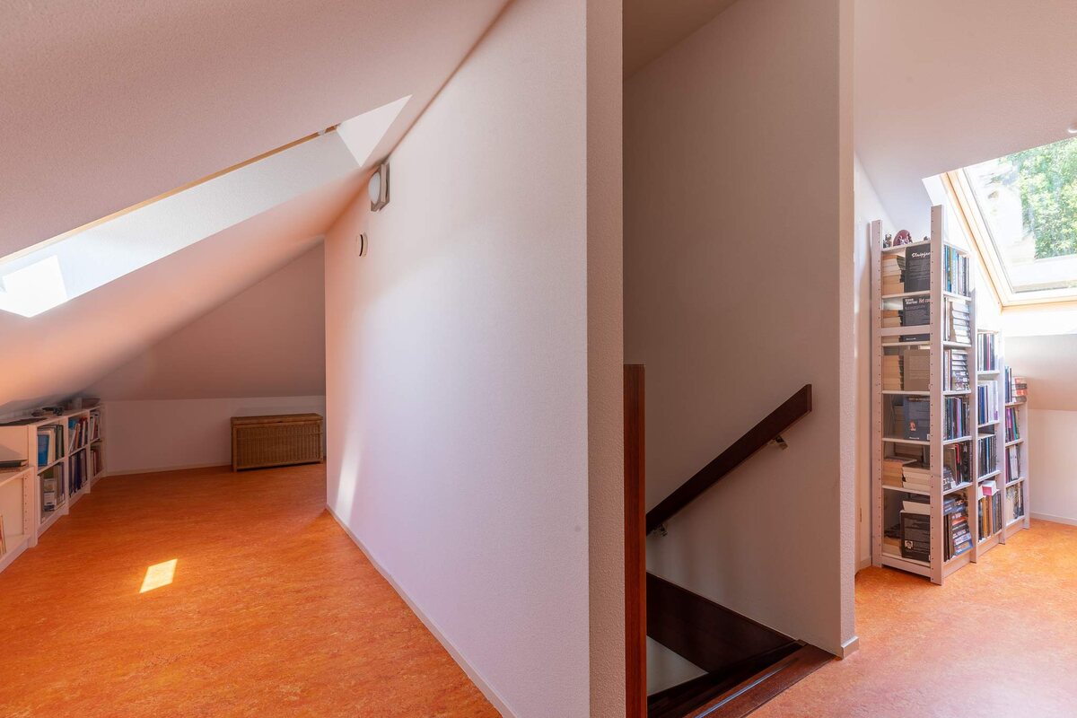 Eerste verdieping: Multifunctionele ruimte van ca. 25 m² met knieschotten. Op deze verdieping is een tweede badkamer aanwezig met douche en wastafel. De badkamer is ca. 4 m² groot. Tevens is er nog een ruime bergzolder aanwezig met daarbij de WTW installatie.