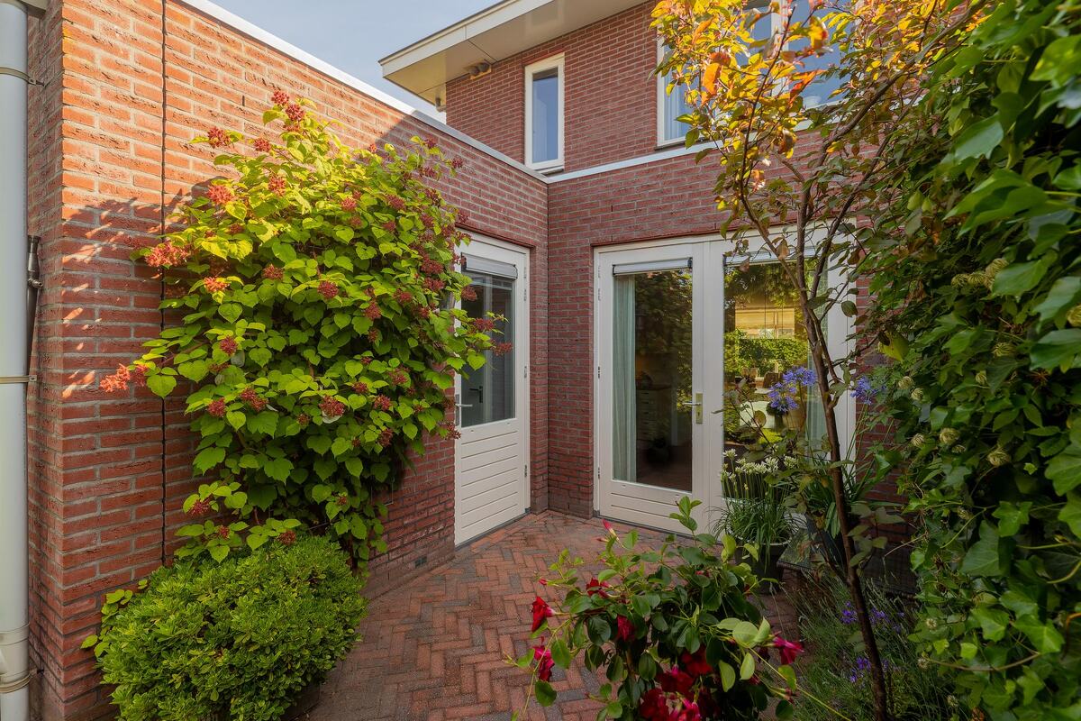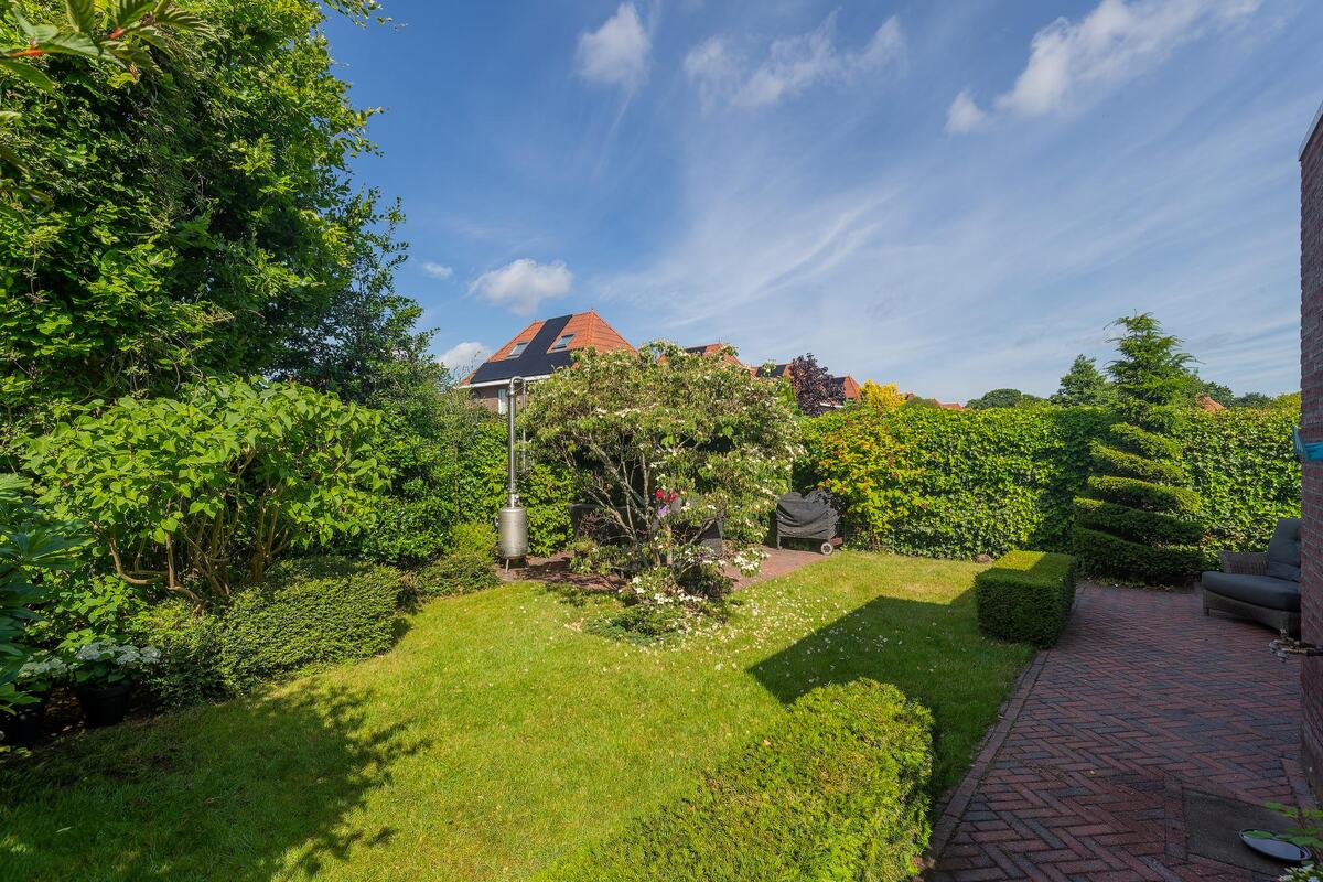 De brede dakoverstekken werken in de zomer gunstig om oververhitting van de woning tegen te gaan en beschermen de kozijnen en metselwerk tegen weersinvloeden, zoals (fel) zonlicht en regenval. De woning heeft, mede door de erker, veel lichtinval. Vanuit de erker heb je zicht op de speeltuin, maar ook op de bedrijvigheid van een vogelnestje waarjaarlijks in gebroed wordt. Tijdens de bouw hebben we ervoor gekozen om de kamer te verlengen, net als de bijkeuken. Het eten met zicht op de wintergroene tuin is aangenaam met de openslaande tuindeuren. Vanaf de ochtend tot en met de avond kun je genieten van de zon in de achtertuin. De onderhoudsvriendelijke tuin is onder architectuur aangelegd. De zuilbomen blokkeren het zicht op de woning van de achterburen, waardoor dit veel privacy creëert. De dakplantaan (parasolboom) geeft verkoeling en schaduw bij hete zomers en we genieten tot laat in het seizoen van het terras met de sfeervolle lampjes in de boom van het buitenleven.