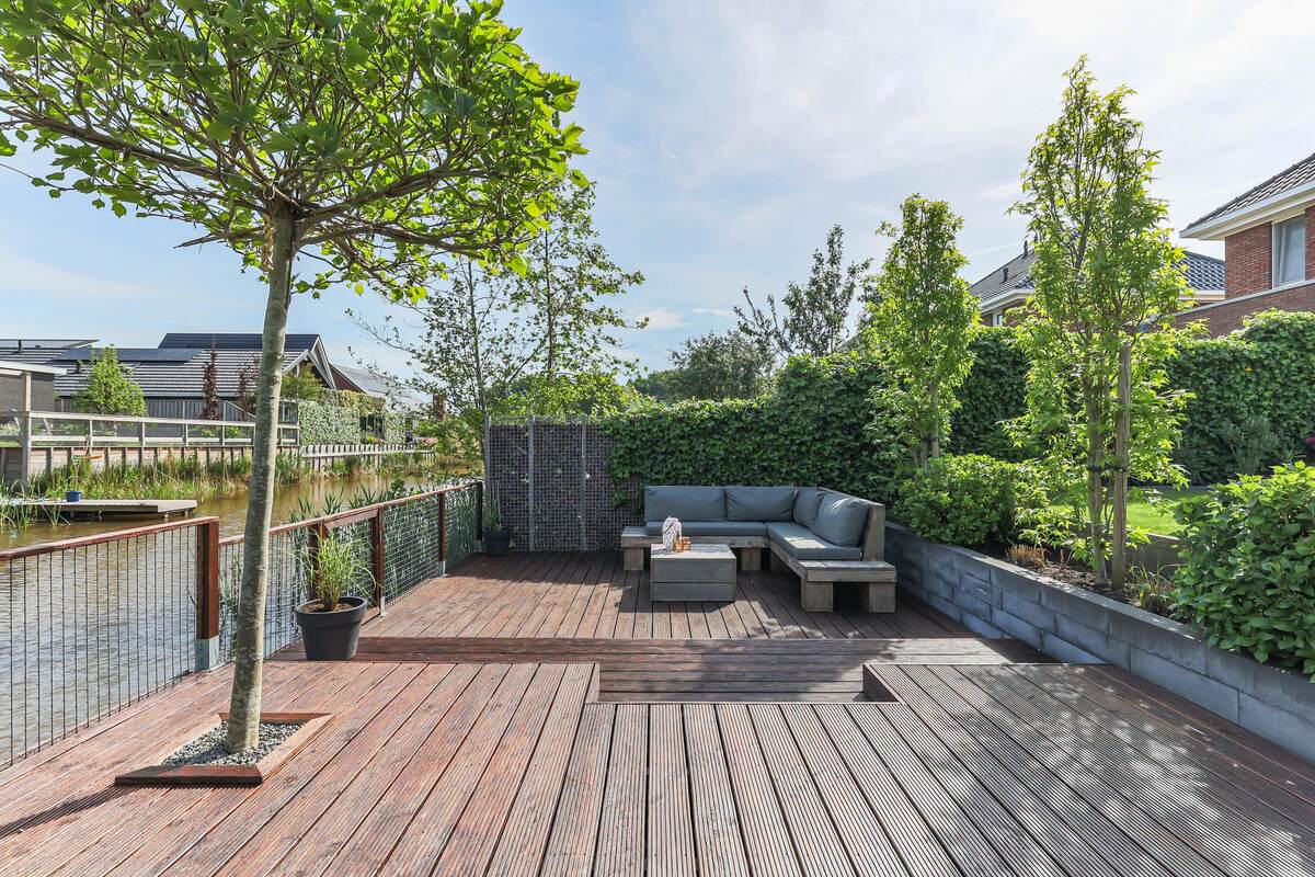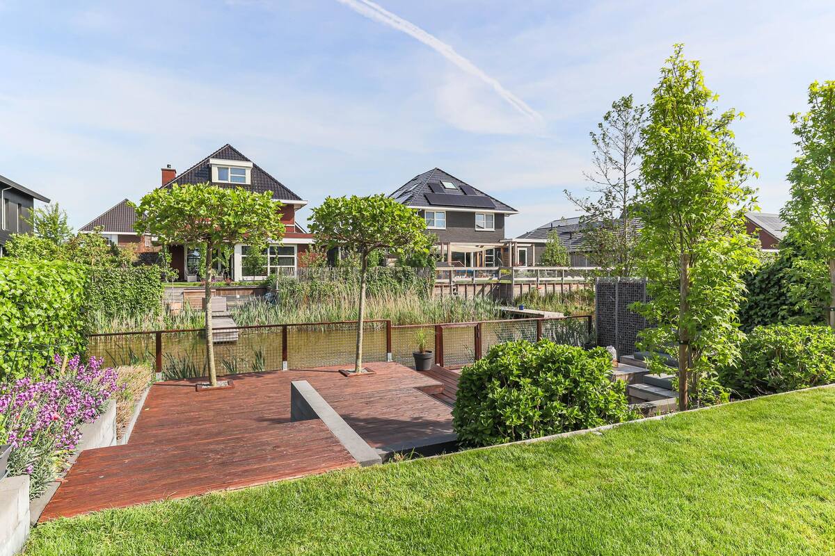 Riante, fraai gelegen en zonovergoten achtertuin (ca. 10 meter breed en 15 meter diep) op het noordwesten. Met prachtig terras aan de waterzijde, gazon, en tegels. Prachtig geheel! In de vroege ochtend tot in de late avond zon- en schaduwplekken. Tevens een nette voortuin en eigen grote oprit.