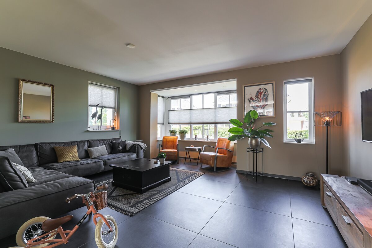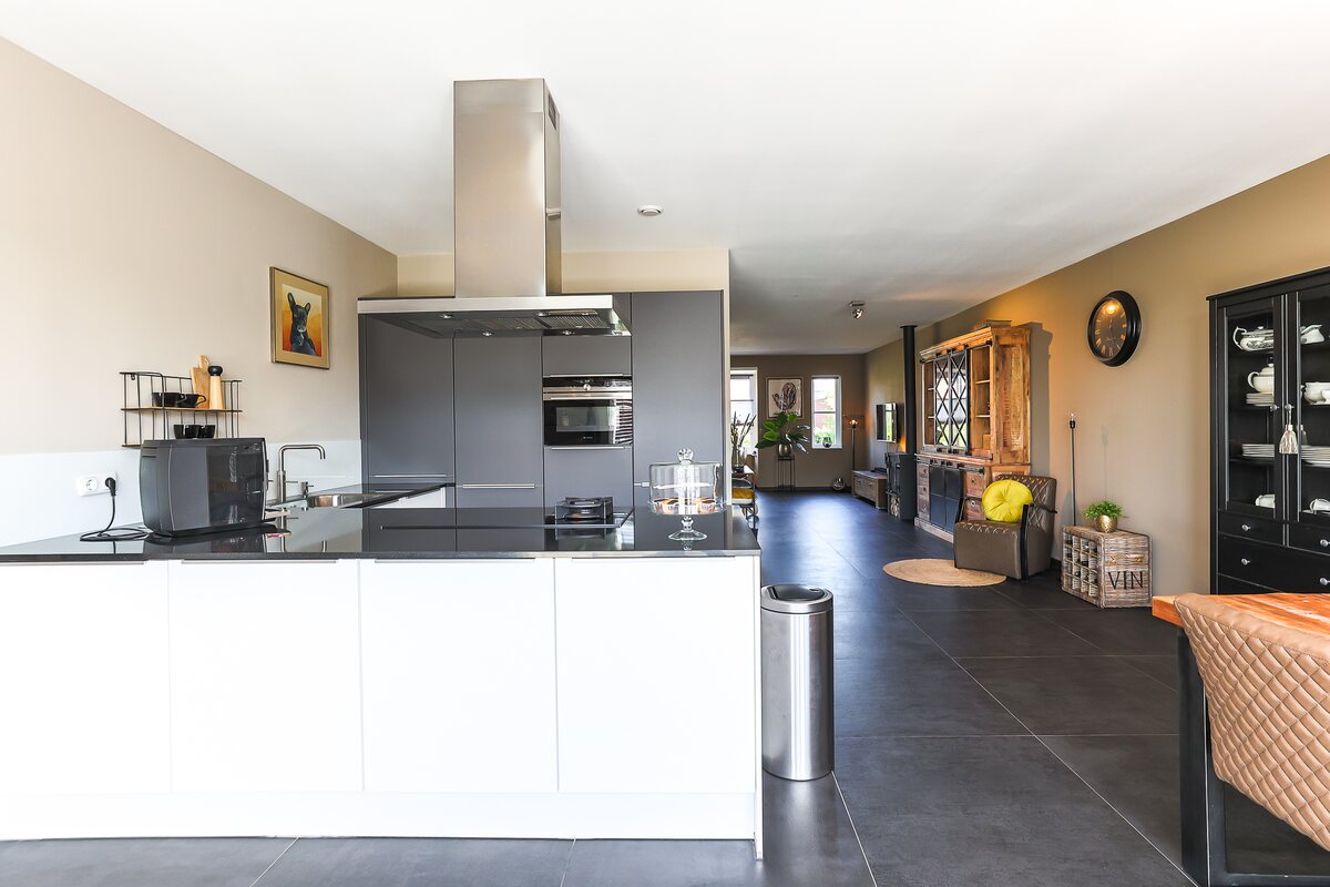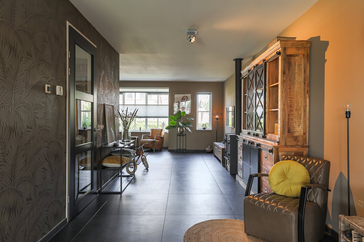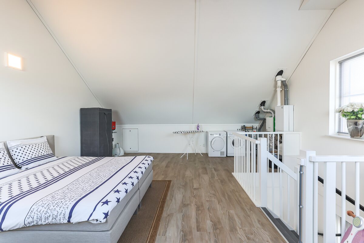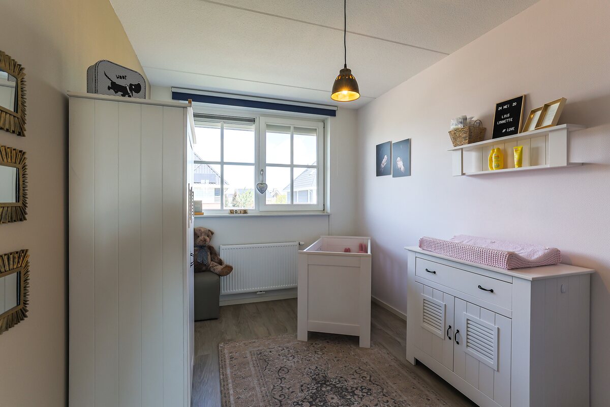 Begane grond: entree/hal met toilet, royale en fraaie U-vormige vloerverwarmde living (ca. 66 m2) met erker en houtkachel. Aan de achterzijde de tuingerichte luxe open woonkeuken in U-opstelling v.v. inbouwapparatuur en openslaande tuindeuren. Via de keuken toegang tot de garage (18 m2). Deze heeft een tuindeur aan de achterzijde en aan de voorzijde openslaande houten deuren naar de carport en oprit.Eerste verdieping: overloop, 3 slaapkamers (16, 11 en 11 m2) en een strakke badkamer met ligbad, dubbel wastafelmeubel, flinke douche en een tweede toilet.Tweede verdieping: flinke vierde kamer (34 m2!) met opstelplaats voor de wasmachine en cv-ketel.