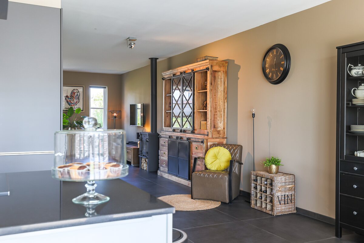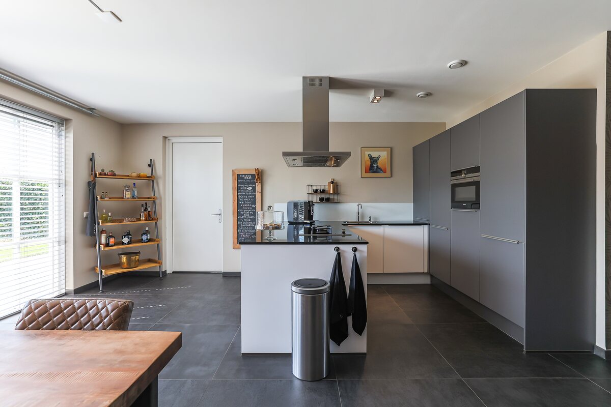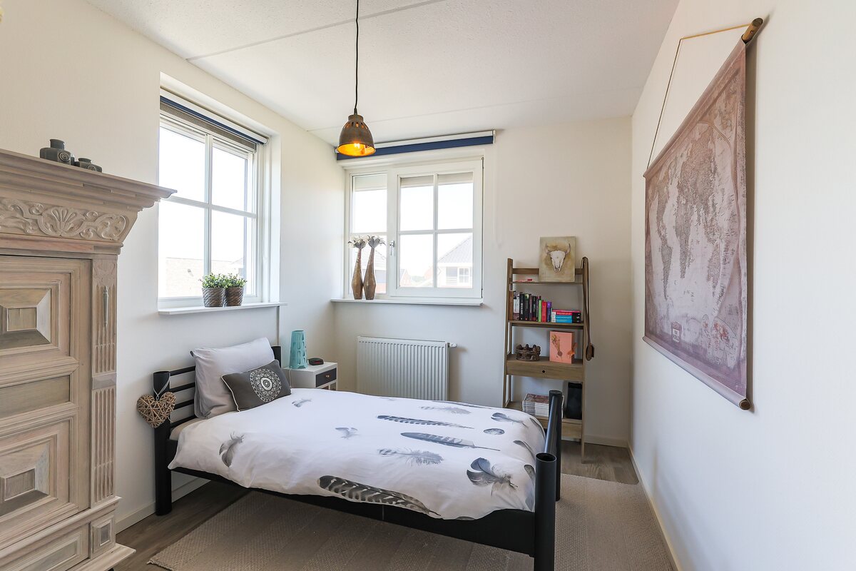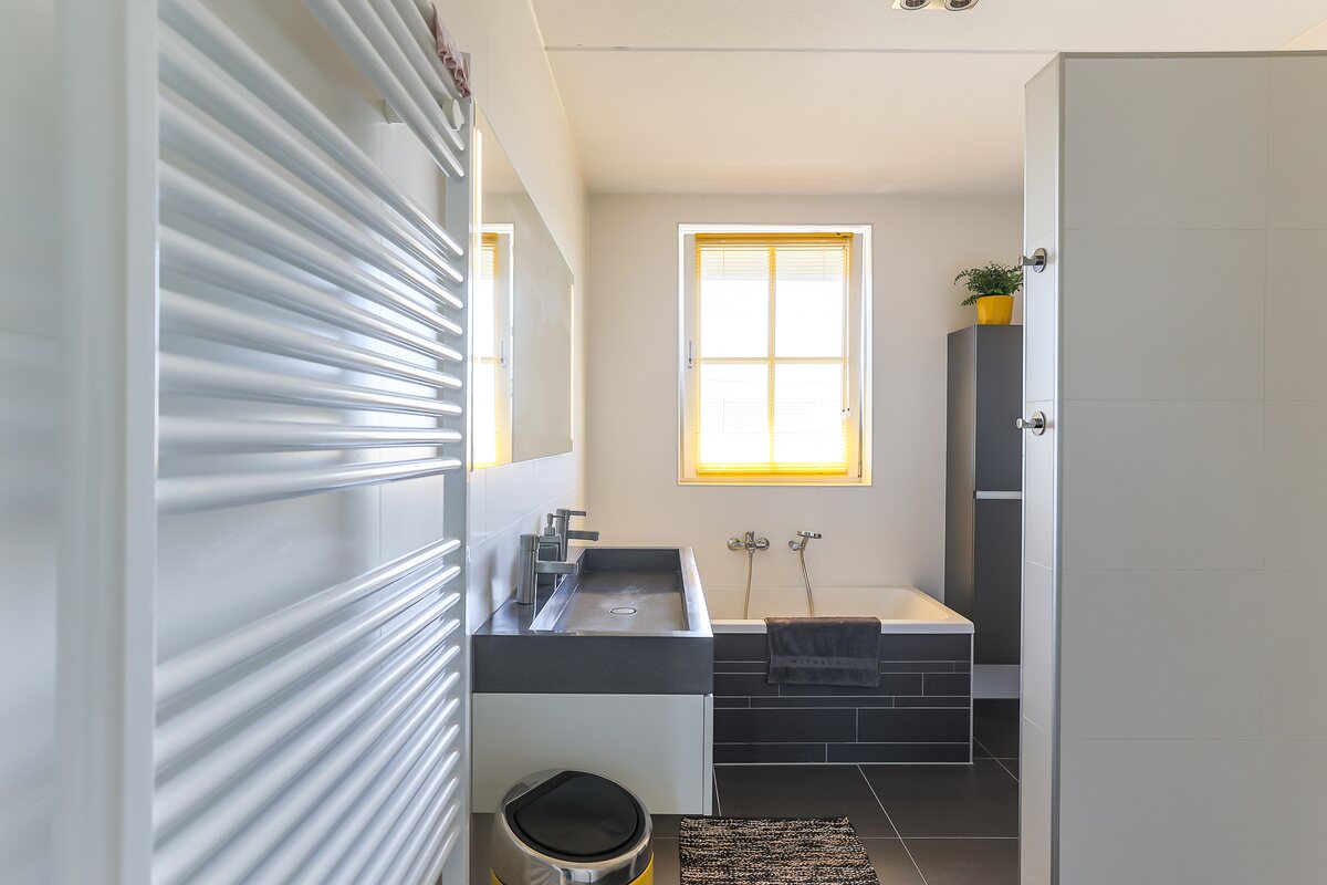 Begane grond: entree/hal met toilet, royale en fraaie U-vormige vloerverwarmde living (ca. 66 m2) met erker en houtkachel. Aan de achterzijde de tuingerichte luxe open woonkeuken in U-opstelling v.v. inbouwapparatuur en openslaande tuindeuren. Via de keuken toegang tot de garage (18 m2). Deze heeft een tuindeur aan de achterzijde en aan de voorzijde openslaande houten deuren naar de carport en oprit.Eerste verdieping: overloop, 3 slaapkamers (16, 11 en 11 m2) en een strakke badkamer met ligbad, dubbel wastafelmeubel, flinke douche en een tweede toilet.Tweede verdieping: flinke vierde kamer (34 m2!) met opstelplaats voor de wasmachine en cv-ketel.