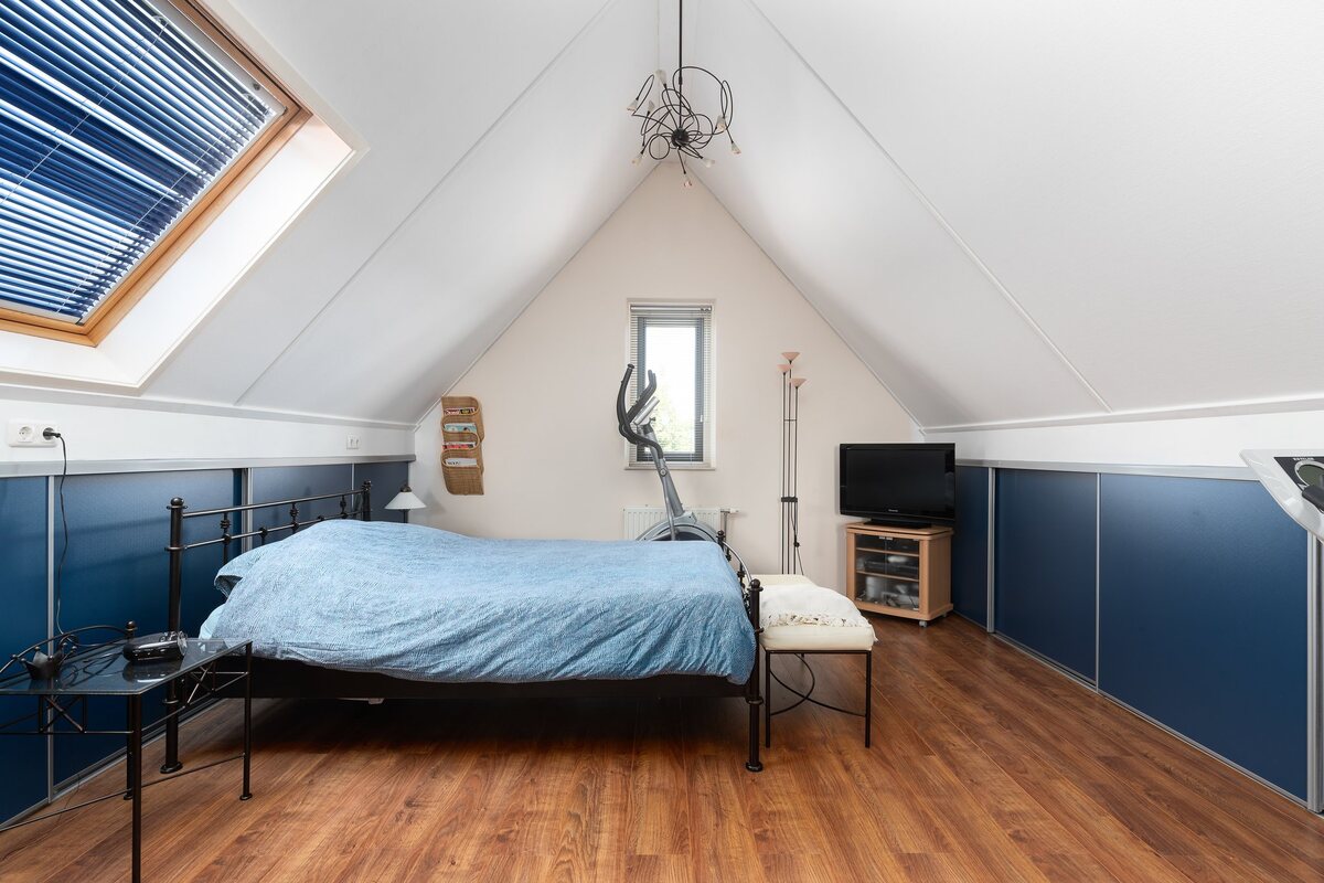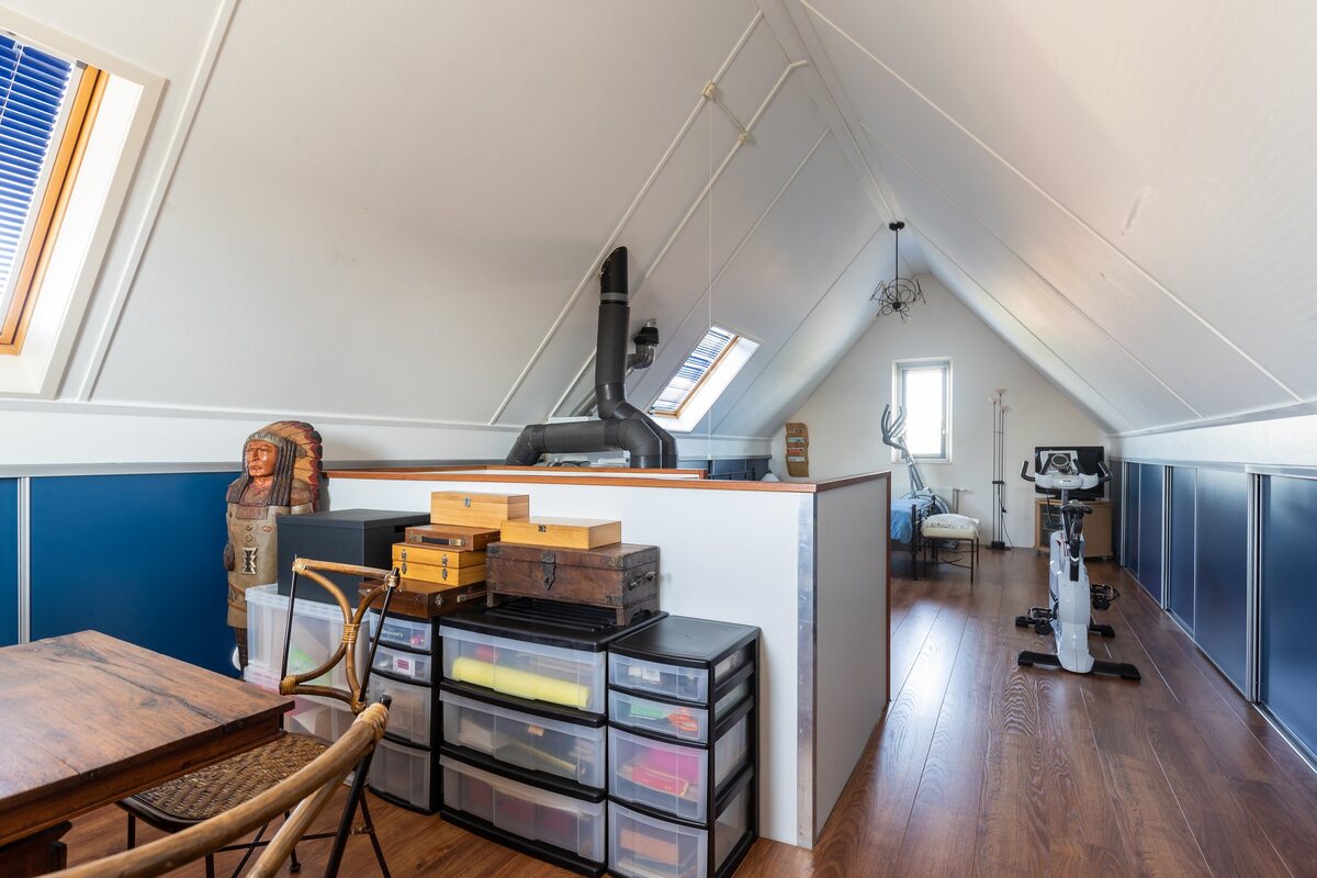 Grote hoge zolderverdieping (ca. 35 m2) met gevelramen, dakramen en veel bergruimte achter de keurig afgewerkte knieschotten, geheel voorzien van schuifdeuren. De zolder (voorzien van laminaat) kan relatief eenvoudig worden ingericht met twee extra slaapkamers. Opstelplaats van de CV ketel (HR combi 2005) en WTW.