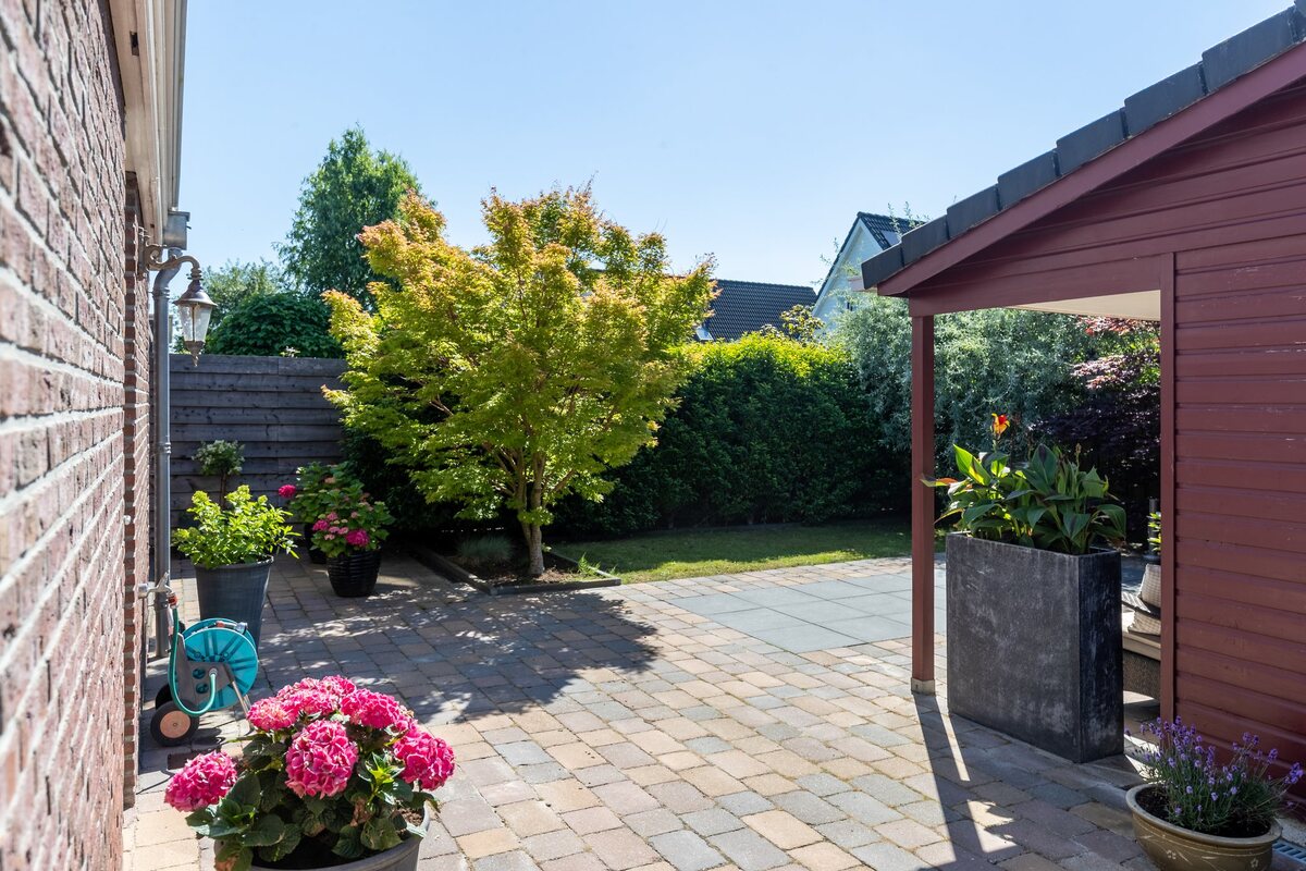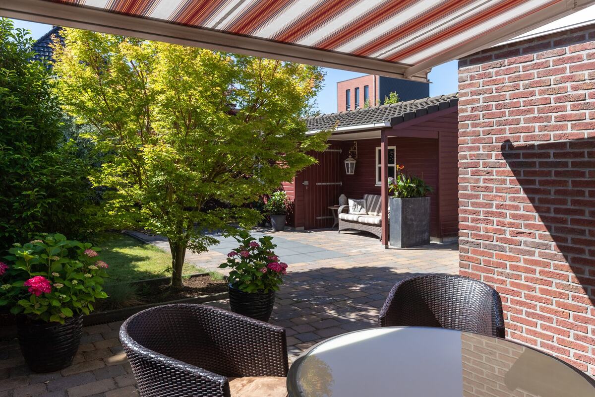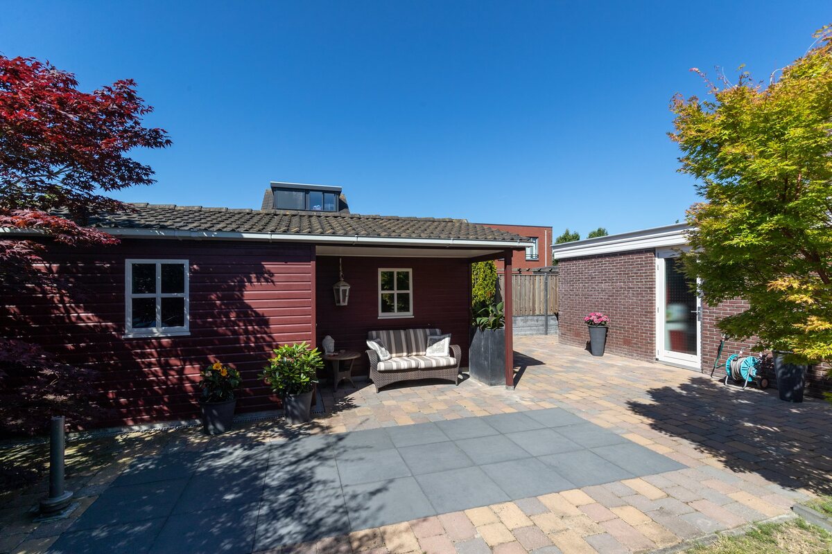 Achtertuin: op het zuiden georiënteerd, in totaal 13 meter diep en dik 12 meter breed. Met terrassen, gazon en een royale vrijstaande houten schuur/berging met overkapte veranda.De tuin is bereikbaar via een achterom naast de garage.