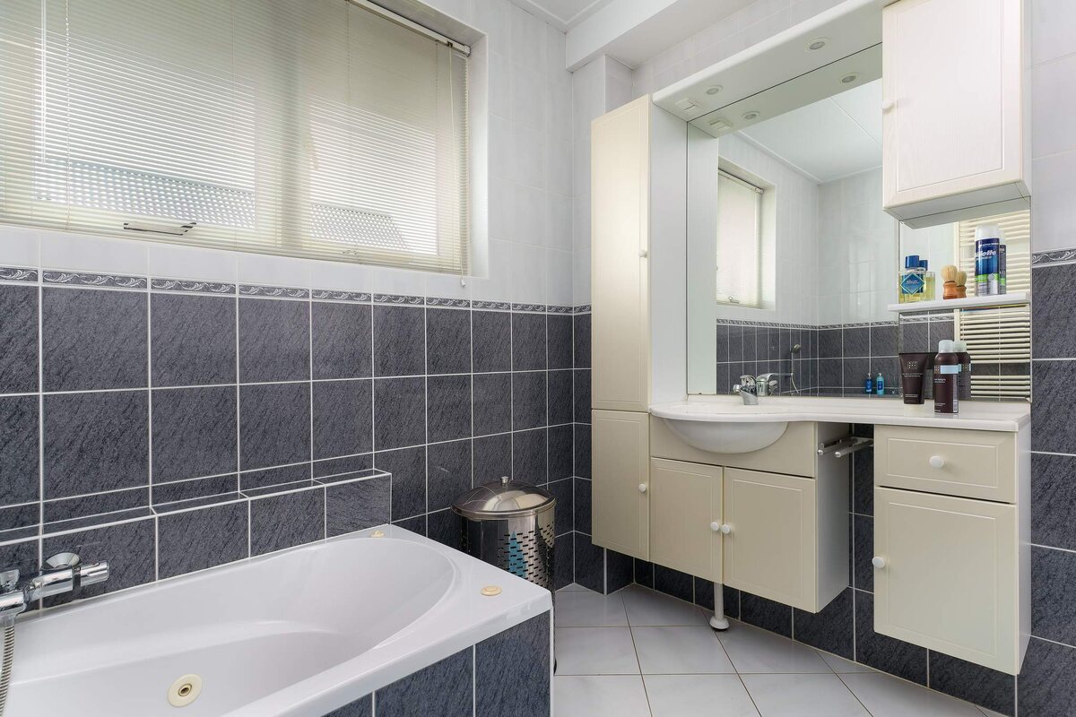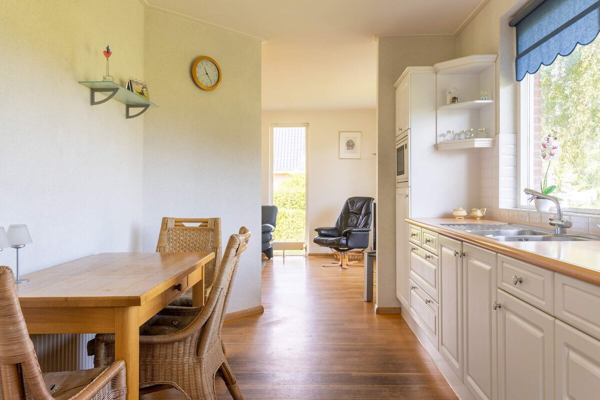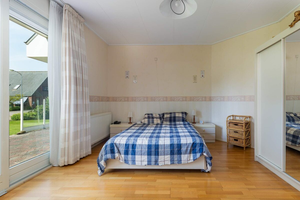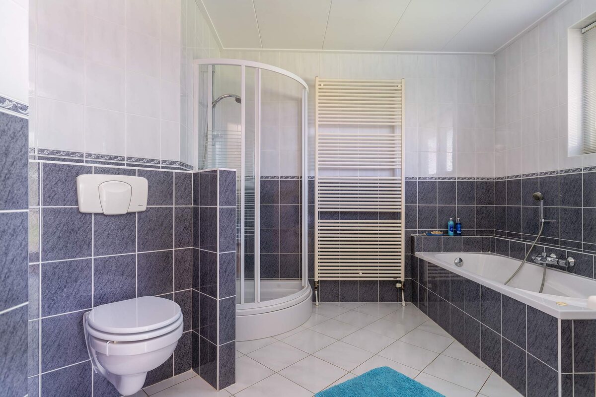 Begane grond: de entree/hal van maar liefst 17 m² groot is het centrale punt van de begane grond. Vanuit hier zijn praktische gezien alle vertrekken op deze woonlaag te betreden. De hal is voorzien van een toilet, meterkast en een trapopgang naar de eerste verdieping. De lichte woonkamer is ca. 42 m² groot en beschikt over een open haard en een schuifpui naar de achtertuin. De half open keuken is ca. 15 m² groot en voorzien van een dubbele spoelbak, elektrische kookplaat, combi oven/magnetron en een koelkast. De slaapkamer bevindt zich aan de achterzijde van de woning en is ca. 17 m² groot en is voorzien van een schuifpui naar de achtertuin. Vanuit de slaapkamer is ook de badkamer te betreden. Deze badkamer is ca. 9 m² groot en beschikt over een ligbad, douche, toilet en een wastafel. De bijkeuken is ca. 10 m² groot en biedt plaats voor een wasmachine en een droger en veel opbergmogelijkheden. De bijkeuken is zowel aan de voor- als achterzijde van buiten toegankelijk. Vanuit de bijkeuken is er toegang tot de dubbele garage van 32 m². De garage beschikt over een wastafel en diverse elektrapunten. Daarnaast is één deur elektrisch bedienbaar.
