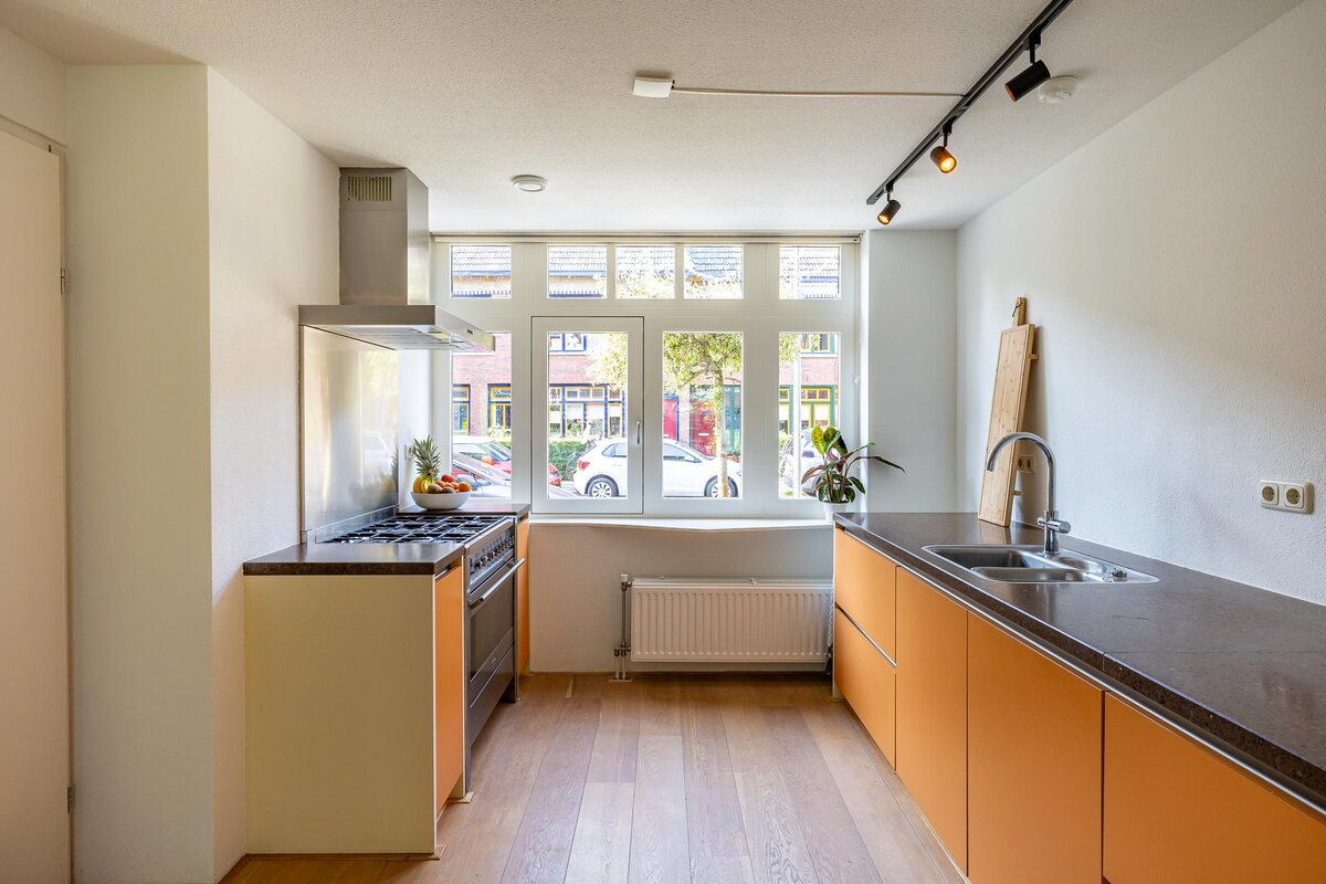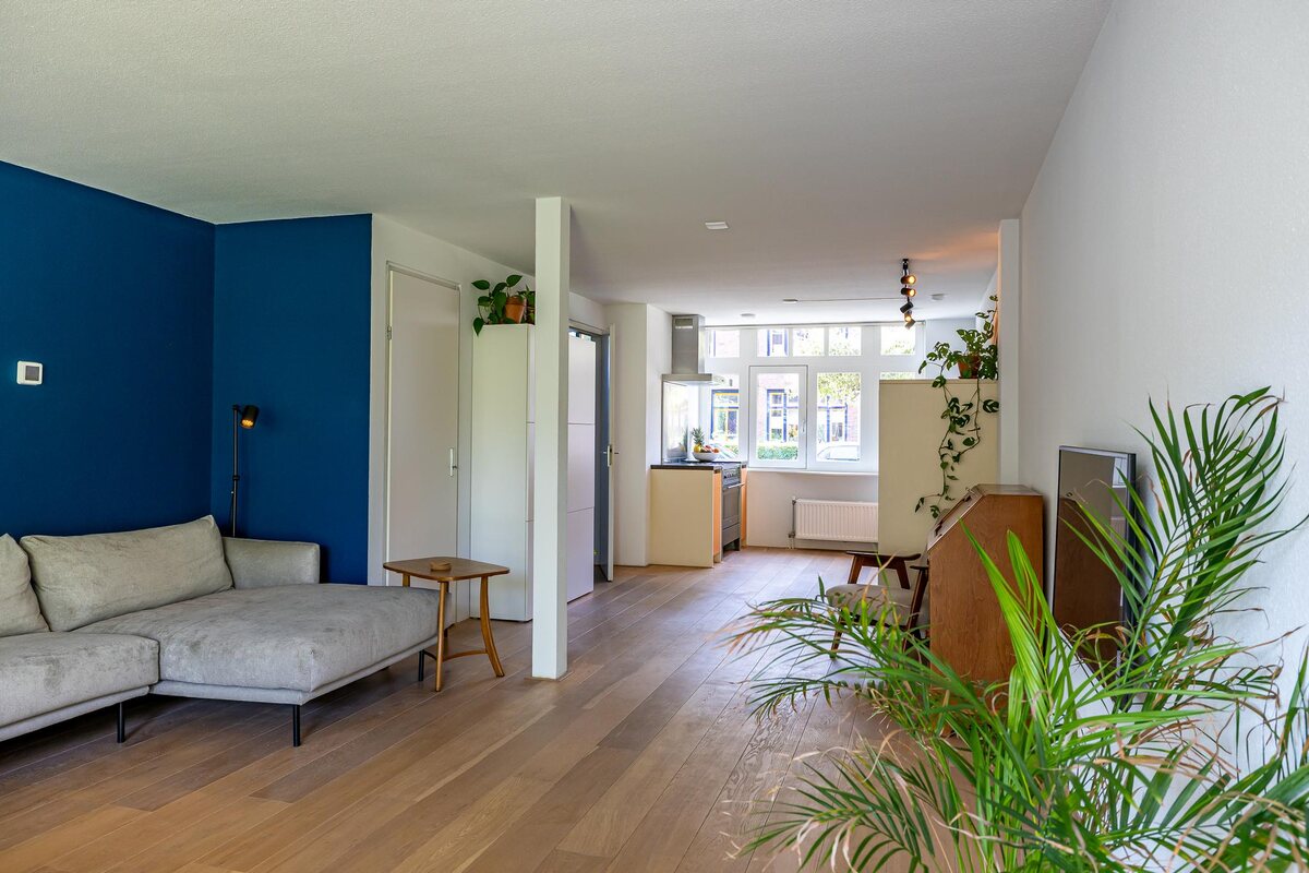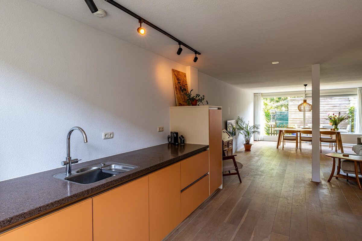 Entree/hal met aan uw linkerhand de meterkast, aan uw linkerhand vindt u de ruime woonkamer met open keuken, de woonkamer is voorzien van een houten vloer welke in 2022 opnieuw is geschuurd en geolied. Middels de schuifpui met veel glas bereikt u eenvoudig de achtertuin. De strakke open keuken is voorzien van diverse inbouwapparatuur zoals een vaatwasser, heetwaterkraan (2022), koelkast/vriezer, een 6-pits gasfornuis met ingebouwde oven en een afzuigkap.