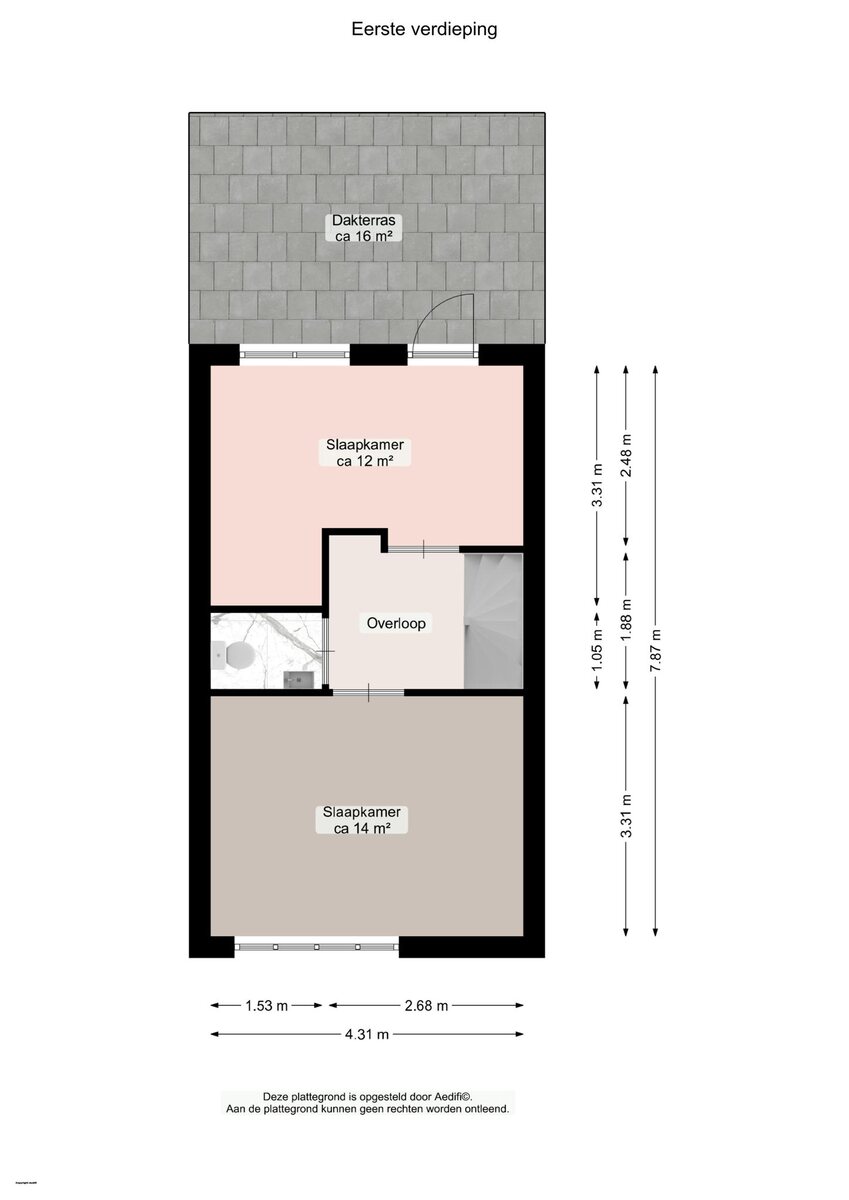 Overloop met toilet en fonteintje. Twee slaapkamers van ca. 12 en 14 m2. De slaapkamer aan de achterzijde heeft tevens toegang tot het dakterras van ca. 16 m2, meer dan voldoende ruimte dus voor een heerlijke loungeset om die lange zomeravonden op door te komen.