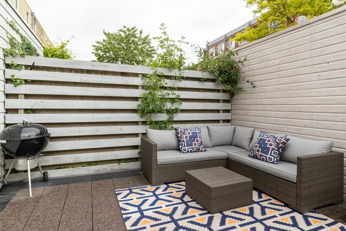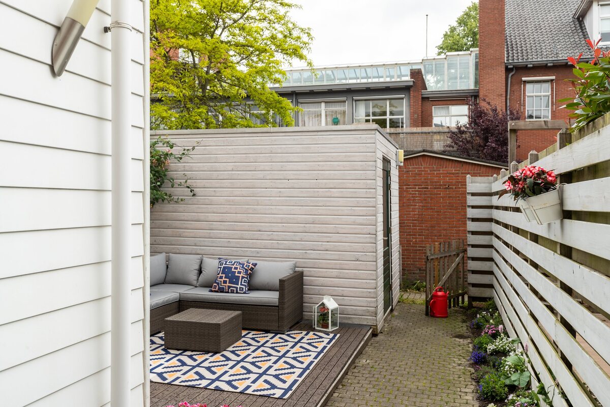 Voortuin en een betegelde stadstuin met terras, ruime berging en een achterom.