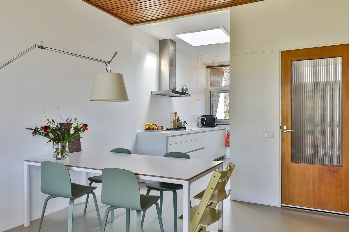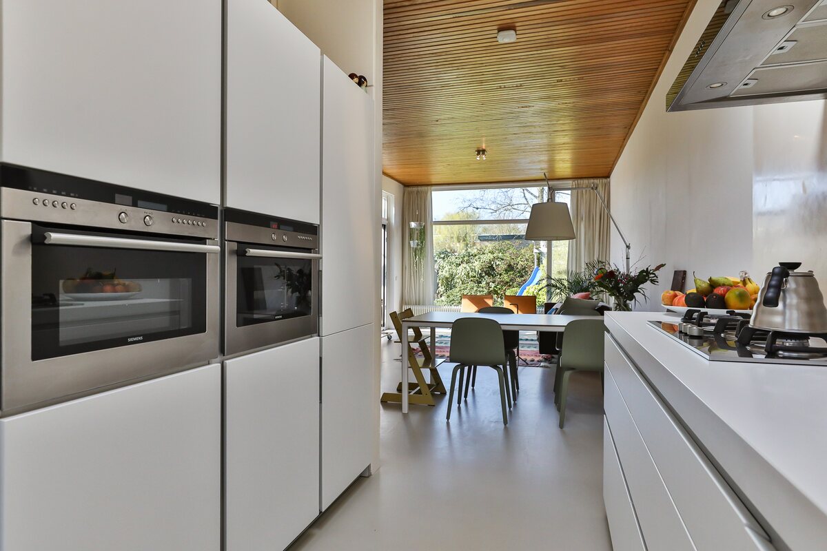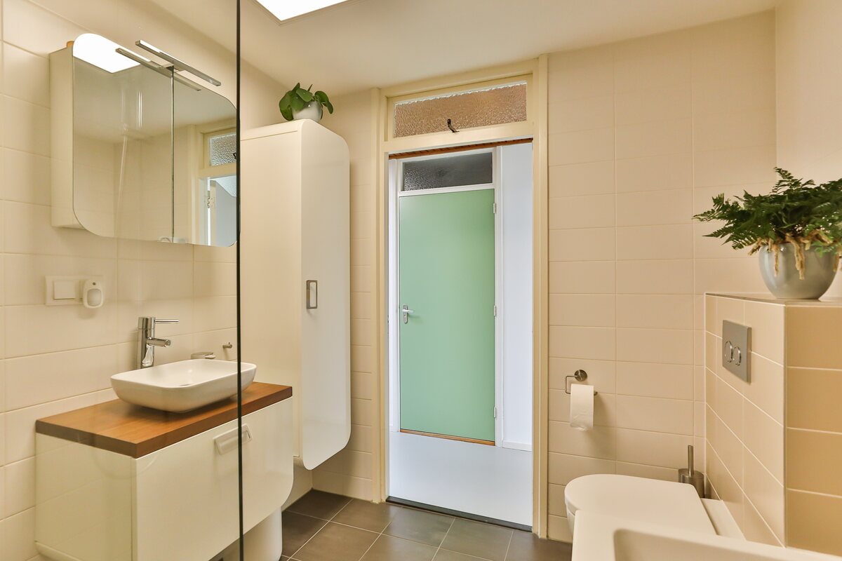 We vervingen het lichtgele originele jaren '60 keukentje van Bruynzeel voor een witte Bulthaup B1 keuken. De oudekeuken hebben we op de dag van de sleuteloverdracht veilig opgeborgen in de garage, vlak achter het huis. Deze oudekeuken doet nu dienst in het souterrain, als bijkeuken – super leuk én handig! In de vergrote badkamer, metvloerverwarming, gebruikten we moderne, liggende (30x15) Mosa tegels, als knipoog naar het trappenhuis. In hettweede (gasten-) toilet hebben we een patroon van de bekende tegels van Kho Liang Ie gebruikt. We zijn trots op degeslaagde mix van oud en modern en we hopen dat de volgende bewoners dat positieve sixties gevoel vast weten tehouden.