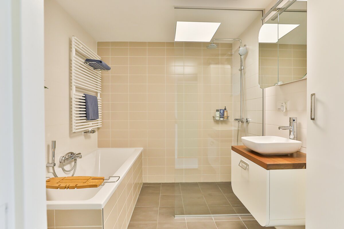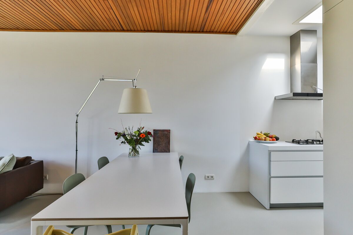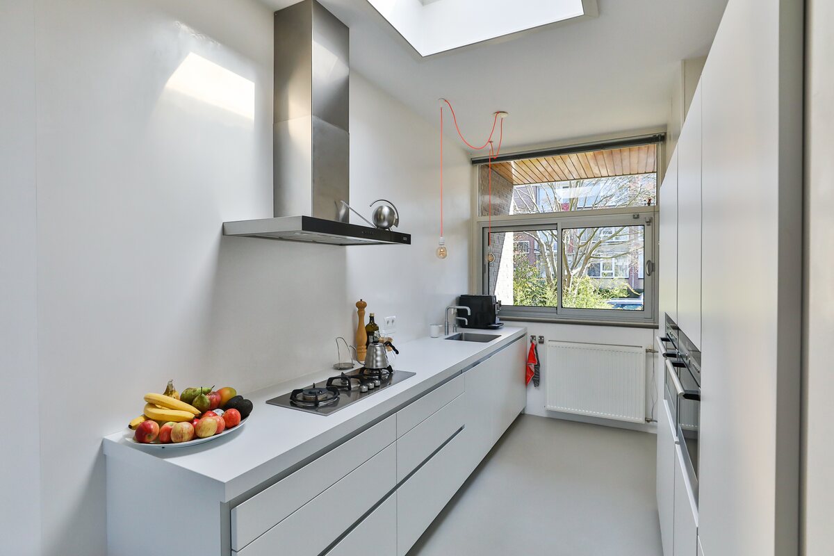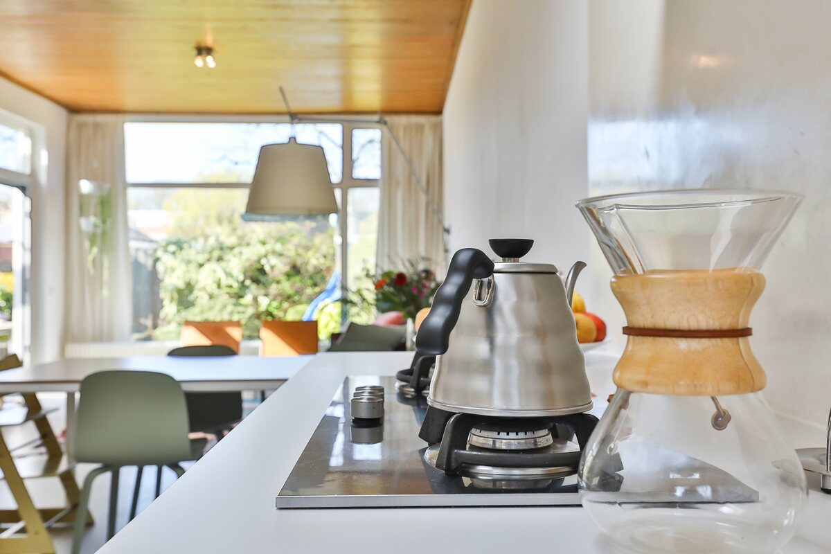 We vervingen het lichtgele originele jaren '60 keukentje van Bruynzeel voor een witte Bulthaup B1 keuken. De oudekeuken hebben we op de dag van de sleuteloverdracht veilig opgeborgen in de garage, vlak achter het huis. Deze oudekeuken doet nu dienst in het souterrain, als bijkeuken – super leuk én handig! In de vergrote badkamer, metvloerverwarming, gebruikten we moderne, liggende (30x15) Mosa tegels, als knipoog naar het trappenhuis. In hettweede (gasten-) toilet hebben we een patroon van de bekende tegels van Kho Liang Ie gebruikt. We zijn trots op degeslaagde mix van oud en modern en we hopen dat de volgende bewoners dat positieve sixties gevoel vast weten tehouden.
