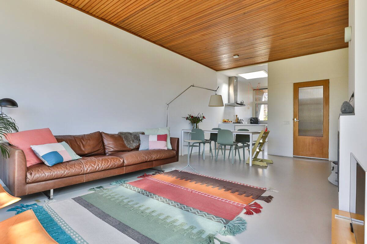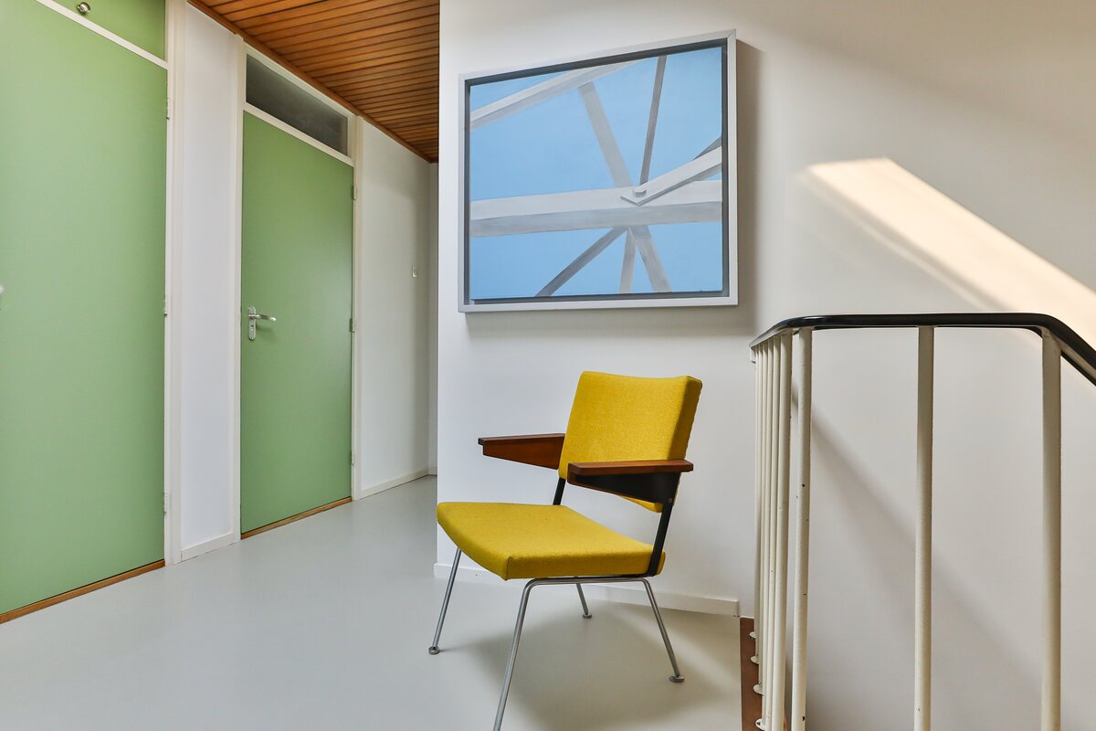 Bij de sleuteloverdracht was het huis nog in oorspronkelijke staat. Bij deverbouwing kozen we ervoor om, zoveel als mogelijk, eer te doen aan de originele kenmerken en details. De enkelglasschuiframen en de schuifdeur naar de veranda, van geanodiseerd aluminium, vervingen we door moderne variantenmet HR++ glas. Dat was een behoorlijke zoektocht, maar mét succes! Doordat we alles strak hebben laten stucen enomdat we kozen voor een lichte marmoleum vloer op elke etage, durfden we het aan om de originele schrootjes in dewoonkamer en de hal te behouden. Mede door het hoge plafond hebben de woonkamer en de entree veel karakter.