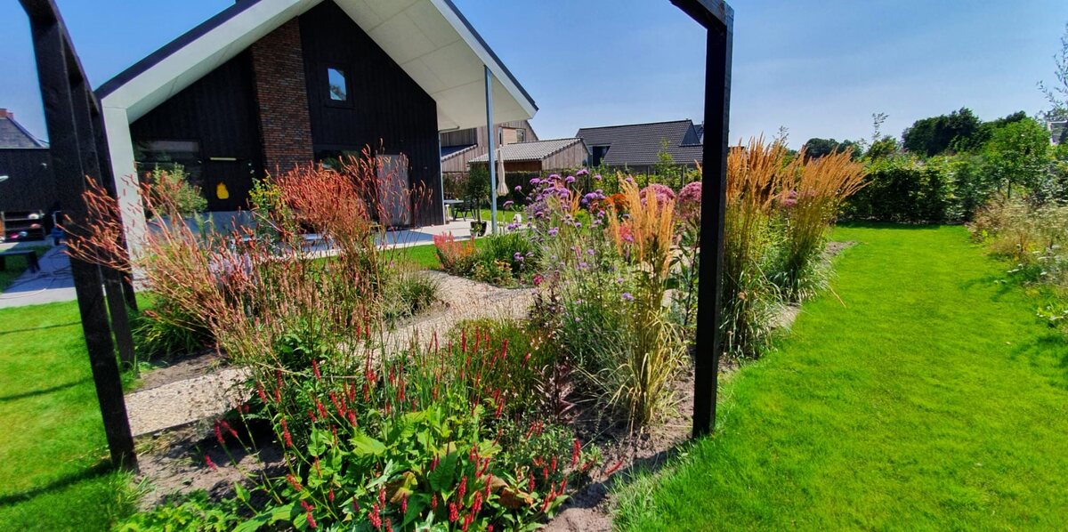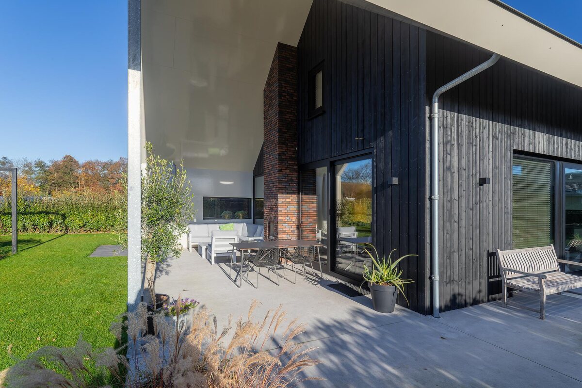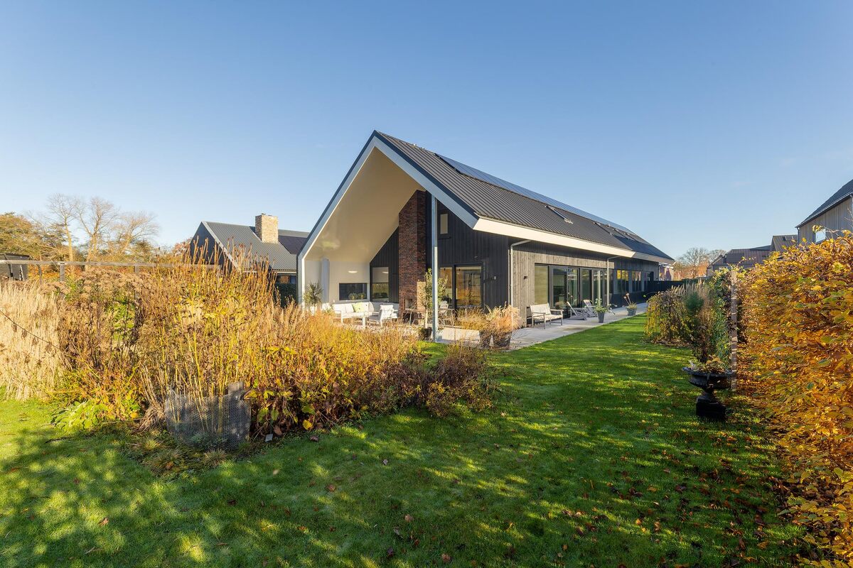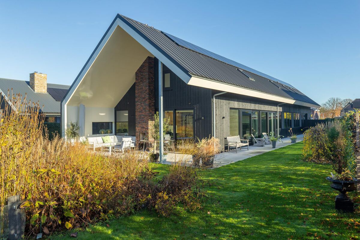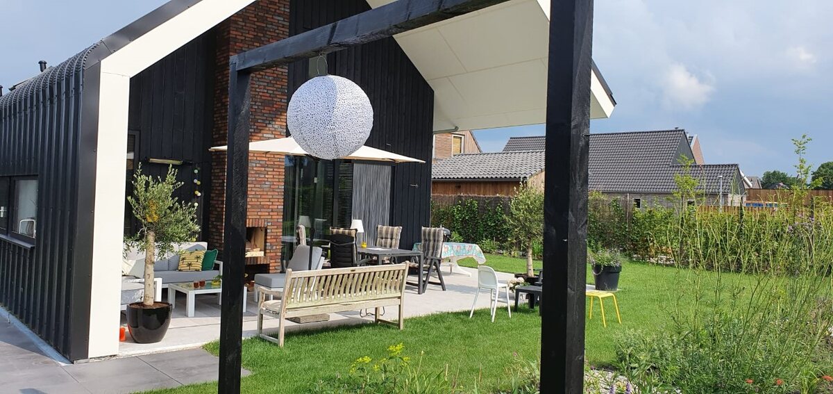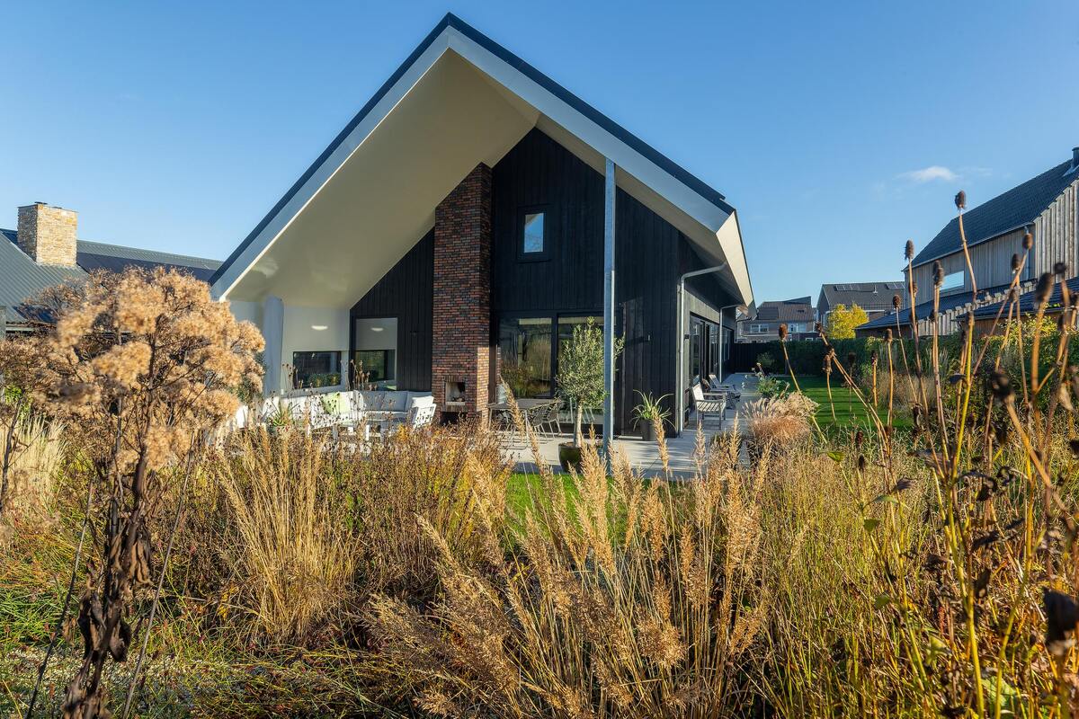 Achter de woonkamergevel ligt een heerlijk overdekt terras (dankzij een enorm overstek) op het zuidwesten met een buitenhaard en zicht op de achtertuin. De achtertuin is ruim, fraai aangelegd en geeft veel gevoel van privacy.Naaste de woning ligt (eveneens onder een fijne overstek) een lang terras aan de keuken.
