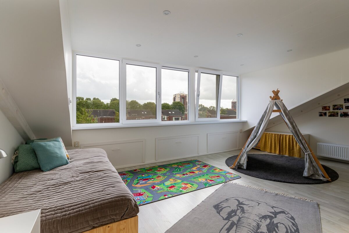 Tweede verdieping: royale multifunctionele zolderverdieping (ca. 38 m2) met een enorme dakkapel (voorzien van elektrische rolluiken), waardoor er meerdere indelingsvarianten zijn. De combinatie van hoogte, een groot raampartij aan de voorzijde geeft een prettige uitstraling aan deze verdieping. Vaste kast met CV ketel, wasmachine aansluiting en zonneboiler. Berging achter de knieschotten.