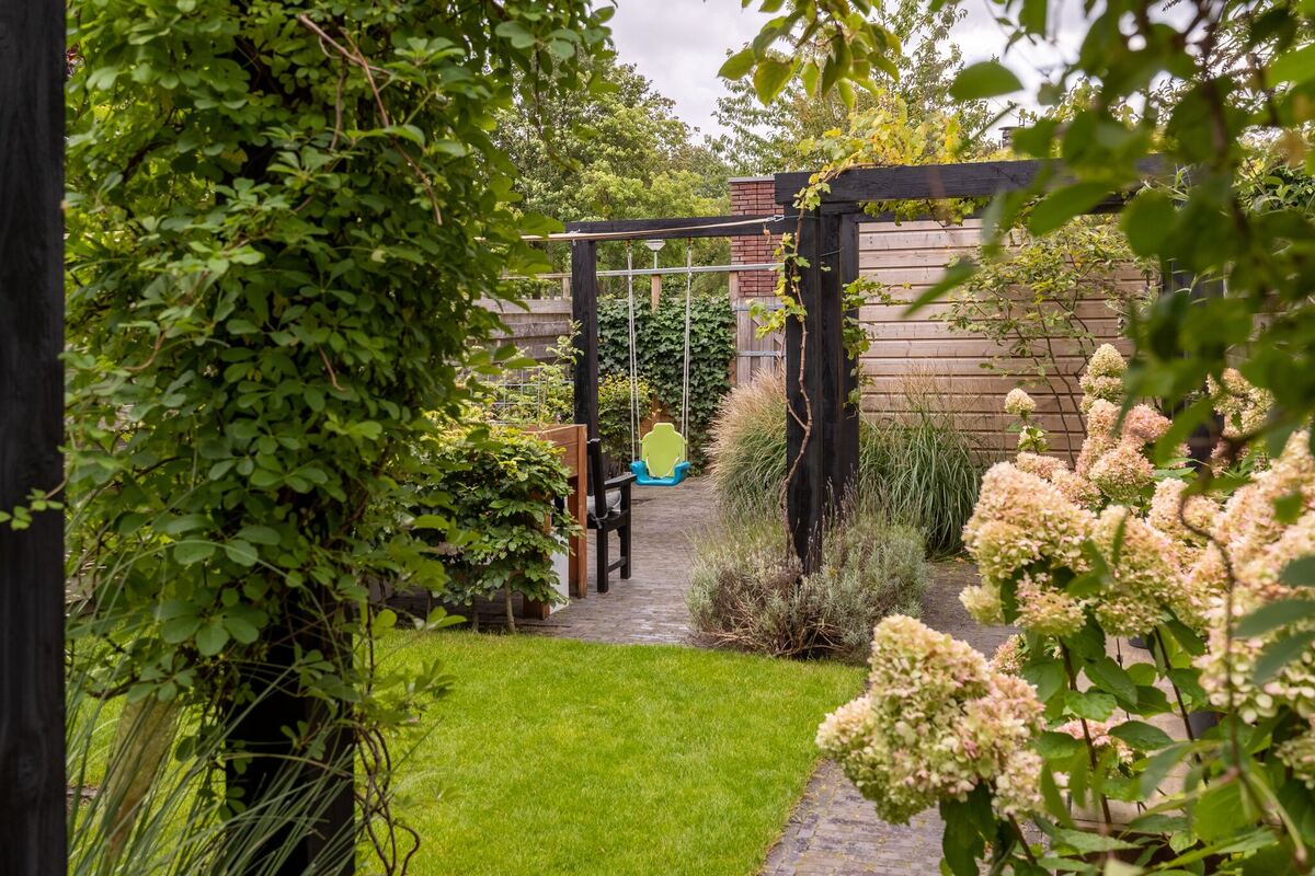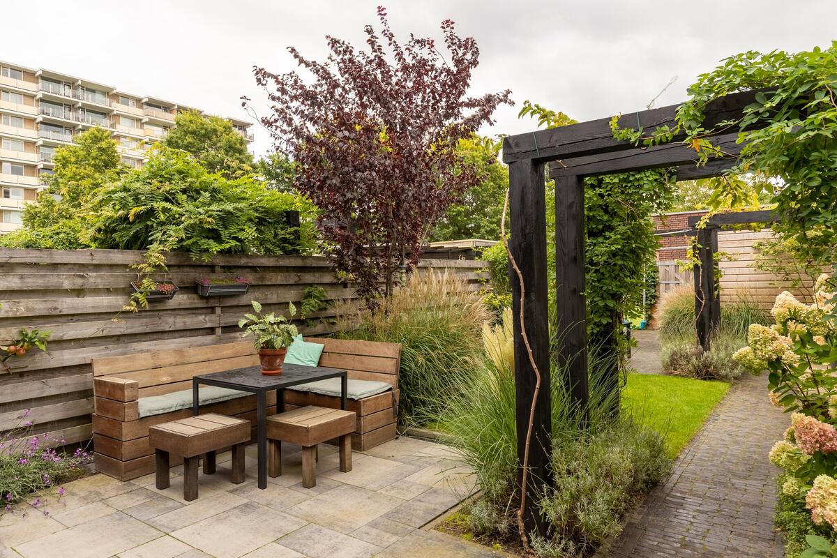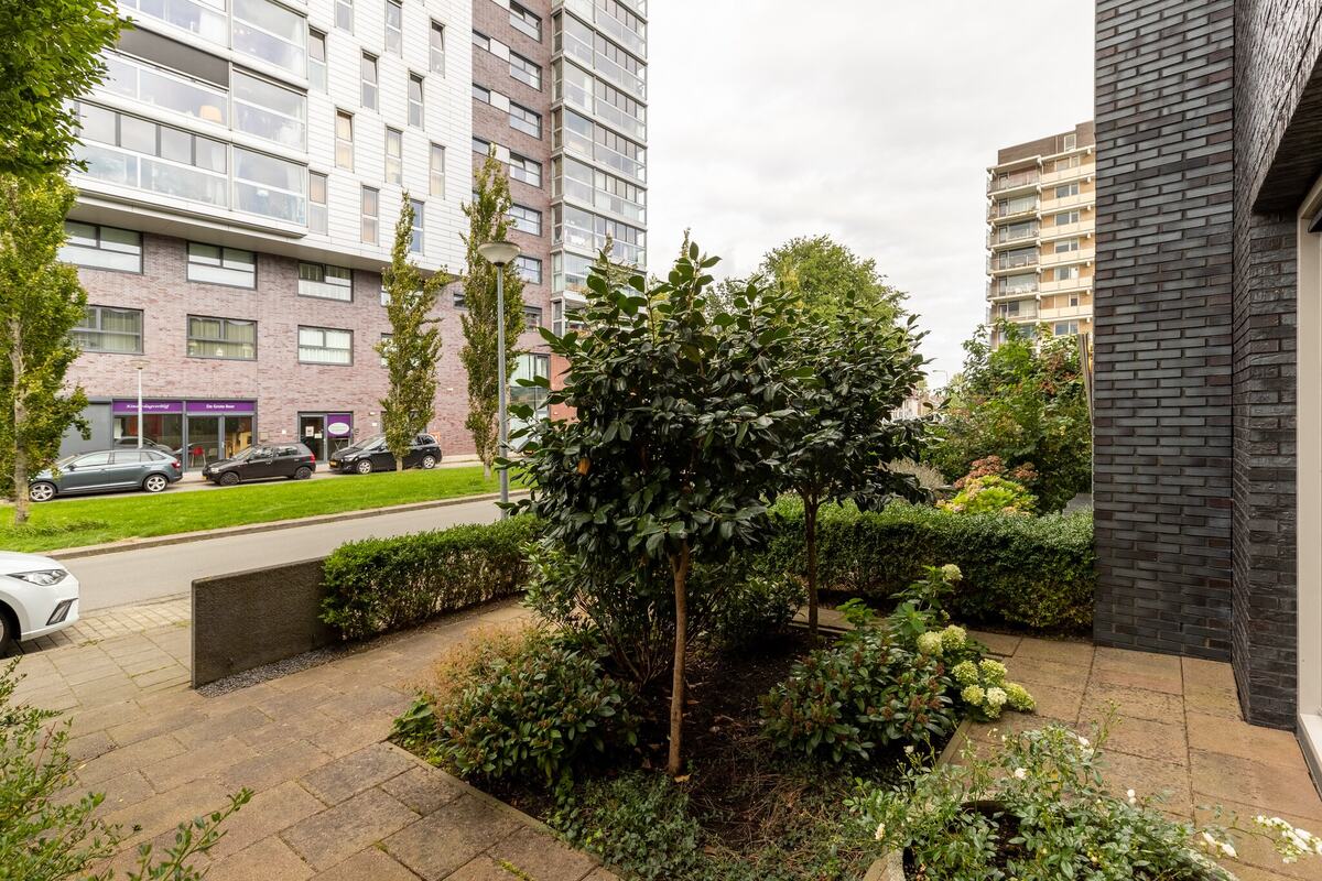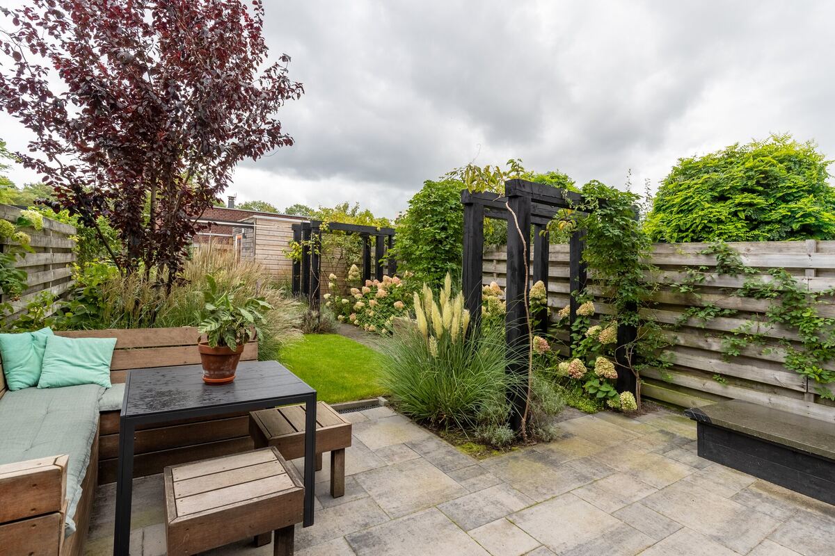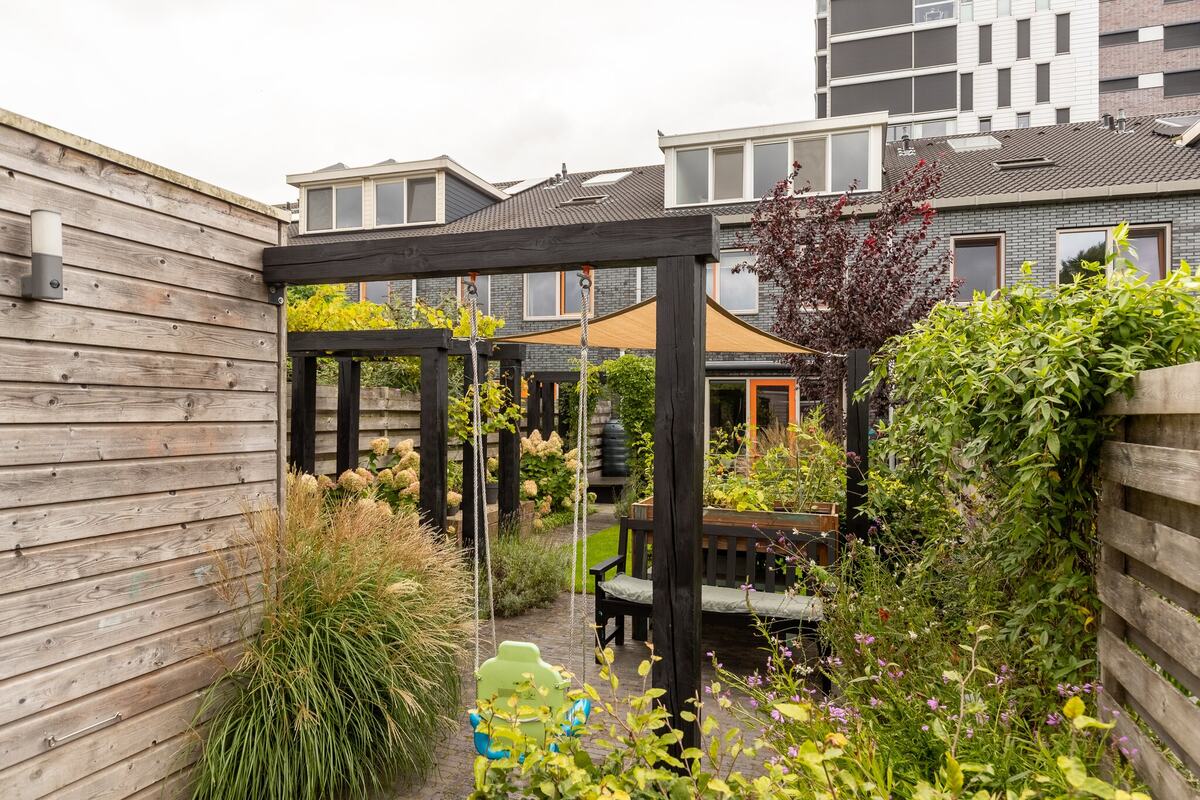 Buiten: Verzorgde, onder architectuur aangelegde diepe (17 m.) tuin op het zuiden en een vrijstaande houten berging. Een over de volledige breedte elektronisch zonnescherm t.p.v. de tuindeuren maakt het plaatje compleet.