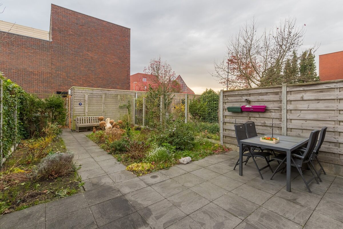 Buiten: Voortuin.Verzorgde en diepe (14 m.) tuin op het zuiden en een vrijstaande houten berging. Deur naar de brandgang.