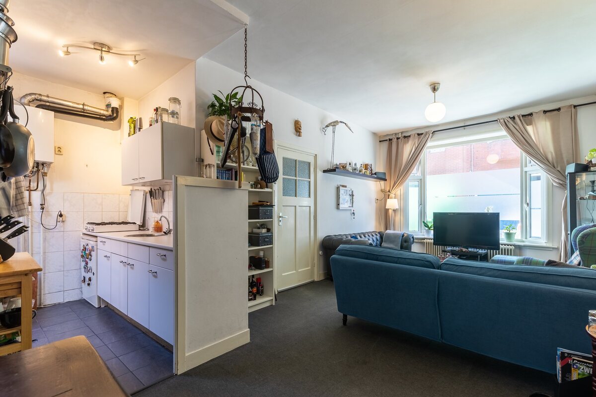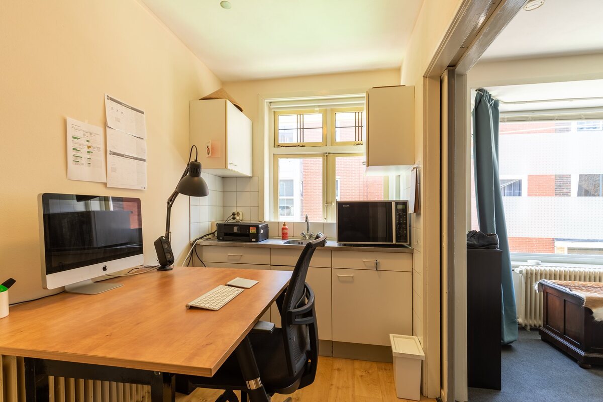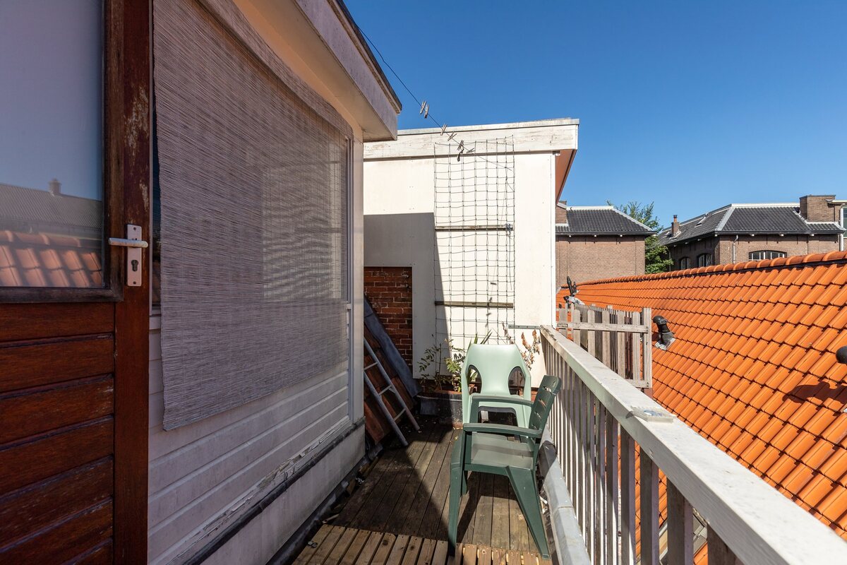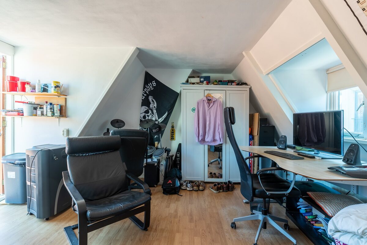 Begane grond: entree/hal, toilet met fonteintje, woonkamer met erker en open keuken, toaal ca. 28 m2, klein binnenplaatsje.Eerste verdieping: overloop met trapkast, woonkamer en suite 18 m2 met erker en keukenblokje. Keukentje is 6 m2 en de kamer 12 m2. Lichte (gezamenlijke) badkamer ca. 5 m2 waarin een douche met scherm, wastafel, tweede toilet en wasmachine-aansluiting, balkon aan achterzijde. Tweede verdieping: zolderkamer ca. 21 m2 met keukenblokje, twee dakkapellen en prachtig uitzicht op de binnenstad vanaf het balkon van 8 m2.