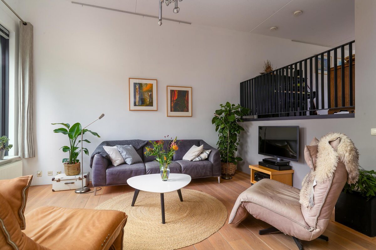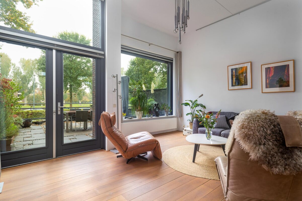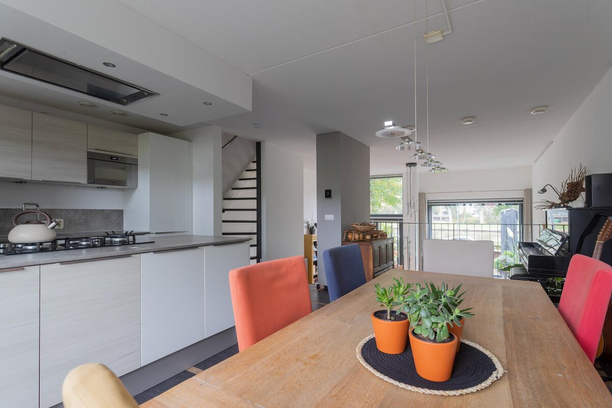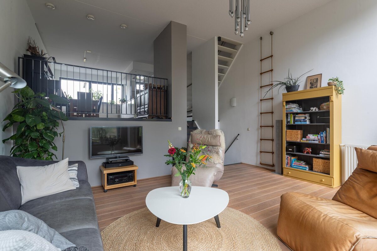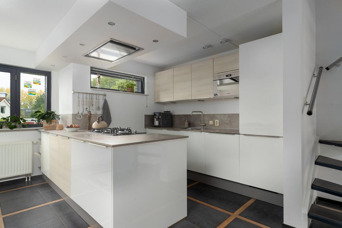 Entree/hal met toilet, deur naar de garage en het basement en trap naar de woonkamer.Unieke woonkamer (ca. 25 m2, plafond op ca. 3,7 meter, grote glaspui op zuid) met erker, openslaande deuren naar de tuin en opstap naar de keuken.Vanuit de woonkamer toegang tot een zonnig terras van ca. 29 m2 aan op het zuid/westen. Heerlijke woonkeuken (ca. 32 m2) met unieke vloer, een balkon naar de woonkamer en een luxe keukeninrichting (2018). Wandmeubel met koelvriescombi, magnetron en een vaatwasser. Kookeiland met gaskookplaat, multifunctionele oven en een op maat gemaakte koof met afzuiginstallatie.