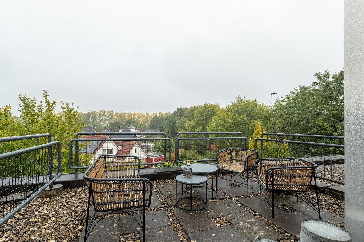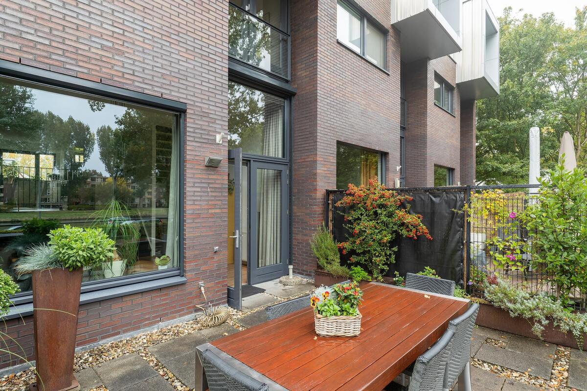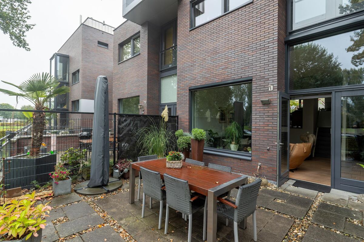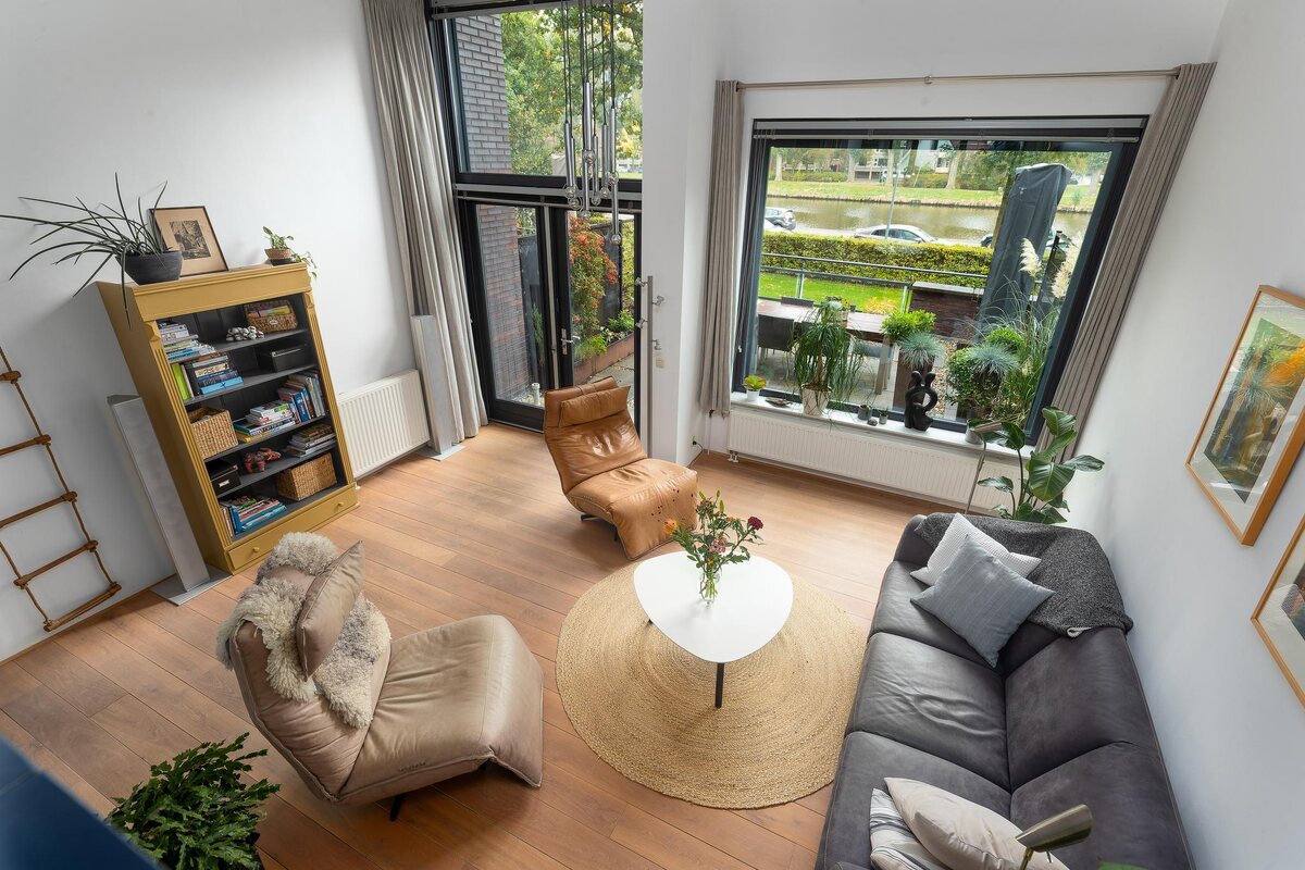 Entree/hal met toilet, deur naar de garage en het basement en trap naar de woonkamer.Unieke woonkamer (ca. 25 m2, plafond op ca. 3,7 meter, grote glaspui op zuid) met erker, openslaande deuren naar de tuin en opstap naar de keuken.Vanuit de woonkamer toegang tot een zonnig terras van ca. 29 m2 aan op het zuid/westen. Heerlijke woonkeuken (ca. 32 m2) met unieke vloer, een balkon naar de woonkamer en een luxe keukeninrichting (2018). Wandmeubel met koelvriescombi, magnetron en een vaatwasser. Kookeiland met gaskookplaat, multifunctionele oven en een op maat gemaakte koof met afzuiginstallatie.