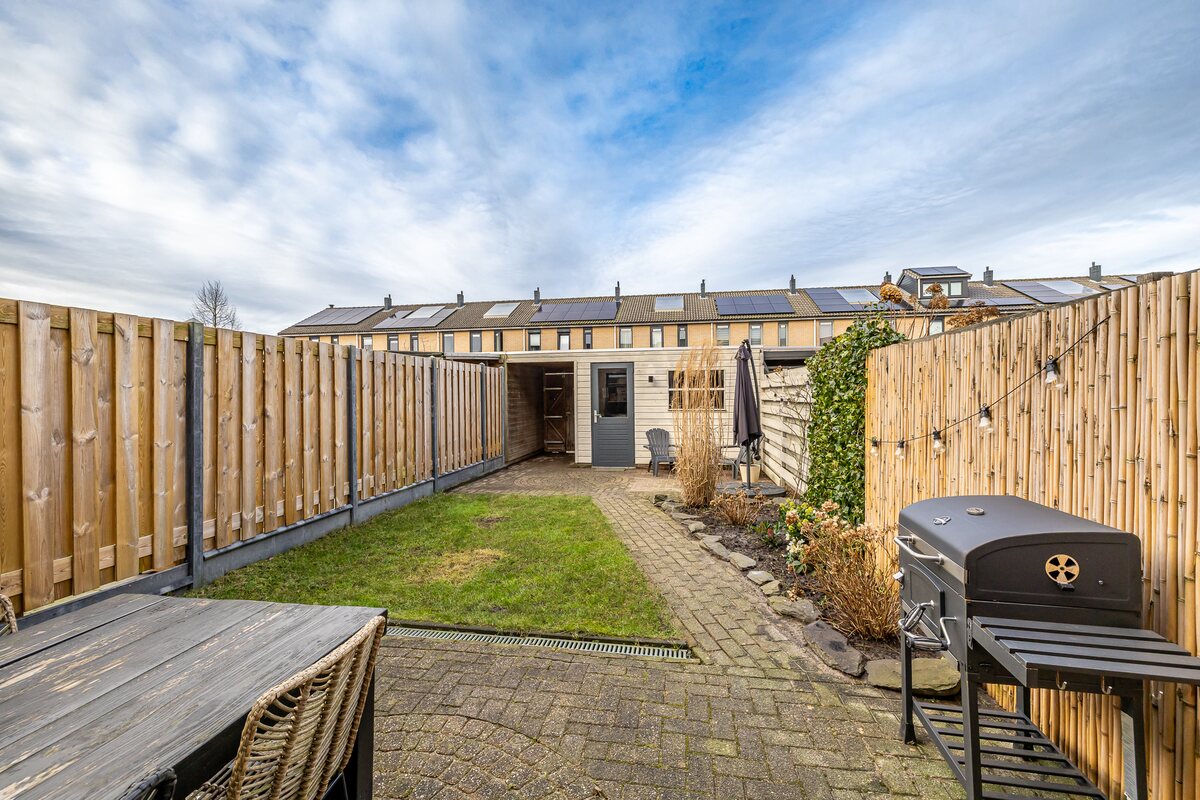 Voortuin en een heerlijk diepe en verzorgde achtertuin: de perfecte plek waar je kunt genieten van de zon en de frisse lucht en je in een rustige omgeving heerlijk kunt ontspannen. Ruime houten berging (ca 11 m²) met overkapping en achterom naar de brandgang.