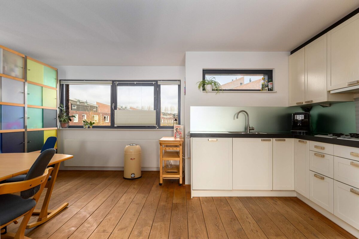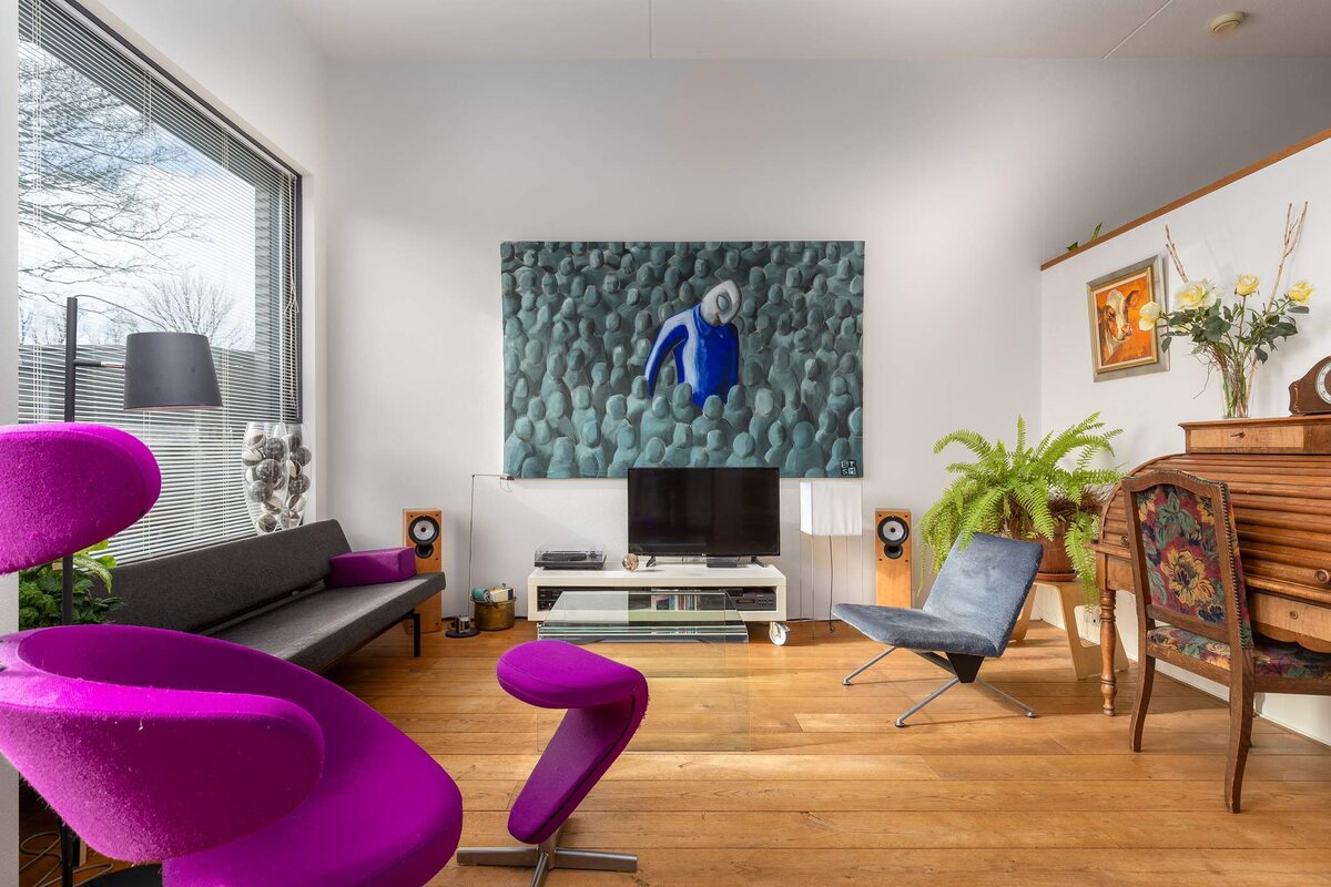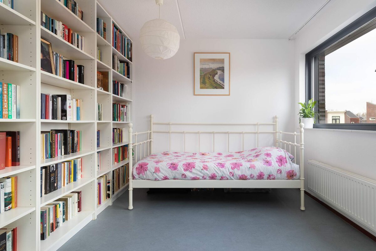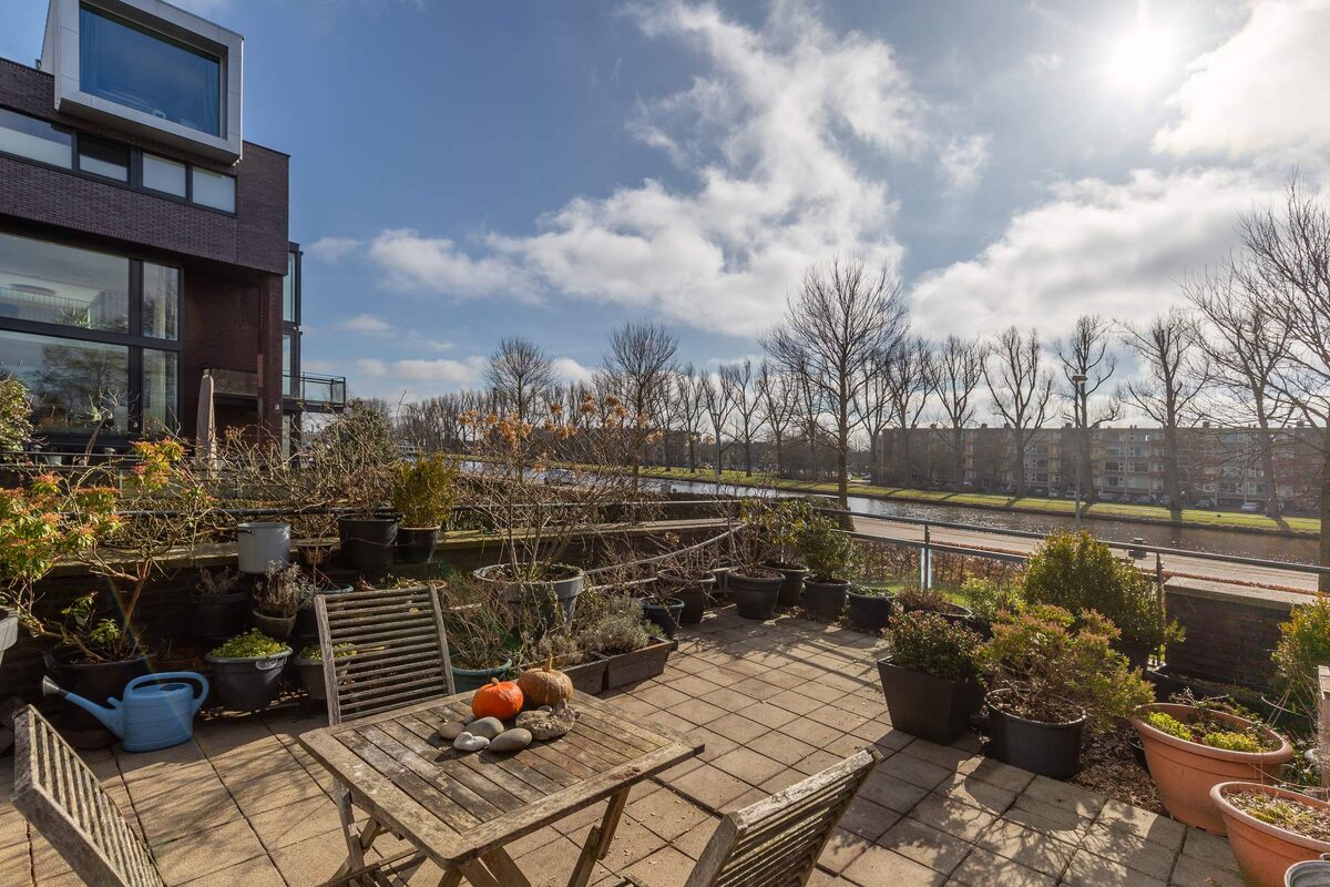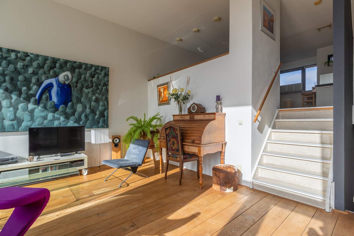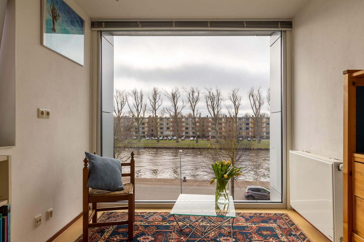 Daarnaast vielen we voor het huis zelf. Het is geen alledaags huis, veel lichtinval, hoge plafonds in de woonkamer, met het kanaal als "kijkwater". Vanwege de ligging is het in de winter en het voorjaar snel goed toeven. Zomers kan het warm worden, maar dan biedt het zonnescherm verkoeling.