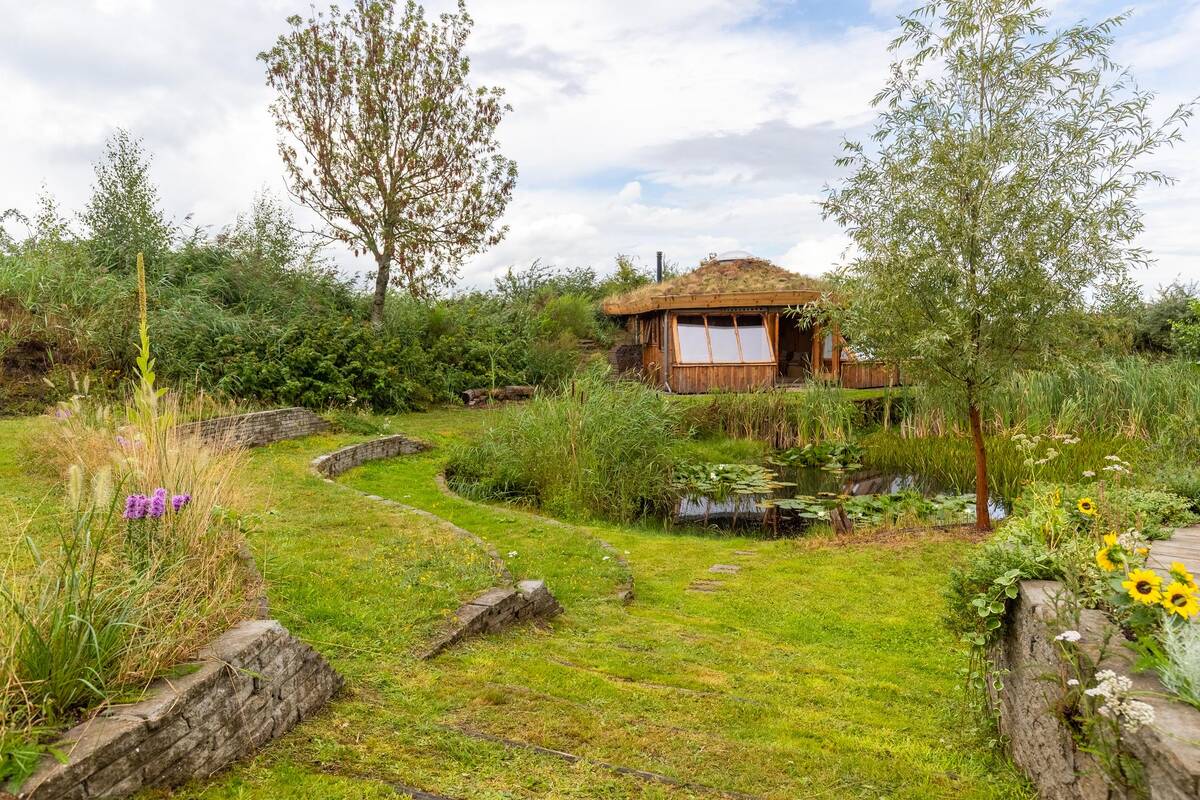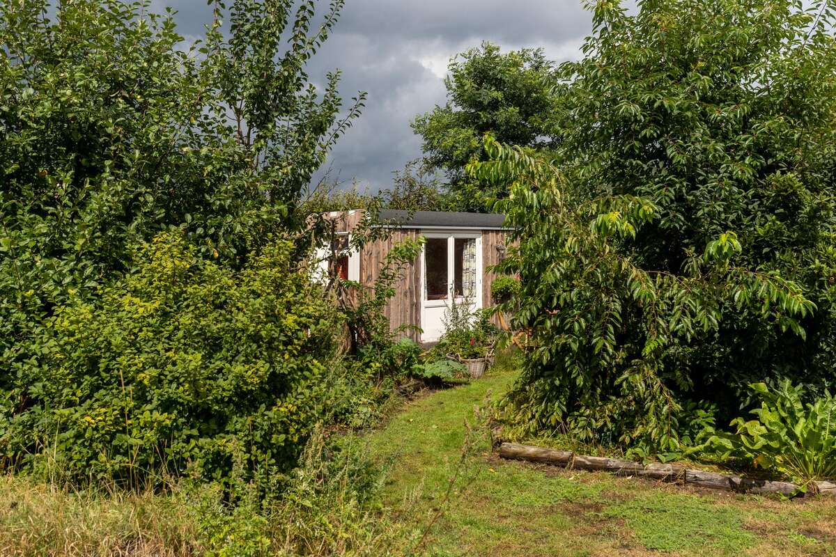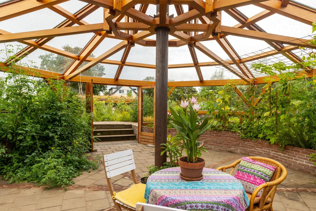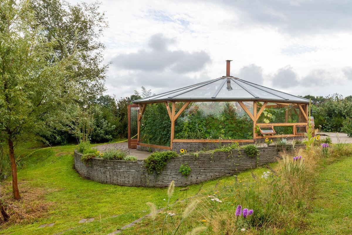- Ecohuis: (ca. 38 m2) opgetrokken uit fraaie sporenconstructie met leem, oven, keukentje, uniek handgesneden kozijnwerk. Hoog plafond met dakkoepel. Water en elektra voorbereiding is aanwezig. Permacultuur systeemtank aanwezig. Aangebouwde badkamer (moet nog worden geïnstalleerd). Zicht op de tuin en vijver.- Kas: (ca. 25 m2) met robuuste houtconstructie (red ceder), volledig voorzien van (beveiligd) dubbel glas, pantry en een ruime aangebouwde schuur met water en elektra- pipowagen (ca. 8 m2) met vast bed, pantry, natuurtoilet en dito douche. Elektriciteit en water.- verlaagd en gemetseld buitenkookterras (ca. 30 m2) met balkenconstructie en originele pizzaoven.