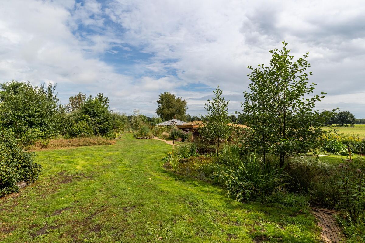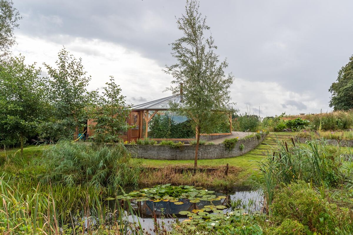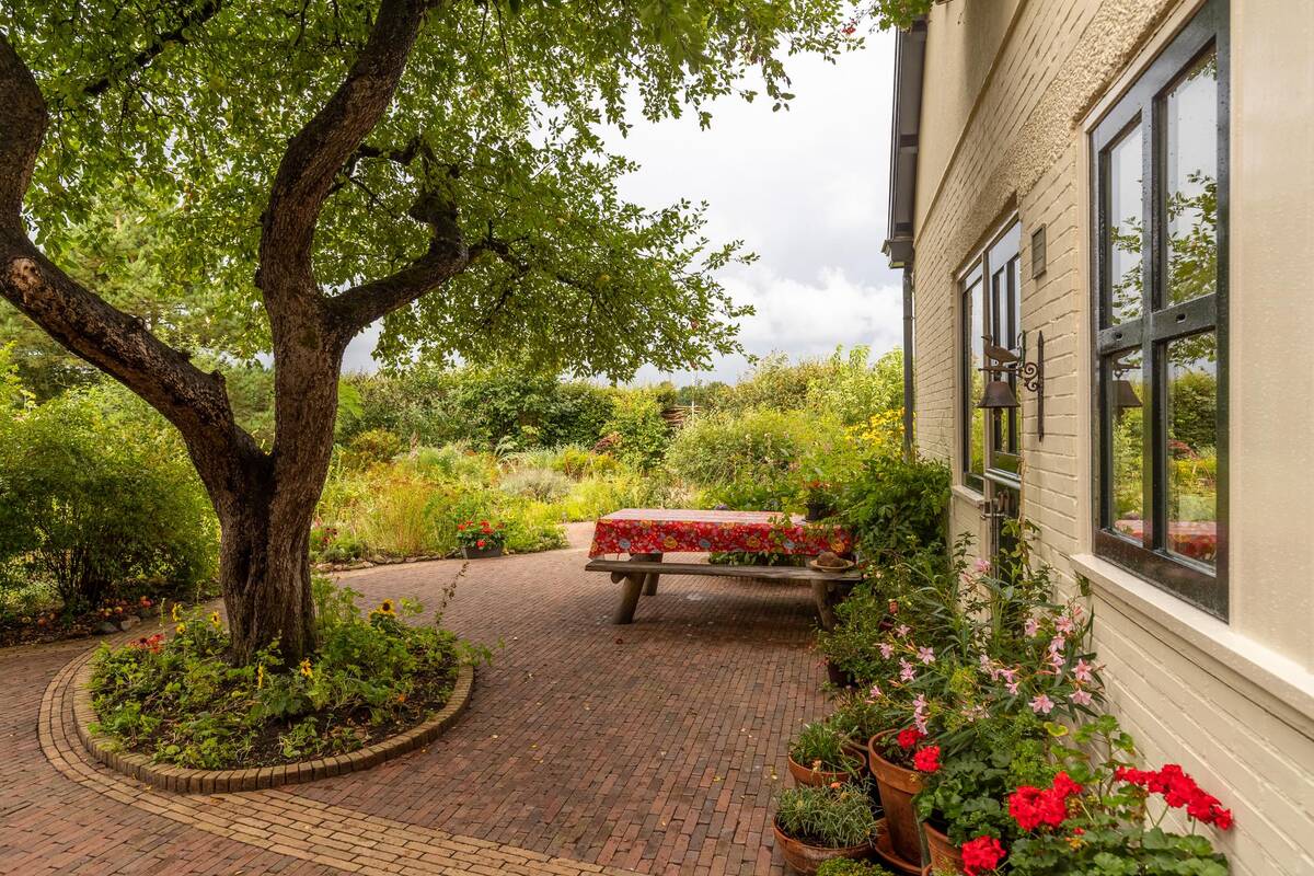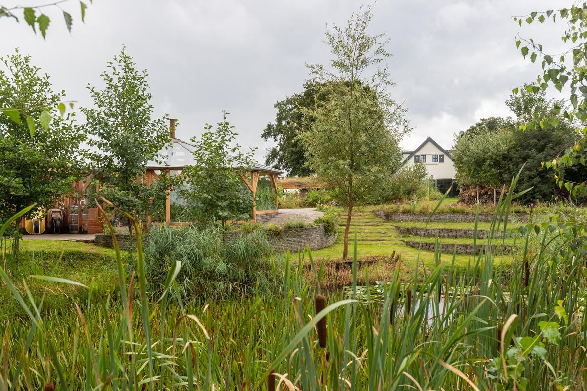 Rondom gelegen met terrassen, natuurvijver, boomgaard (diverse fruitbomen), borders, gazon en een fraai talud.