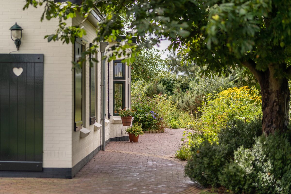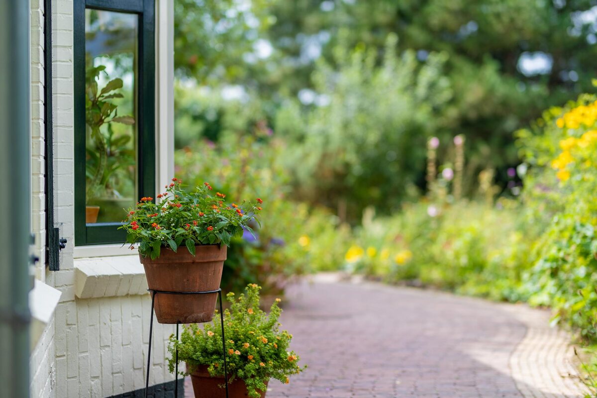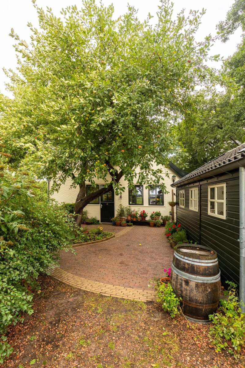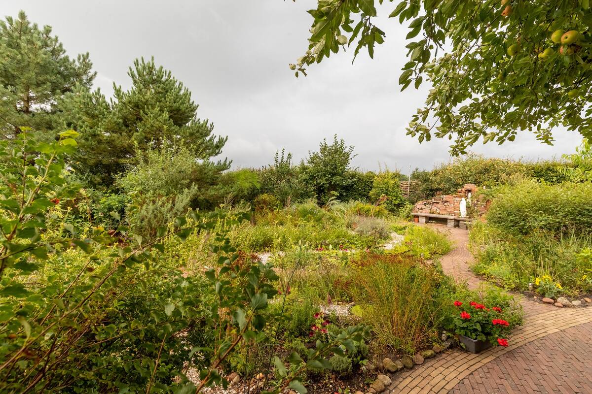 Rondom gelegen met terrassen, natuurvijver, boomgaard (diverse fruitbomen), borders, gazon en een fraai talud.