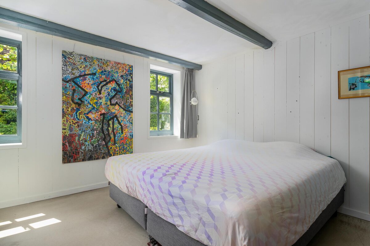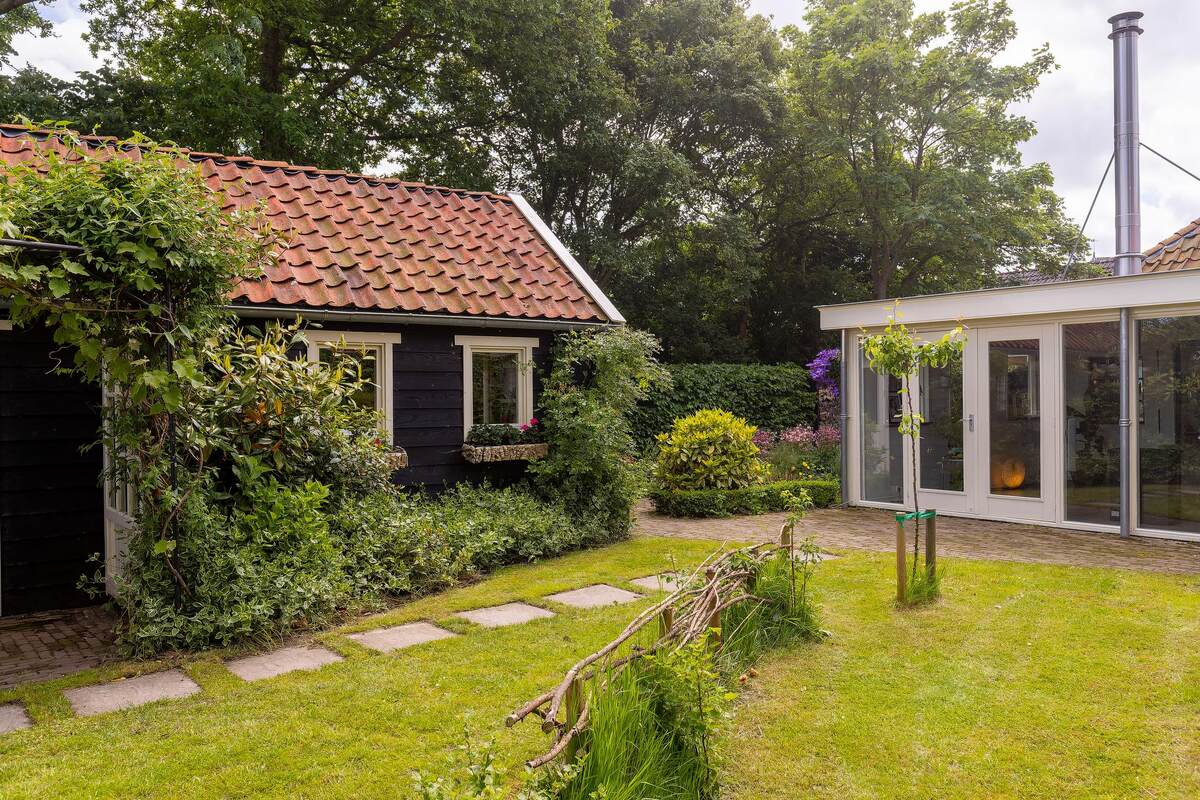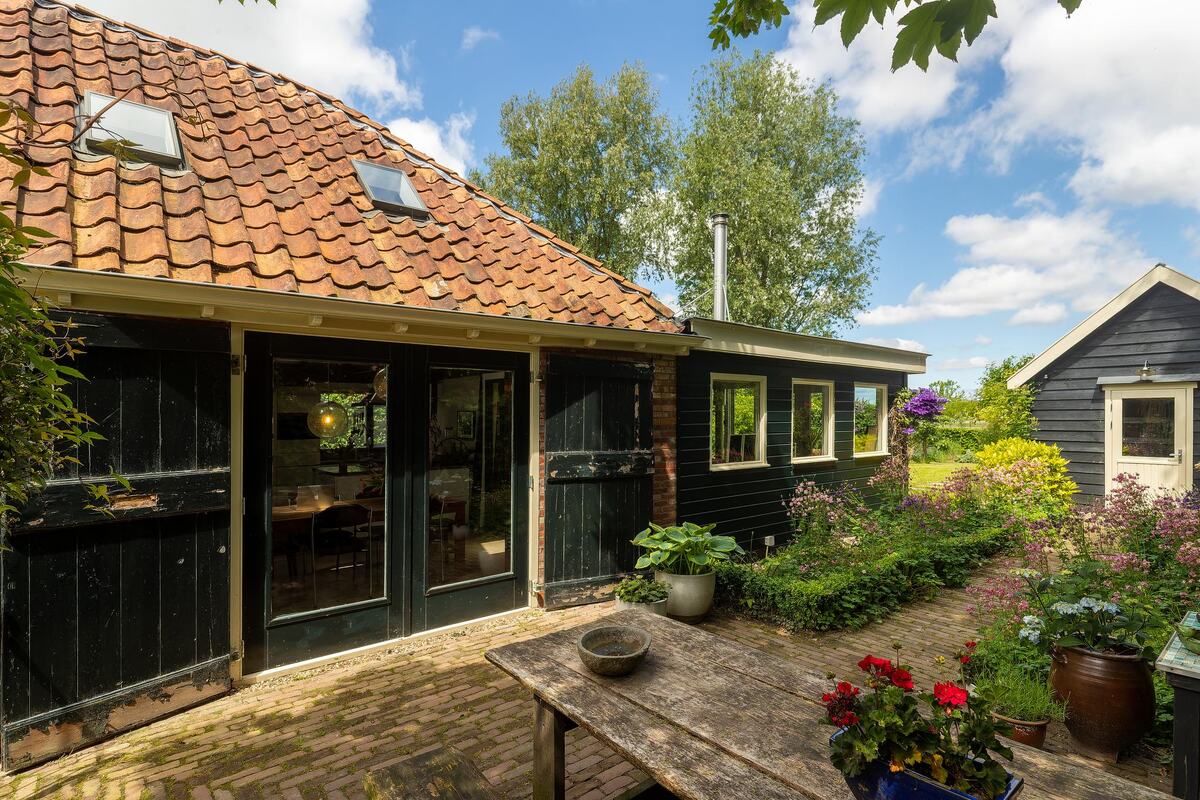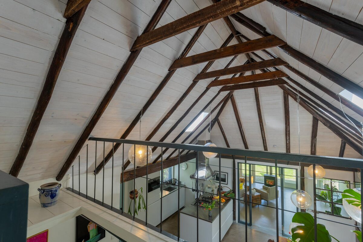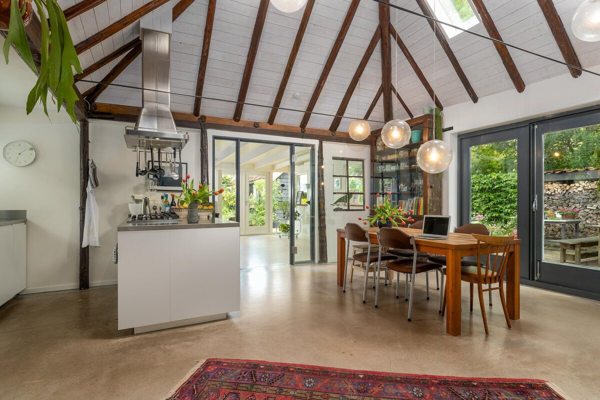 Hal/entree via de zijgevel.Unieke en riante woonkeuken (ca. 38 m2, vloerverwarming) in de voormalig deel van het huis, met industriële (gecoate) betonvloer, openslaande deuren naar de zijtuin en zicht op de prachtige sporenkap met dakbeschot. De keuken is verder voorzien van een kookeiland en wandmeubel met alle gemakken: oven, koelvriescombi en gaskookplaat met afzuigkap. Let op: deze geweldige hoge ruimte vormt het hart van de woning met toegang tot een mezzanine met een werk-, slaap- of speelvertrek en toilet.Doorloop middels fraaie glazen deur naar de woonkamer (ca. 31 m2) in de achteruitbouw welke is voorzien van een fraai balkenplafond, een houtkachel met nieuwe schoorsteen en zicht op de achtertuin en achtergelegen landerijen.Vanuit de keuken is een achterhal bereikbaar met toegang tot twee slaapkamers en de badkamer.Slaapkamer 1 (ca. 16,5 m2) met vaste kastenwand en sfeervolle wandbekleding.Slaapkamer 2 (ca. 9 m2) met dakraam.Moderne badkamer (ca. 7 m2) met ligbad, douche, wastafelmeubel, tweede toilet en vaste (laden)kast met wasmachine aansluiting. Verdieping: bereikbaar via open trap en een klein inpandig balkon.Slaapkamer 3 (ca. 10 m2) met dakraam.