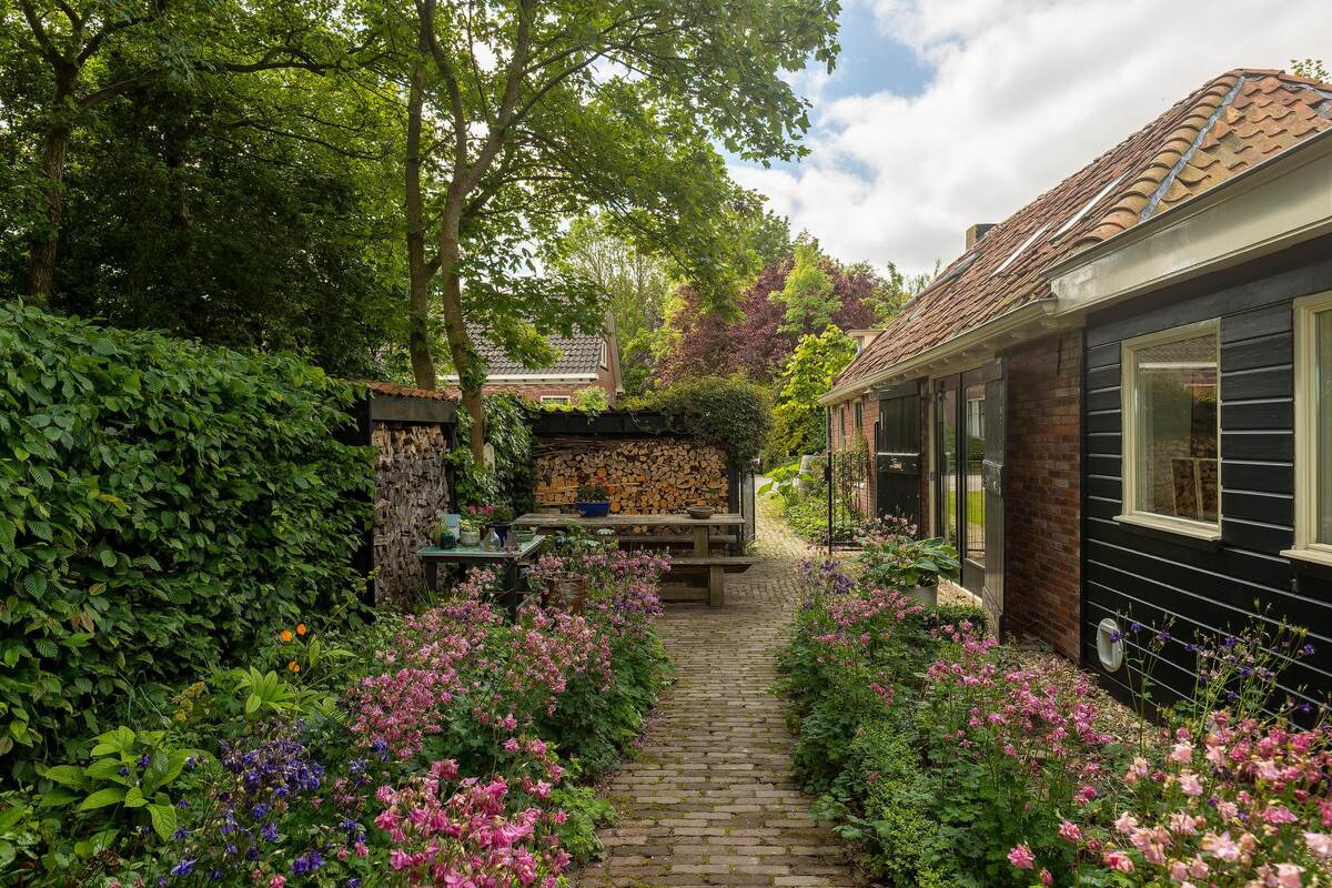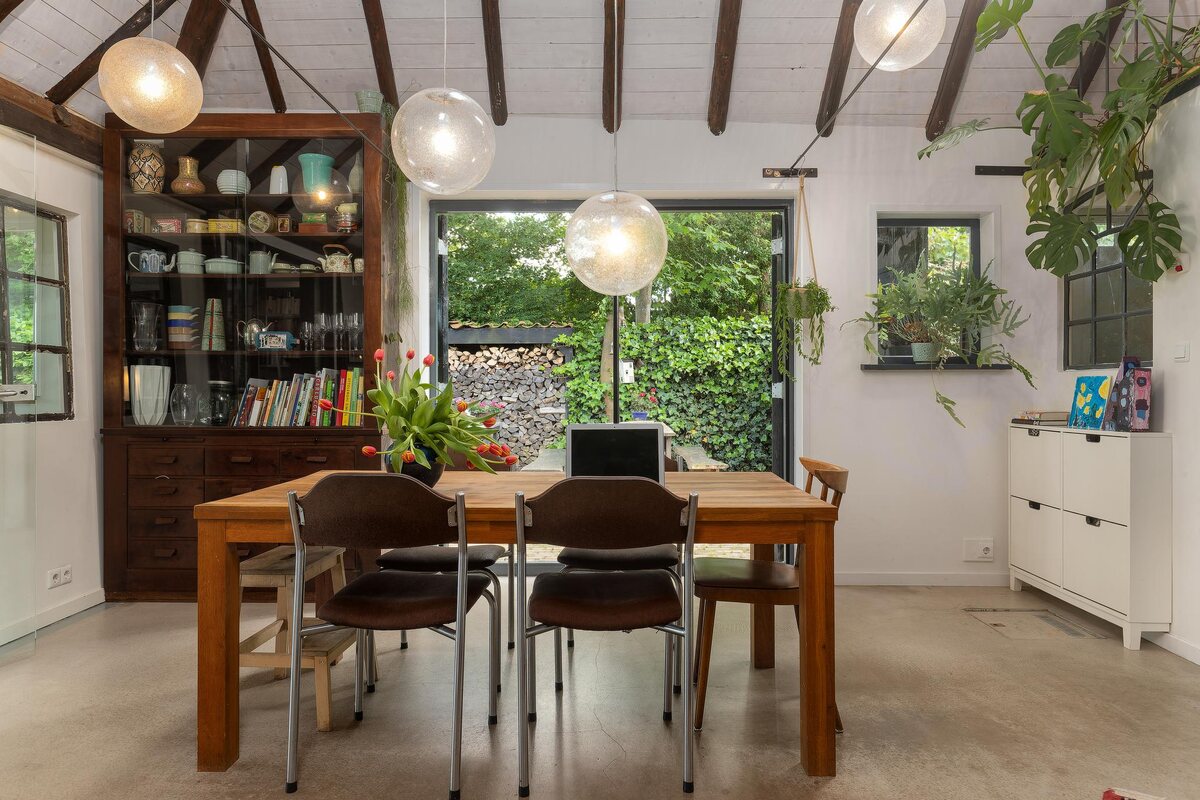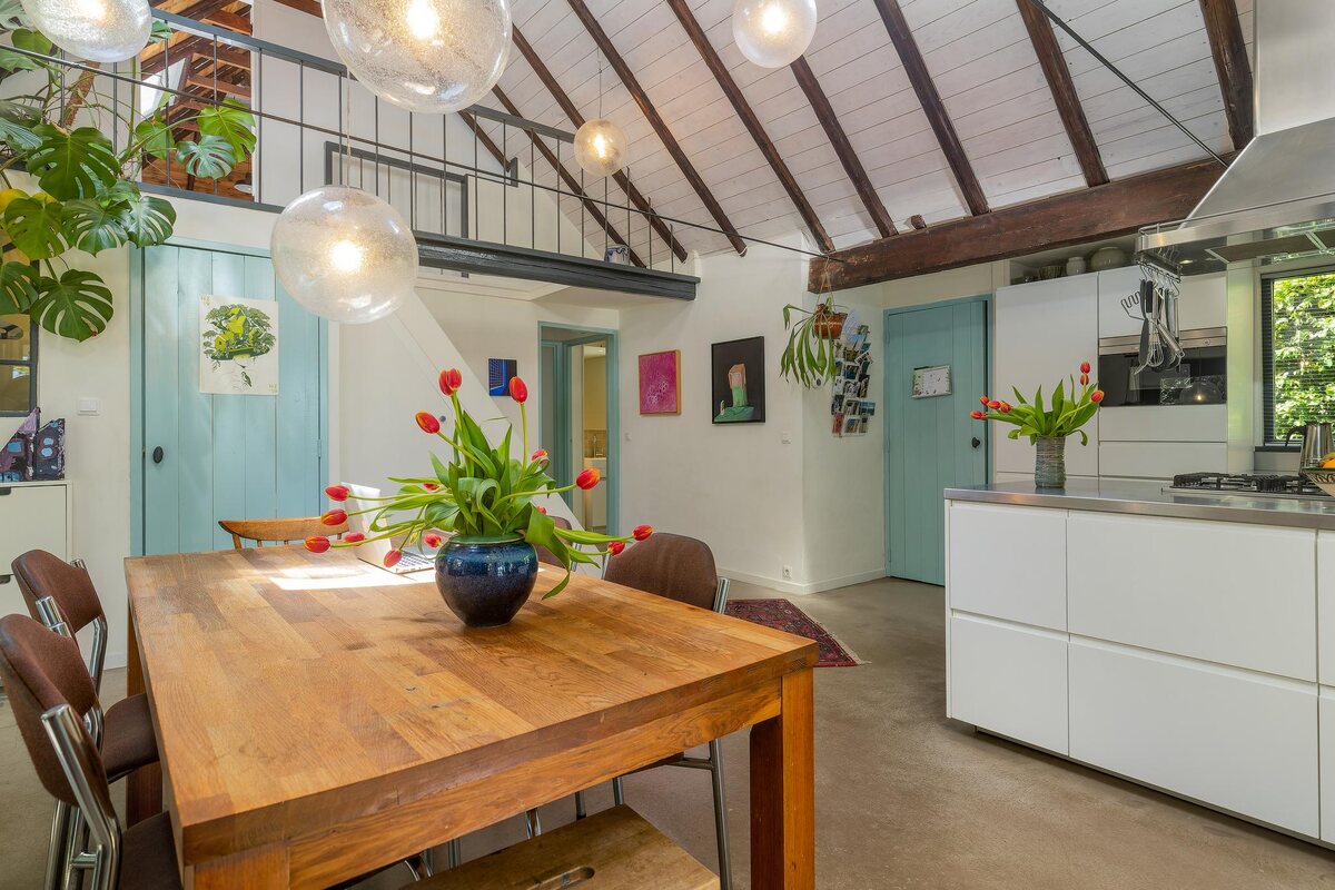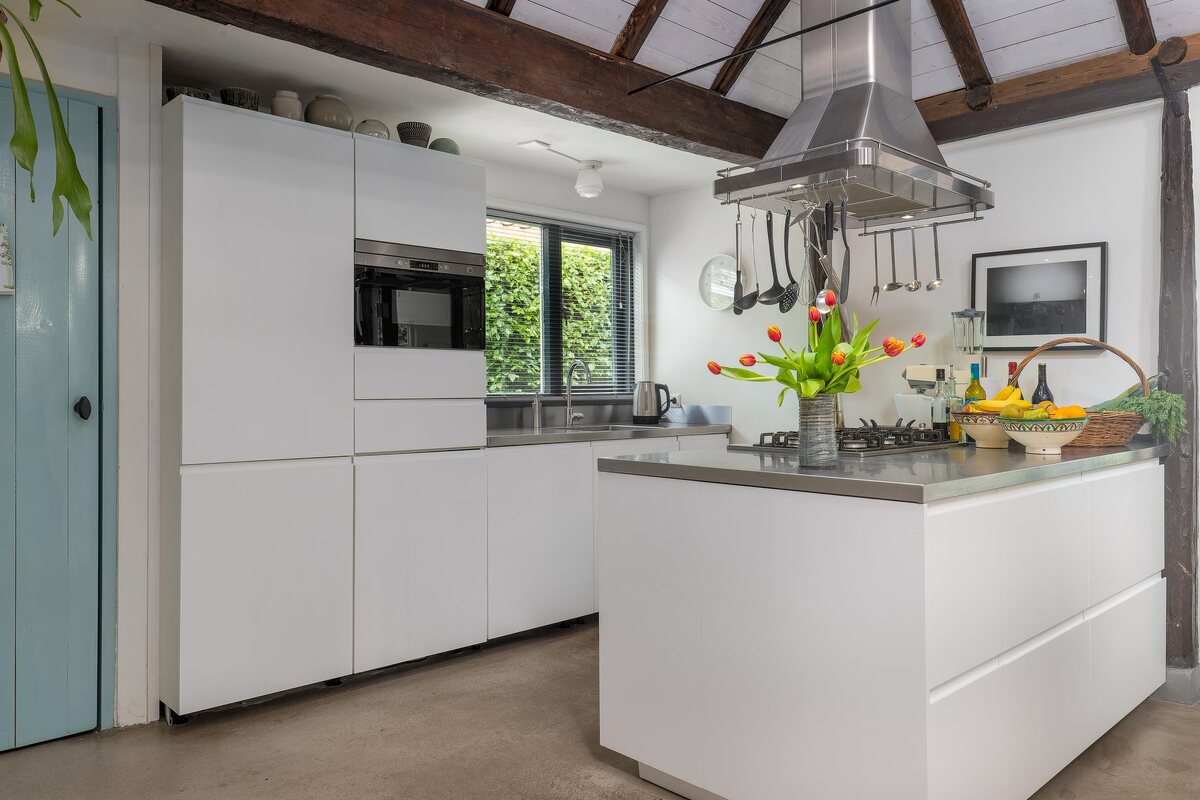 Hal/entree via de zijgevel.Unieke en riante woonkeuken (ca. 38 m2, vloerverwarming) in de voormalig deel van het huis, met industriële (gecoate) betonvloer, openslaande deuren naar de zijtuin en zicht op de prachtige sporenkap met dakbeschot. De keuken is verder voorzien van een kookeiland en wandmeubel met alle gemakken: oven, koelvriescombi en gaskookplaat met afzuigkap. Let op: deze geweldige hoge ruimte vormt het hart van de woning met toegang tot een mezzanine met een werk-, slaap- of speelvertrek en toilet.Doorloop middels fraaie glazen deur naar de woonkamer (ca. 31 m2) in de achteruitbouw welke is voorzien van een fraai balkenplafond, een houtkachel met nieuwe schoorsteen en zicht op de achtertuin en achtergelegen landerijen.Vanuit de keuken is een achterhal bereikbaar met toegang tot twee slaapkamers en de badkamer.Slaapkamer 1 (ca. 16,5 m2) met vaste kastenwand en sfeervolle wandbekleding.Slaapkamer 2 (ca. 9 m2) met dakraam.Moderne badkamer (ca. 7 m2) met ligbad, douche, wastafelmeubel, tweede toilet en vaste (laden)kast met wasmachine aansluiting. Verdieping: bereikbaar via open trap en een klein inpandig balkon.Slaapkamer 3 (ca. 10 m2) met dakraam.